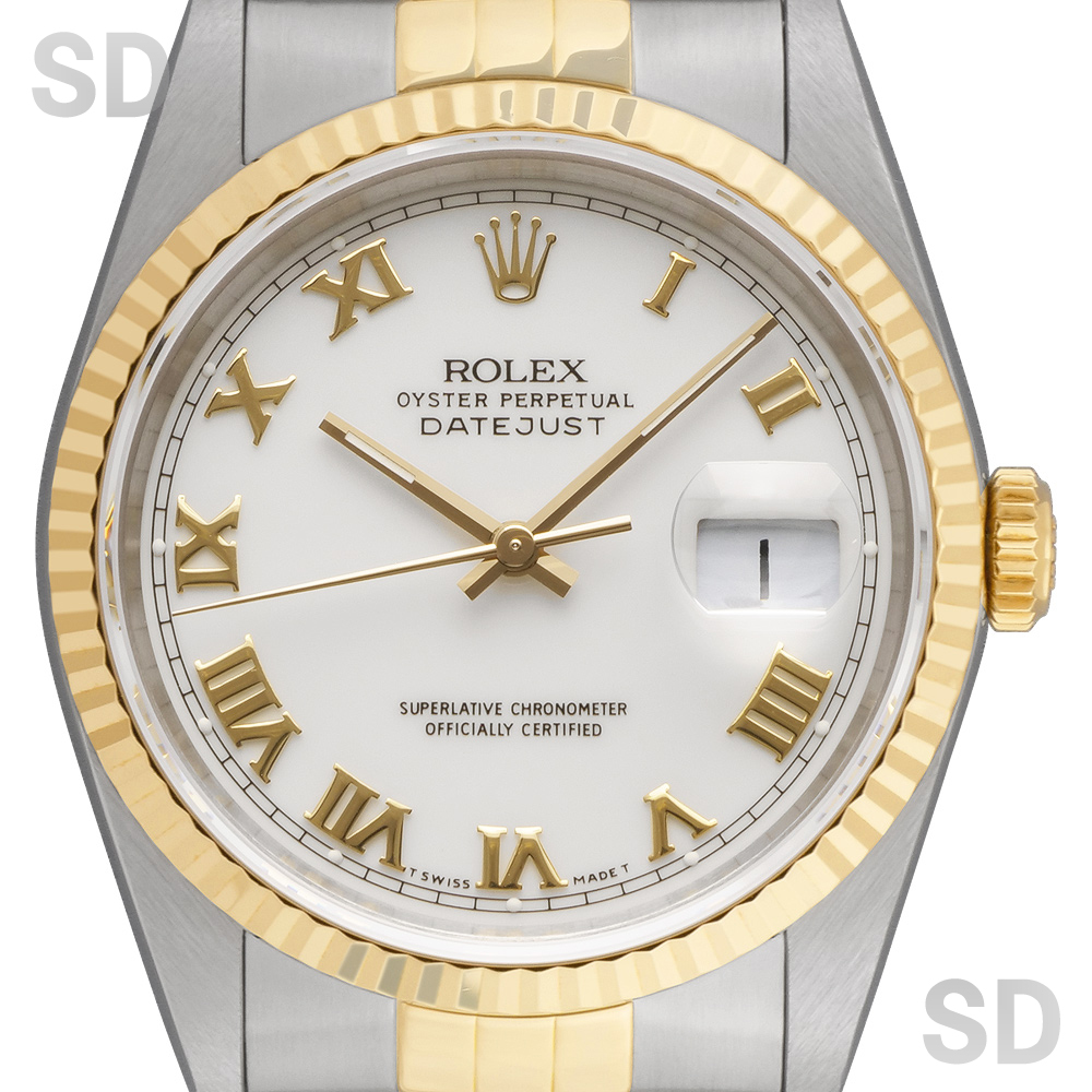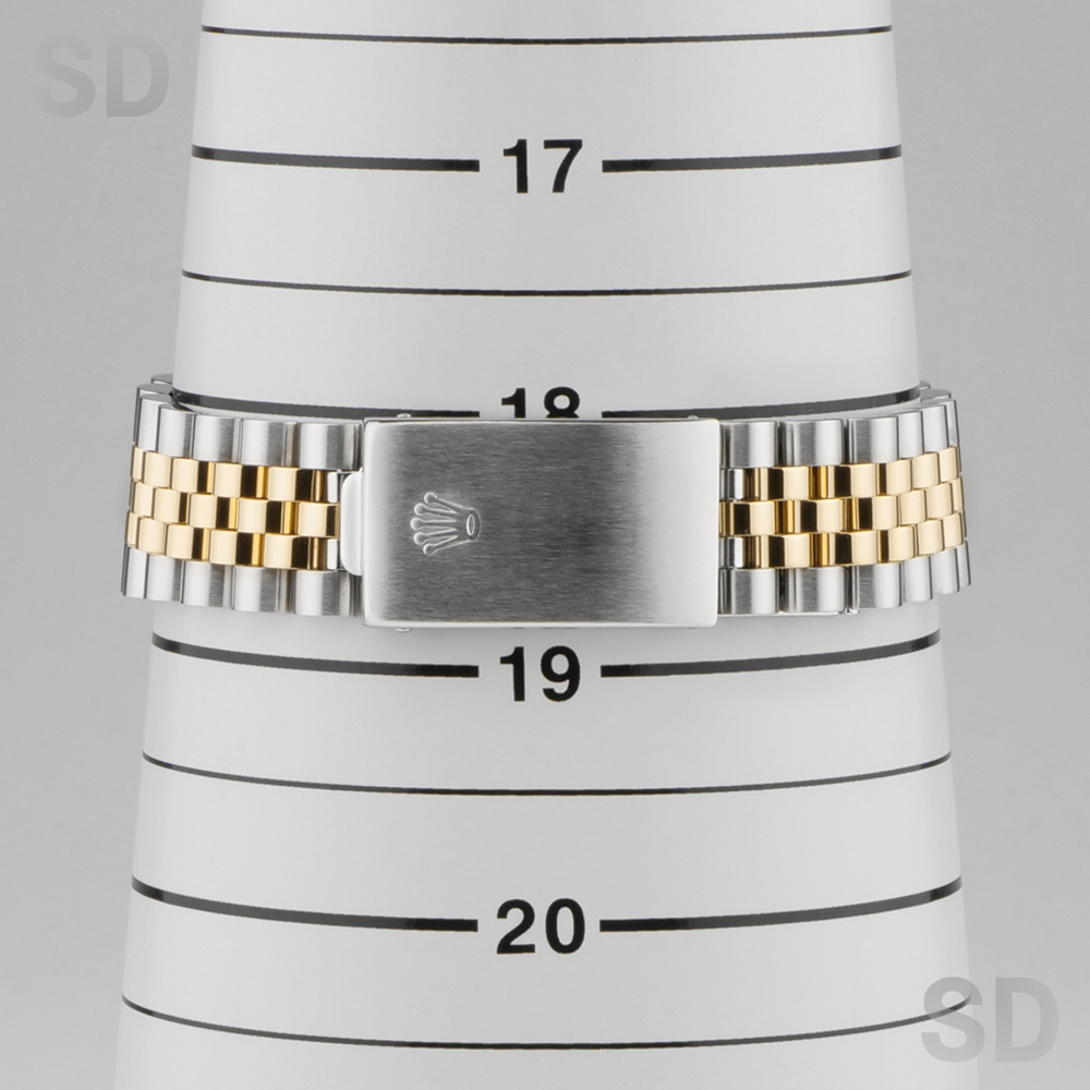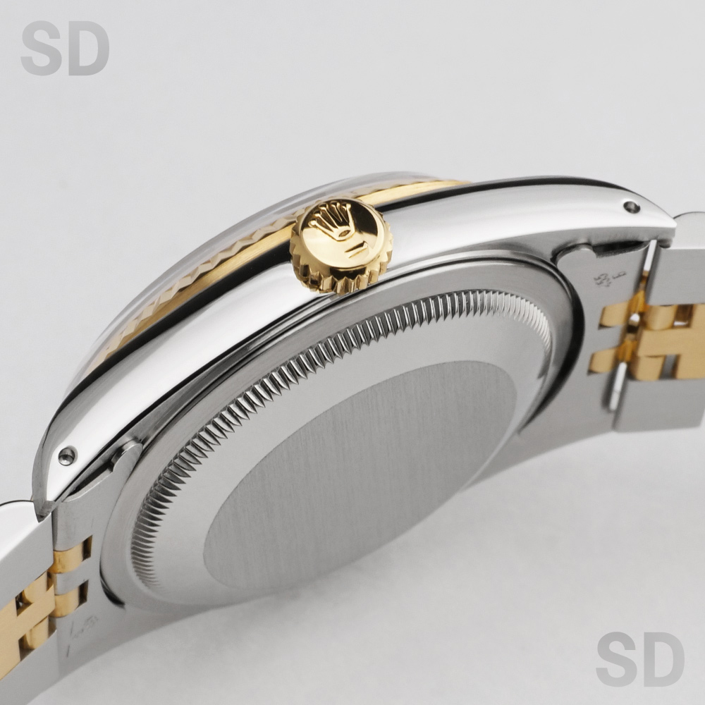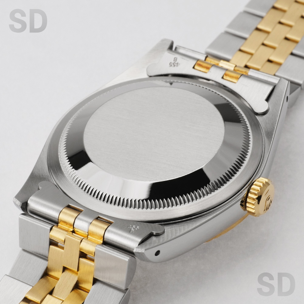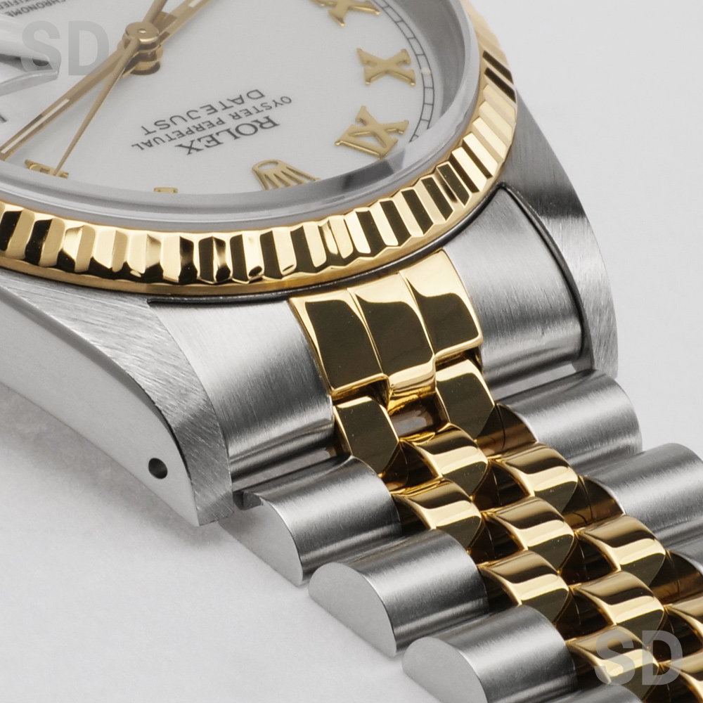 フルーテッドベゼルにジュビリーブレスレットをセットしたイエローゴールドコンビはデイトジャストの中でも代表格とされるデザイン。1990年代初期に”ロレックス×コンビ”から「ロレコン」と呼ばれ一世を風靡したこちらのモデルは、世代を超えて現在でも愛される定番モデルとなりました。現行モデルから数え2世代前のモデルではありますが、旧式モデルとはいえロレックスの代表的な最高ムーブメントとされるCal.3135搭載で精度にも定評がありケースのシャープさとブレスレットの軽さにより普段使いとしても扱いやすく、あえて旧型を選ばれる方も多いほど、当店一番人気のモデルです。