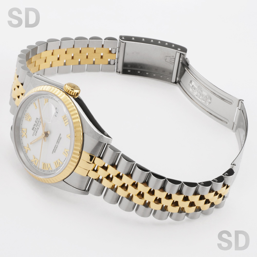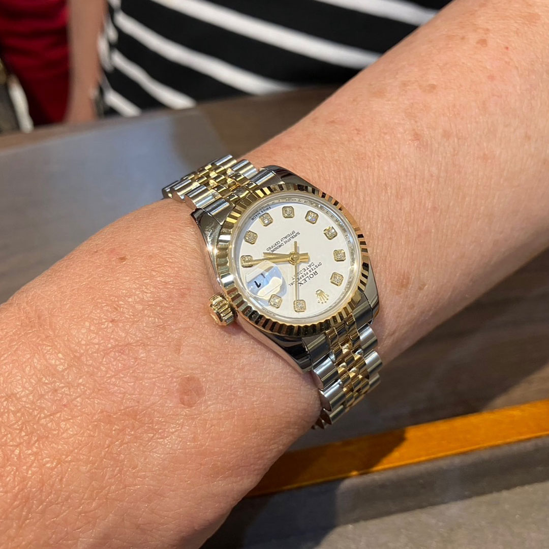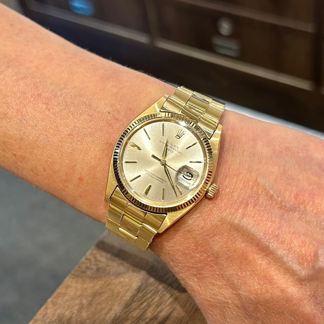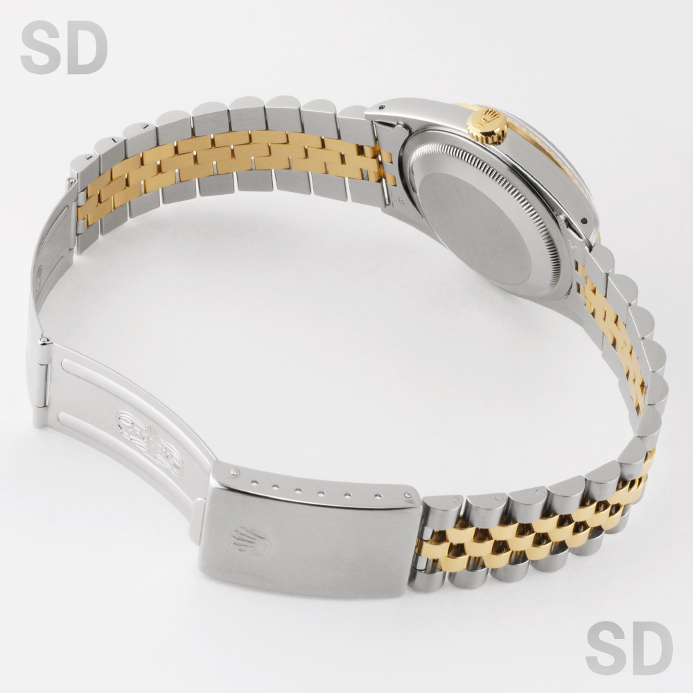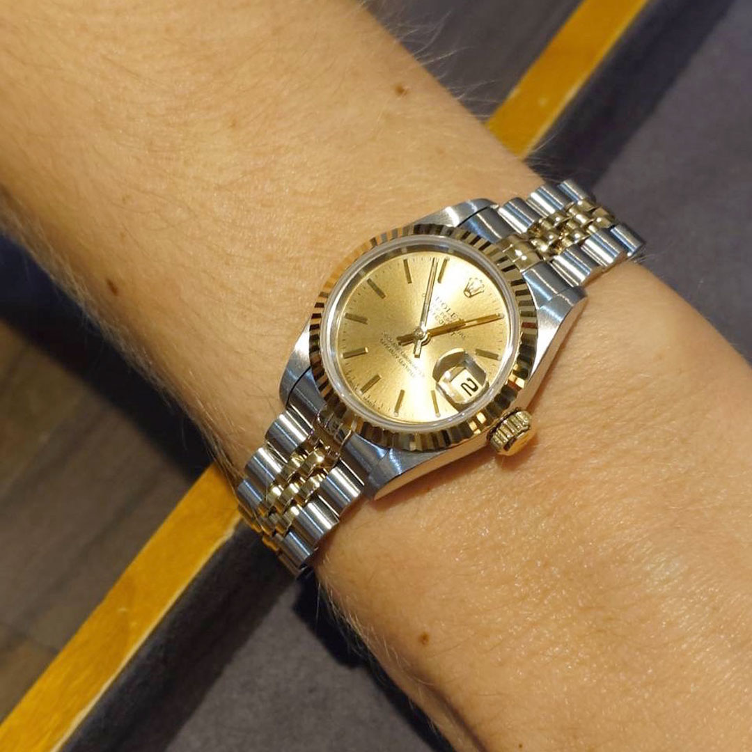 フルーテッドベゼルにジュビリーブレスレットをセットしたイエローゴールドコンビはデイトジャストの中でも代表格とされるデザイン。1990年代初期に”ロレックス×コンビ”から「ロレコン」と呼ばれ一世を風靡したこちらのモデルは、世代を超えて現在でも愛される定番モデルとなりました。現行モデルから数え2世代前のモデルではありますが、旧式モデルとはいえロレックスの代表的な最高ムーブメントとされるCal.3135搭載で精度にも定評がありケースのシャープさとブレスレットの軽さにより普段使いとしても扱いやすく、あえて旧型を選ばれる方も多いほど、当店一番人気のモデルです。