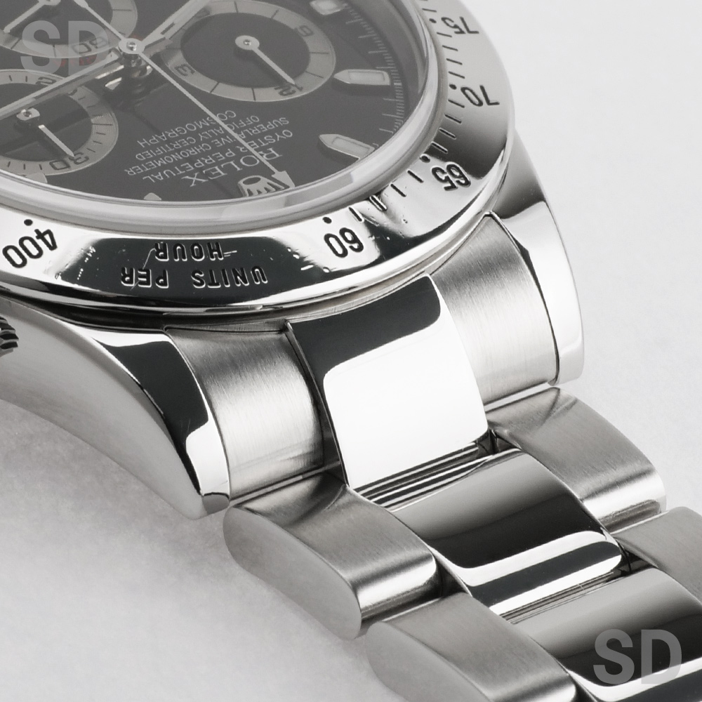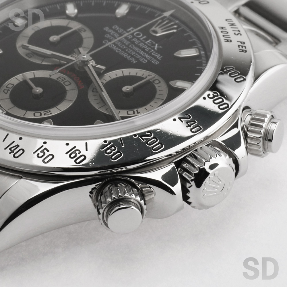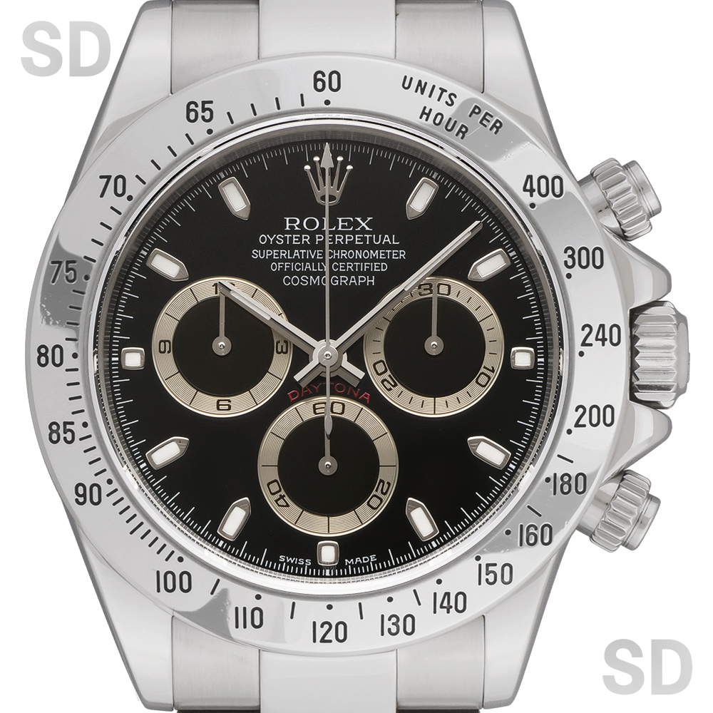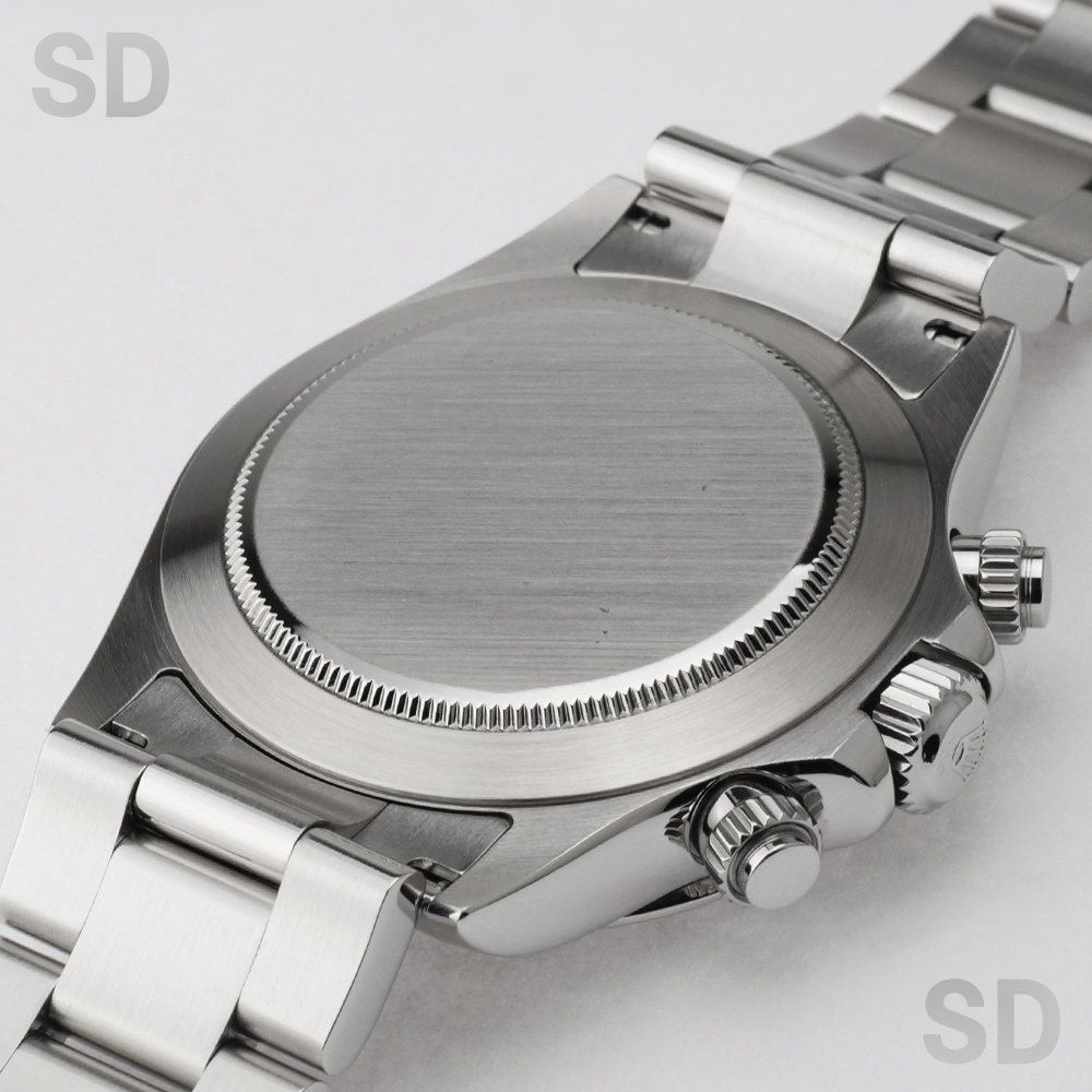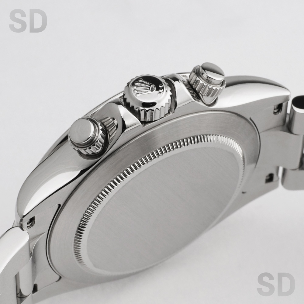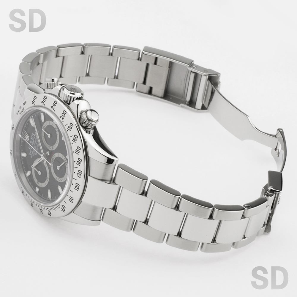 今回入荷した個体は、初期生産期に見られる細針仕様を採用しており、現行モデルとは一線を画す、初期ならではの繊細でクラシカルなデザインバランスが魅力です。ステンレススチール特有の質感と、ブラックダイアルの深みが見事に調和し、デイトナの持つスポーティエレガンスを際立たせています。