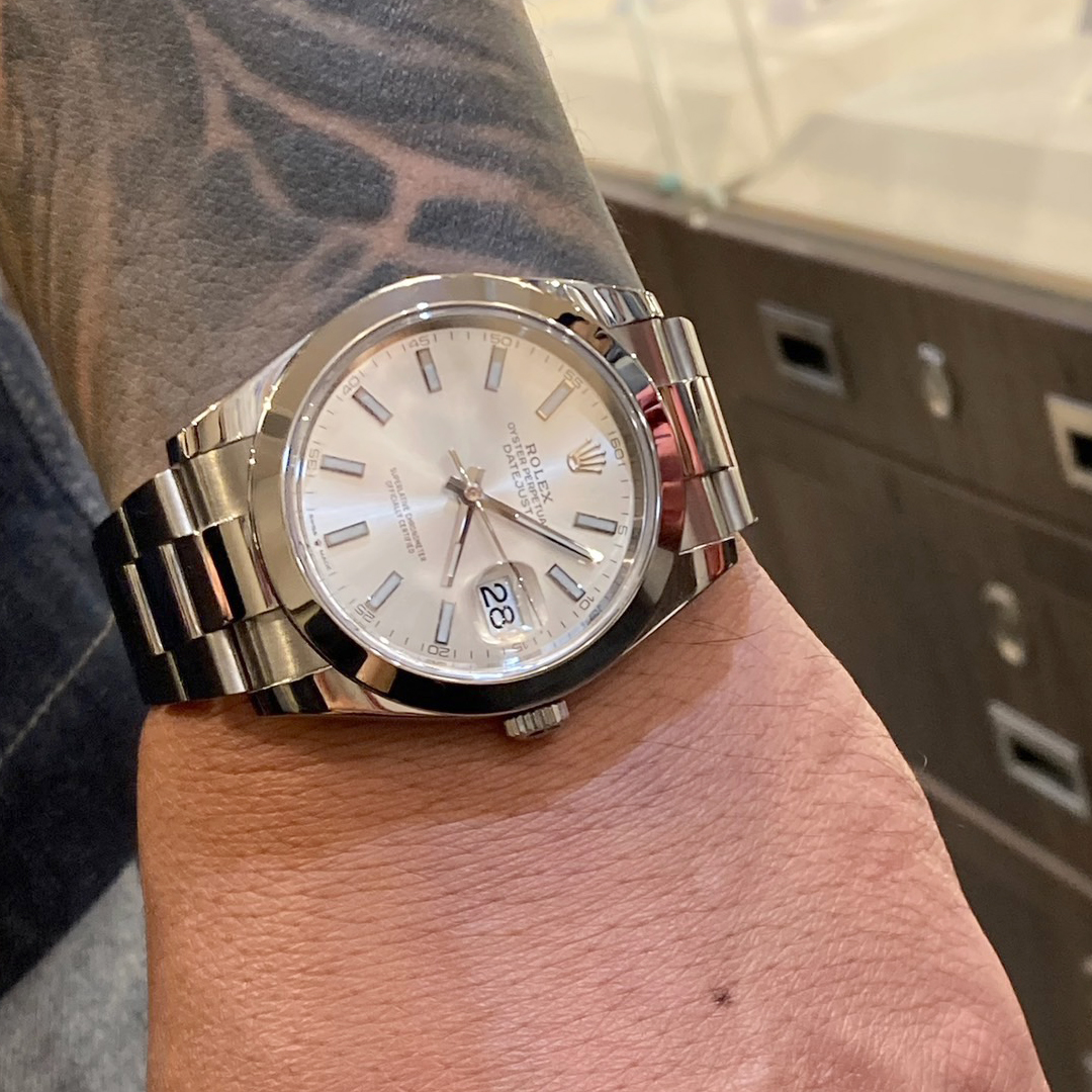 こちらの個体はステンレススチールとホワイトゴールドベゼルを組み合わせた仕様で、精悍な印象のブラックダイアルに、スポーティかつラグジュアリーな雰囲気のオイスターブレスレットが装着された、重厚感と上品さを兼ね備えた一本です。
