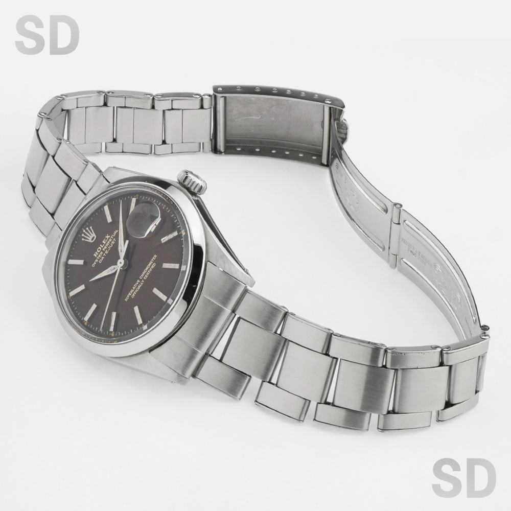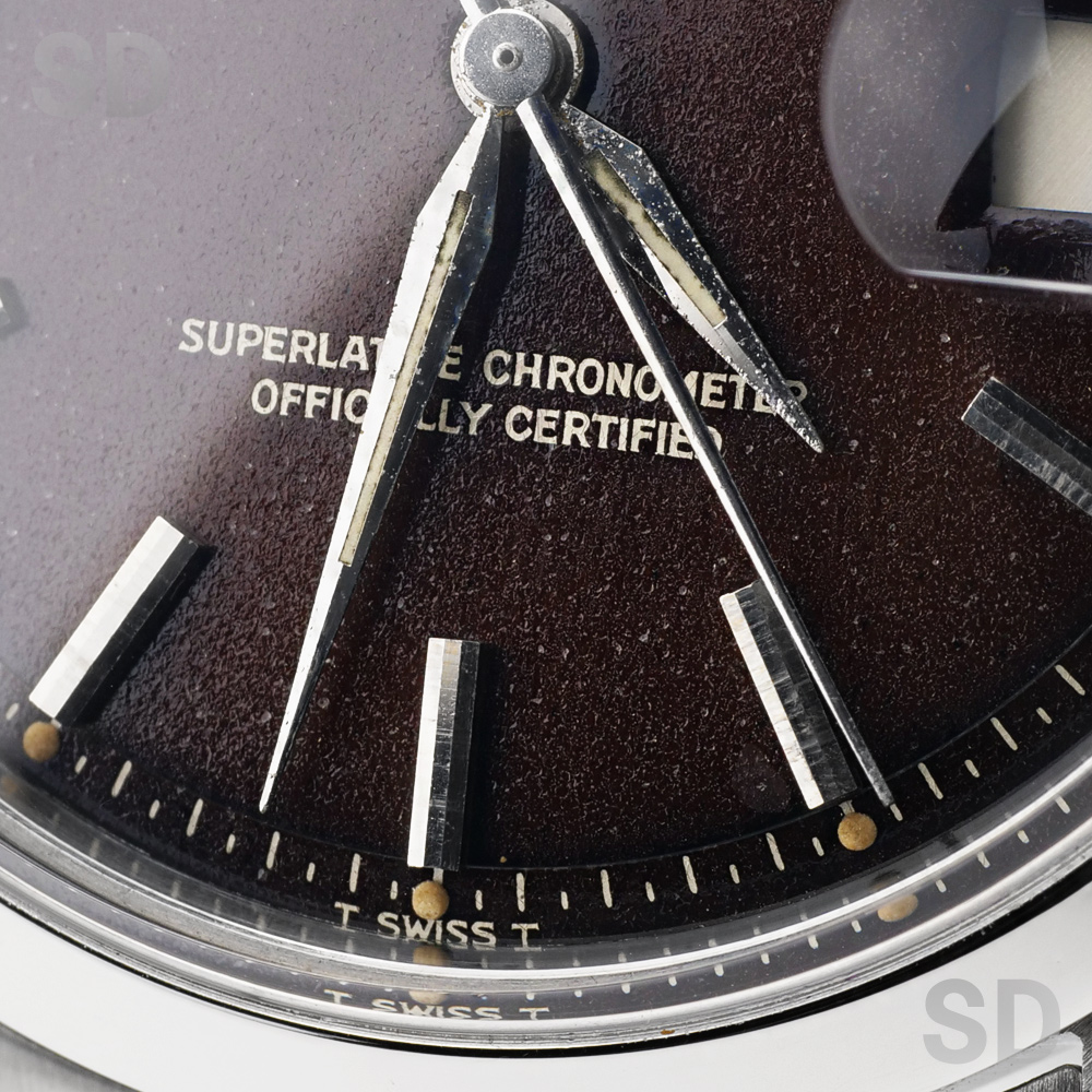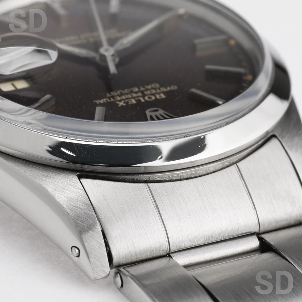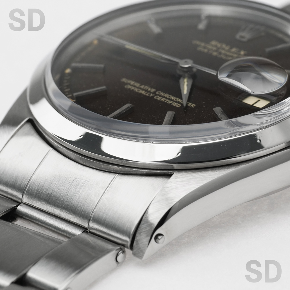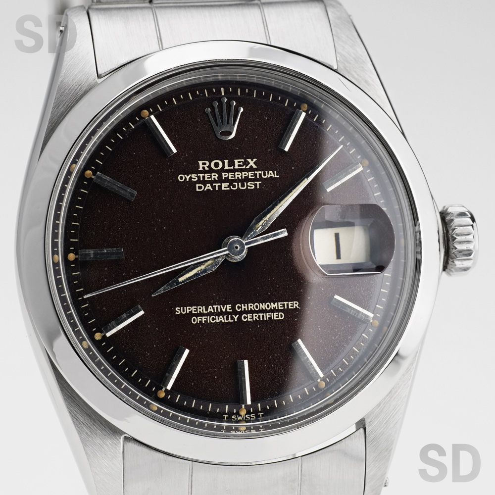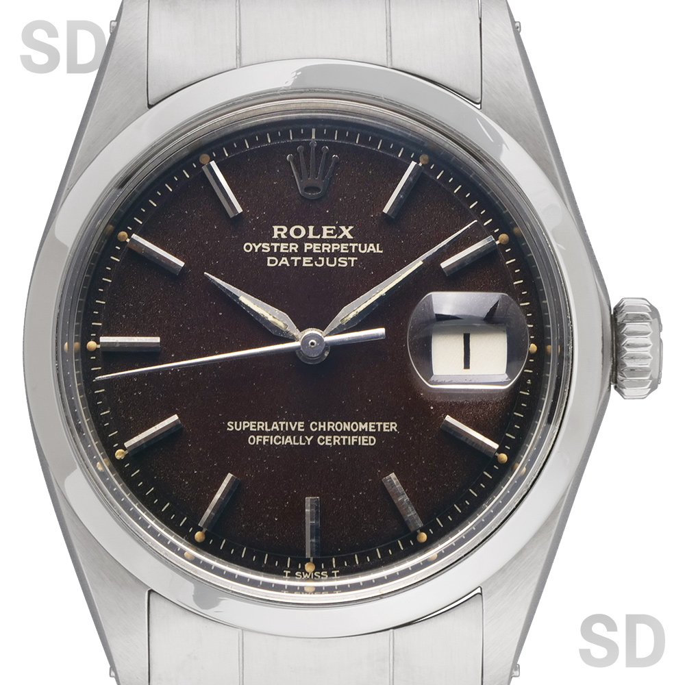 文字盤の外周が段落ちしているのが特徴のヴィンテージデイトジャストシリーズ。その中でもツルっとしたポリッシュベゼルを装備する1600は、カジュアル向きではあるもののモダンな雰囲気を醸し出し、どんなファッションにも合わせる事ができます。また、こちらのミラーダイヤルがブラウン調になっているエイジング感あふれる文字盤はヴィンテージマニアより通称「トロピカル」と呼ばれており、その他にもアルファハンドでリベットブレスのでべそバックルが装備されているというヴィンテージ感溢れるマニアには堪らない1本だと思います。