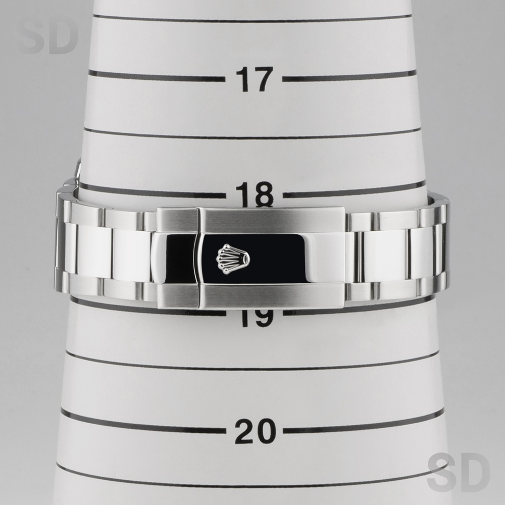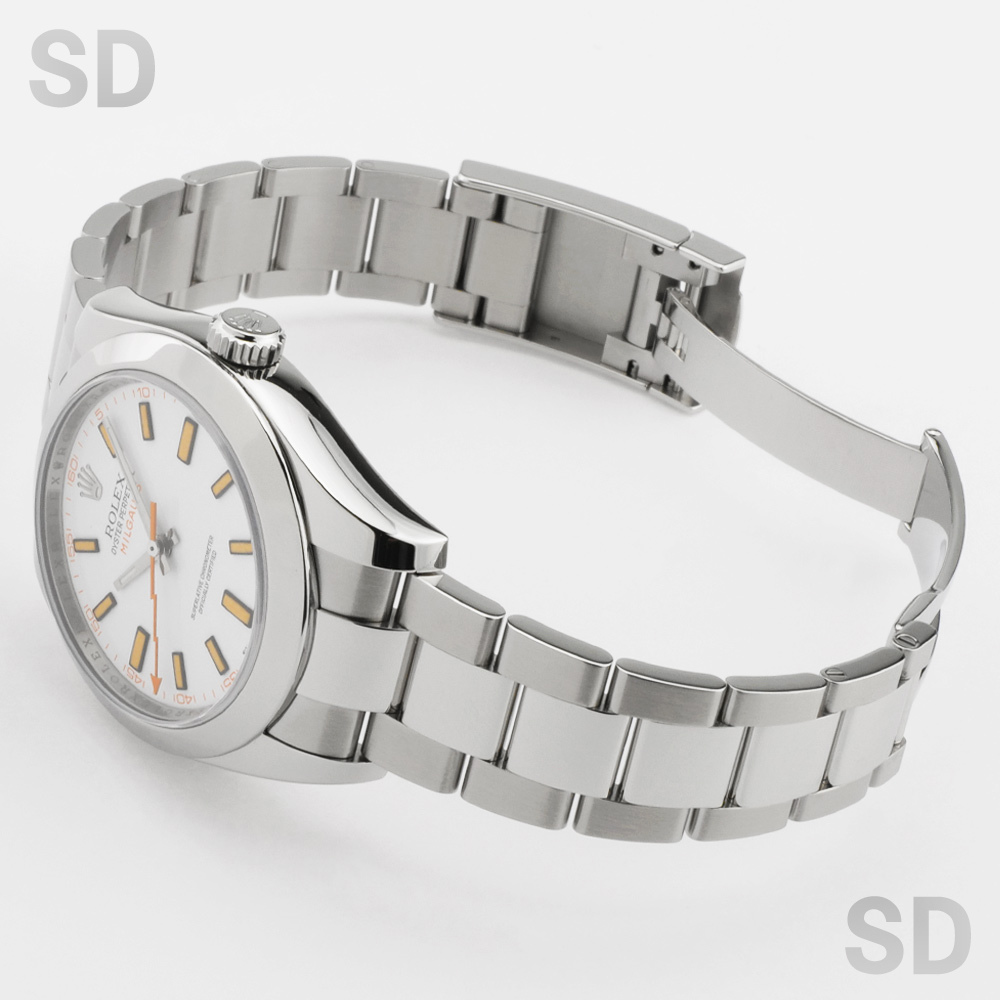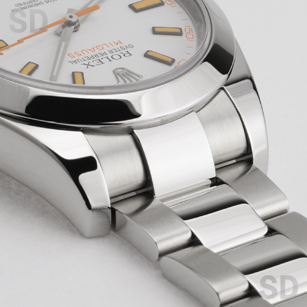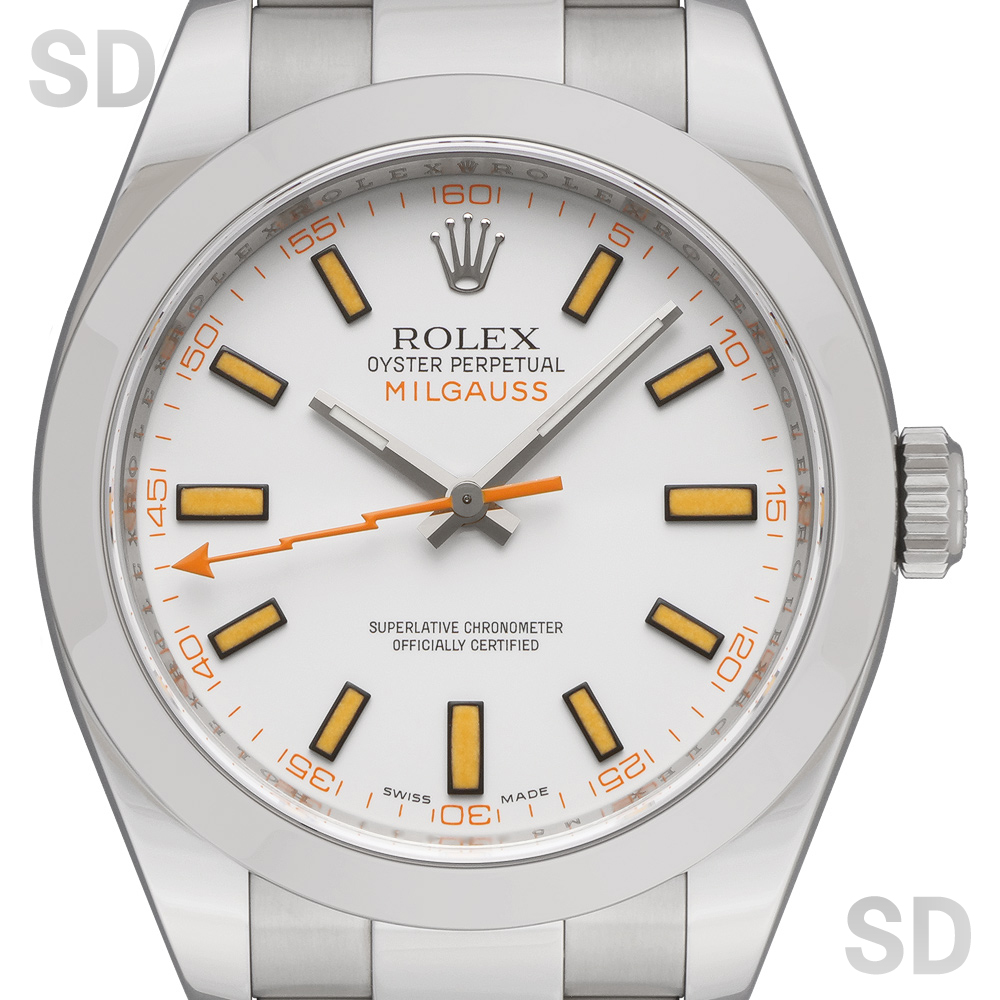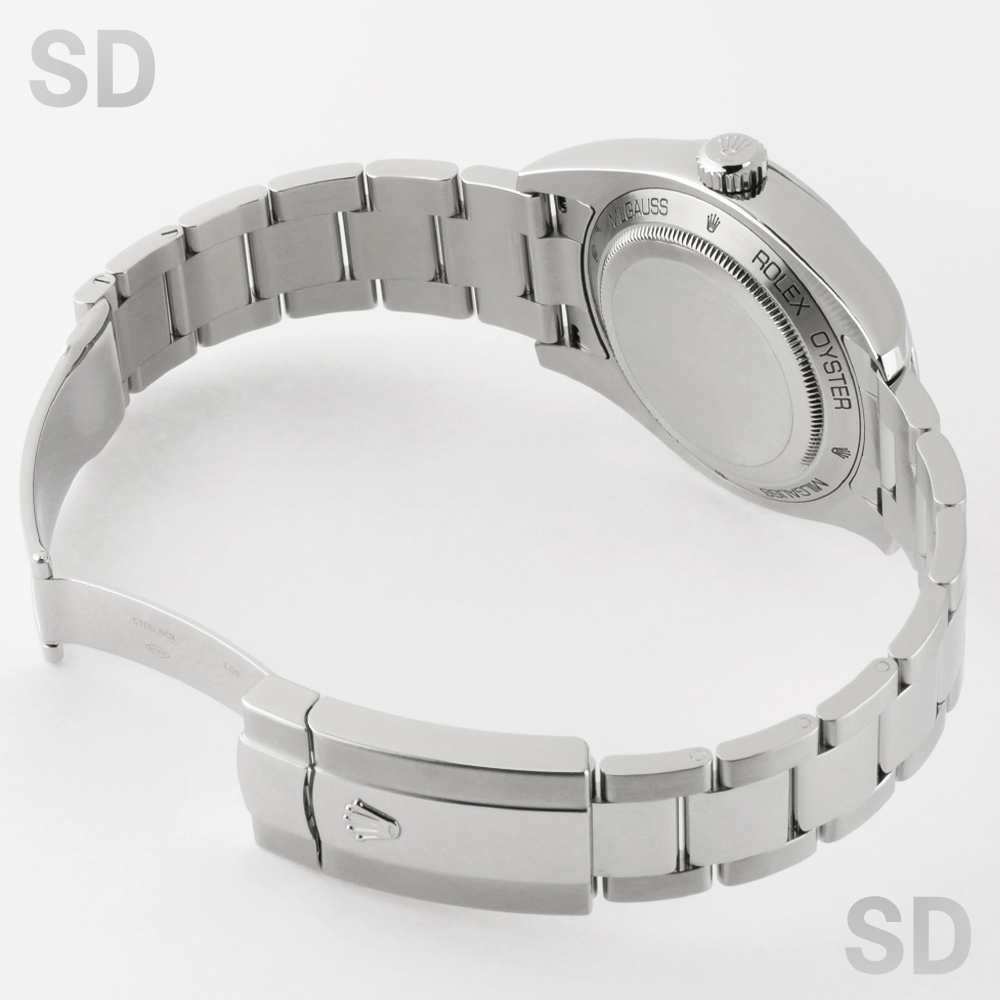 爽やかで上品な印象を与えるホワイト文字盤は、通称「トロピカルマンゴー」と呼ばれ、その独特の色味と希少性から非常に人気の高い仕様です。オレンジの稲妻型秒針が印象的なアクセントとなり、洗練された中にも遊び心を感じさせるデザインが魅力の一本でございます。磁気帯びに強い耐磁構造を備え、優れた実用性とロレックスならではの高い完成度を兼ね備えたモデルです。