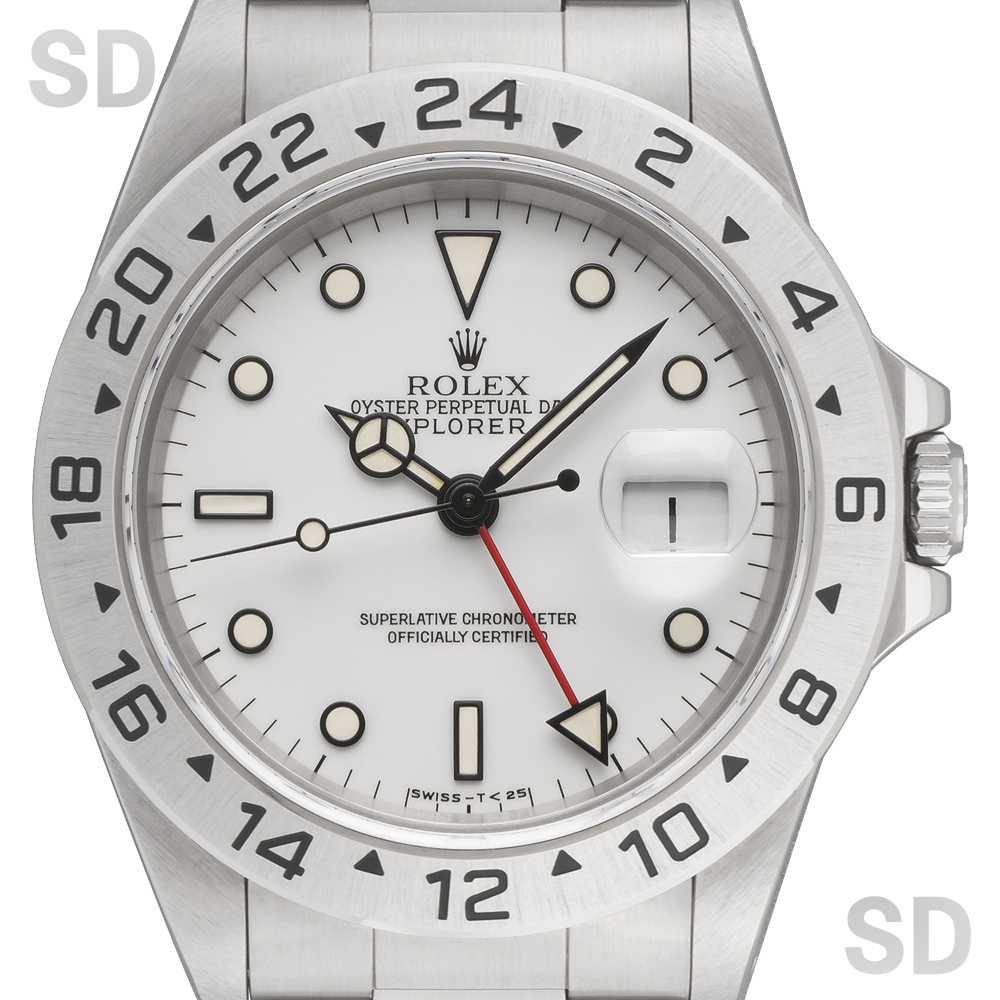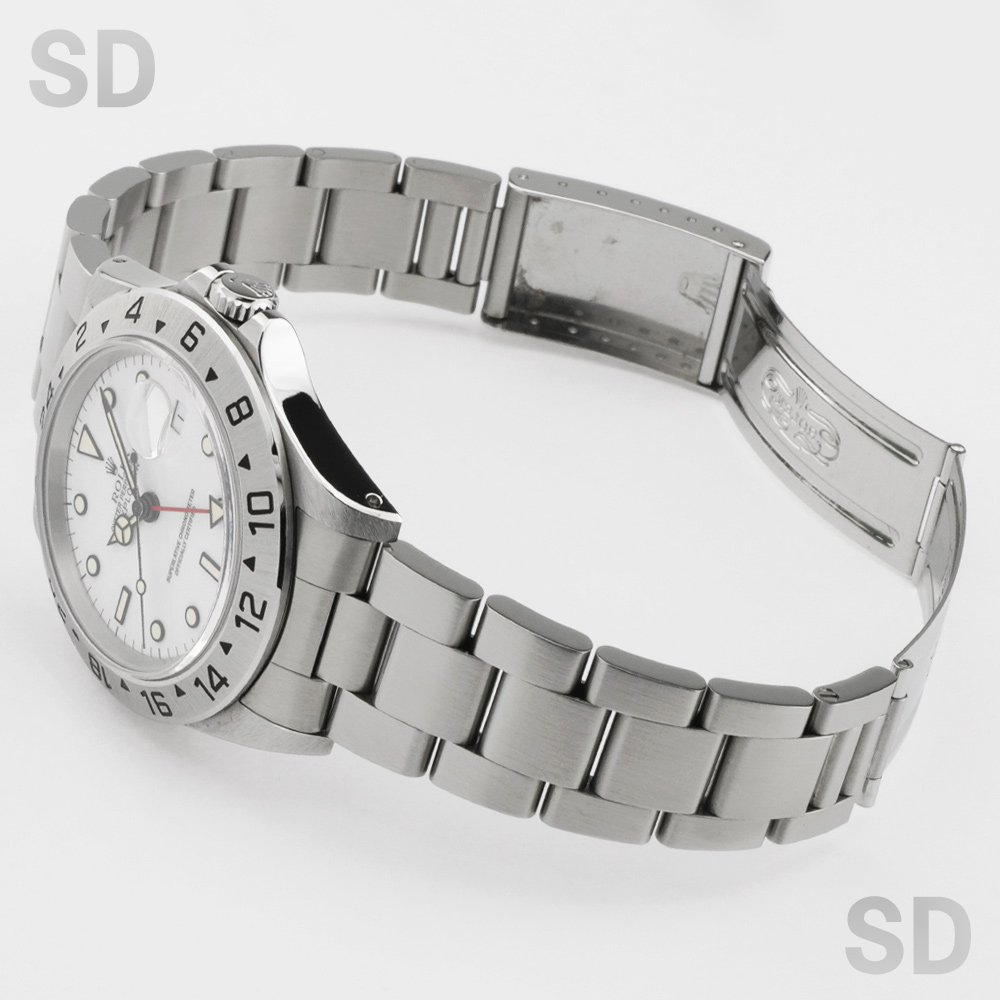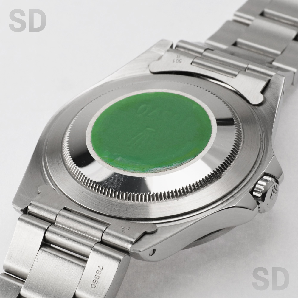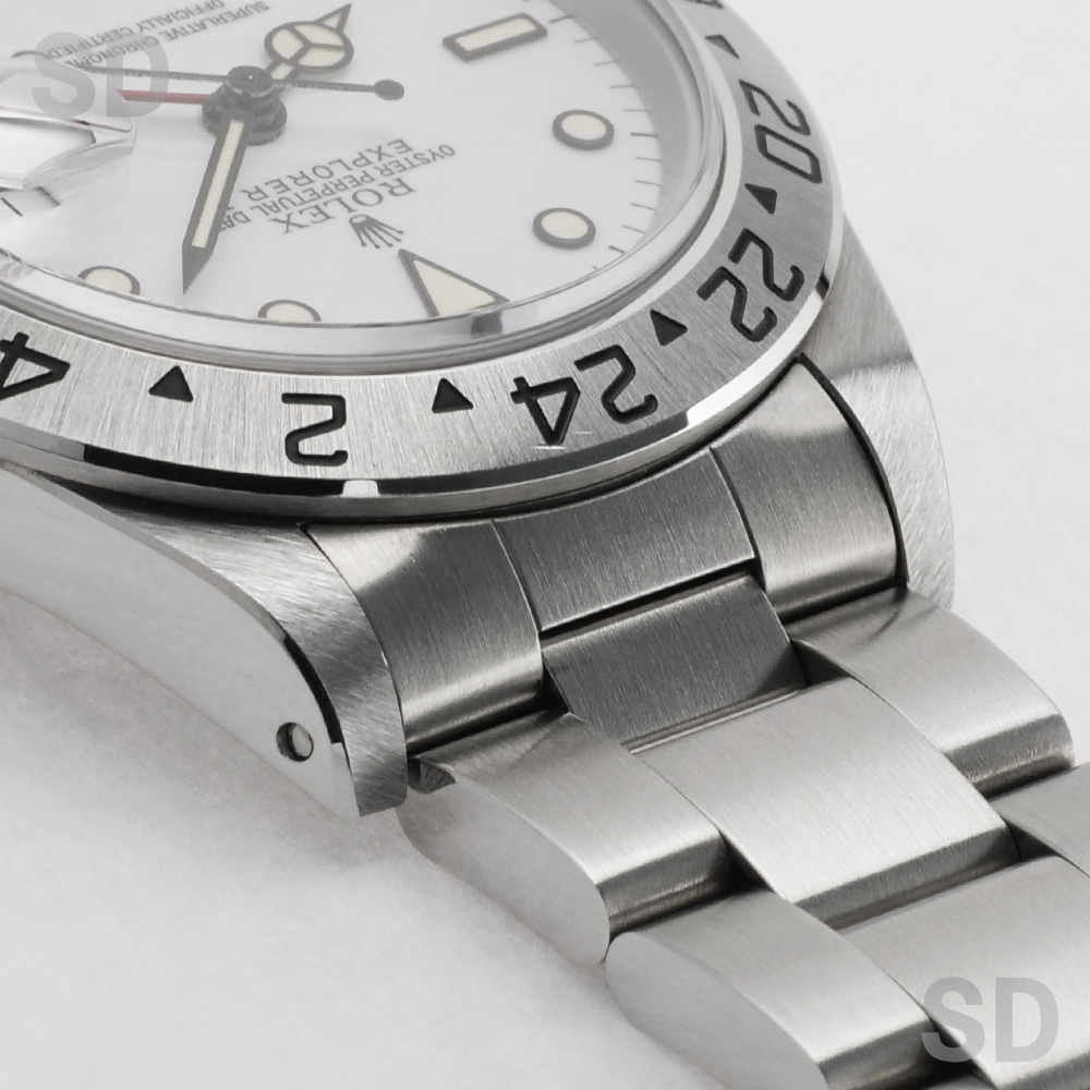 エクスプローラー2としては3代目となるこちらのモデル。おおよそ1988年から2011年までの長期的な製造でコレクションのデザインを確立しました。エクスプローラー2としては最後の40mmケースとなり、後継機モデルがサイズアップしてしまったことで現在でも根強くファンがおります。また、こちらはシングルバックルにトリチウム夜光の通称「シングルトリチ」と称される個体。現在ではセミヴィンテージとされるモデル故に当時のオリジナル性を保った個体はマニアから一段と評価されております。