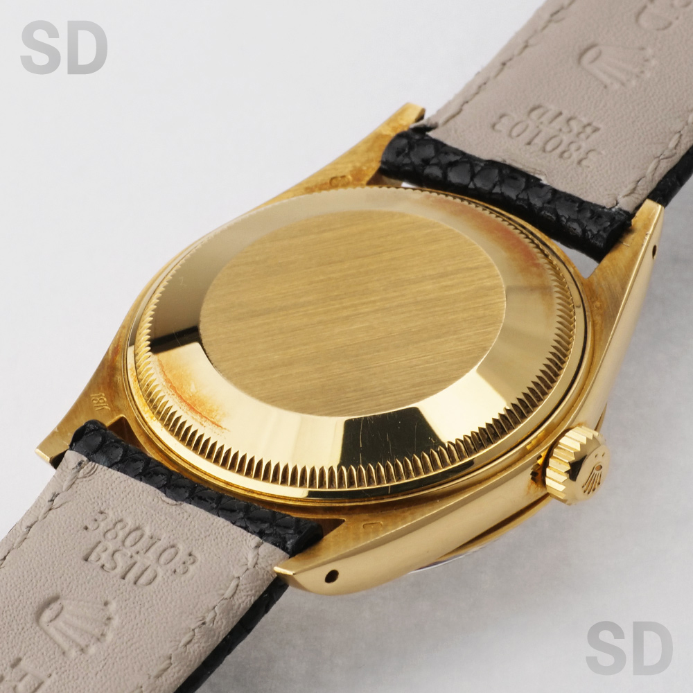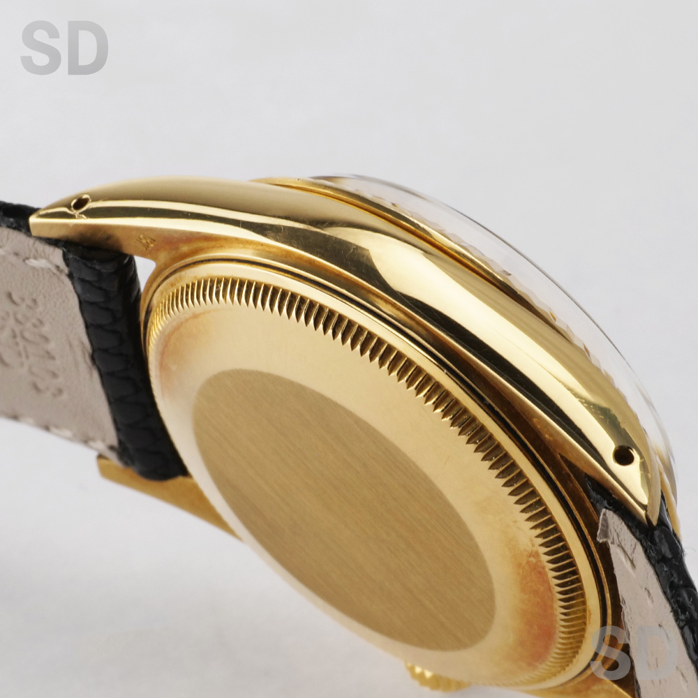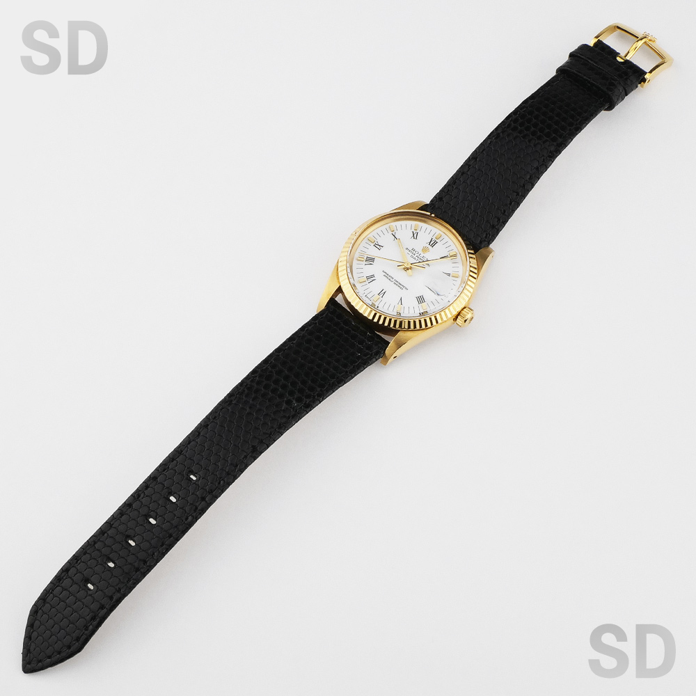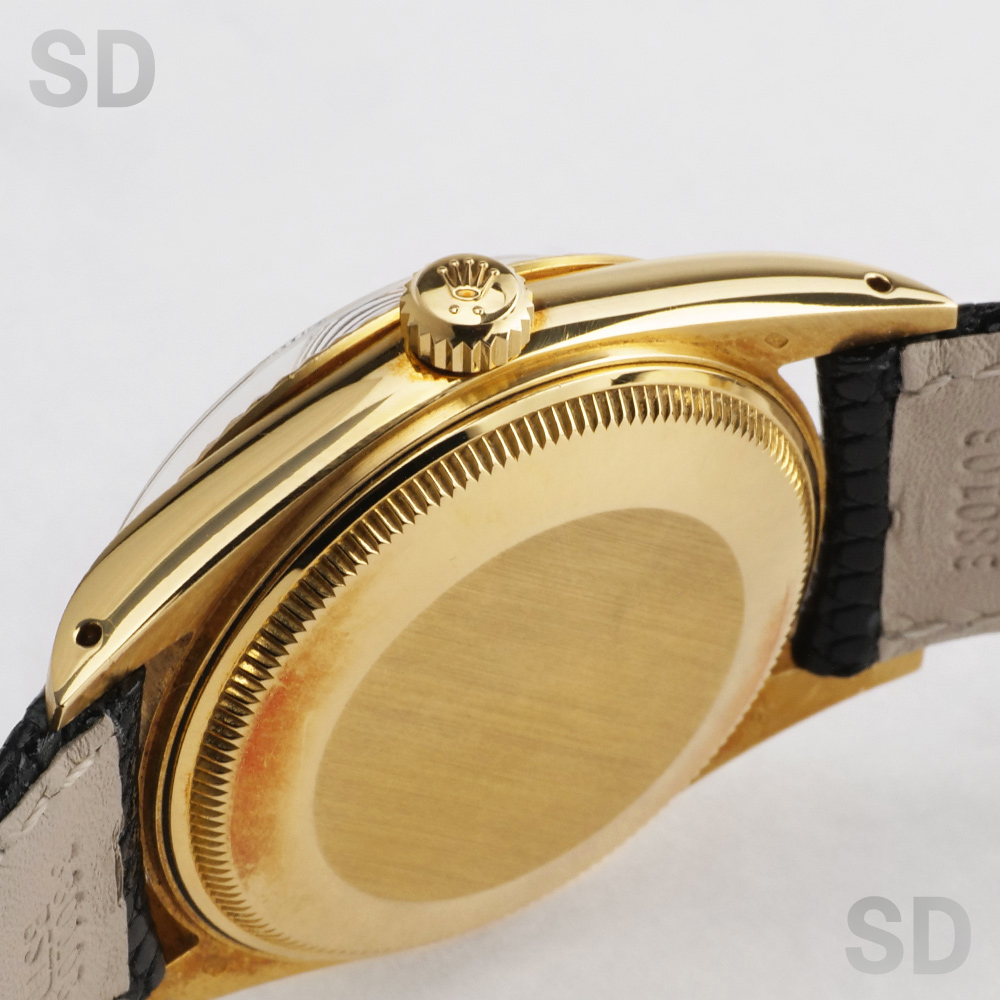 こちらは1980年代に製造されたパーペチュアルデイトシリーズ。K18イエロゴールド無垢で製造されたとても珍しい個体あり、フルーテッドベゼル装備でデザインはデイトジャストに類似します。あくまでもヴィンテージ区分のモデルですので強化プラスチック風防を装備しておりますが、このシリーズよりハイビートとなるCal.3035を搭載し日付けの早送りも可能となりましたのでとても実用的となりました。