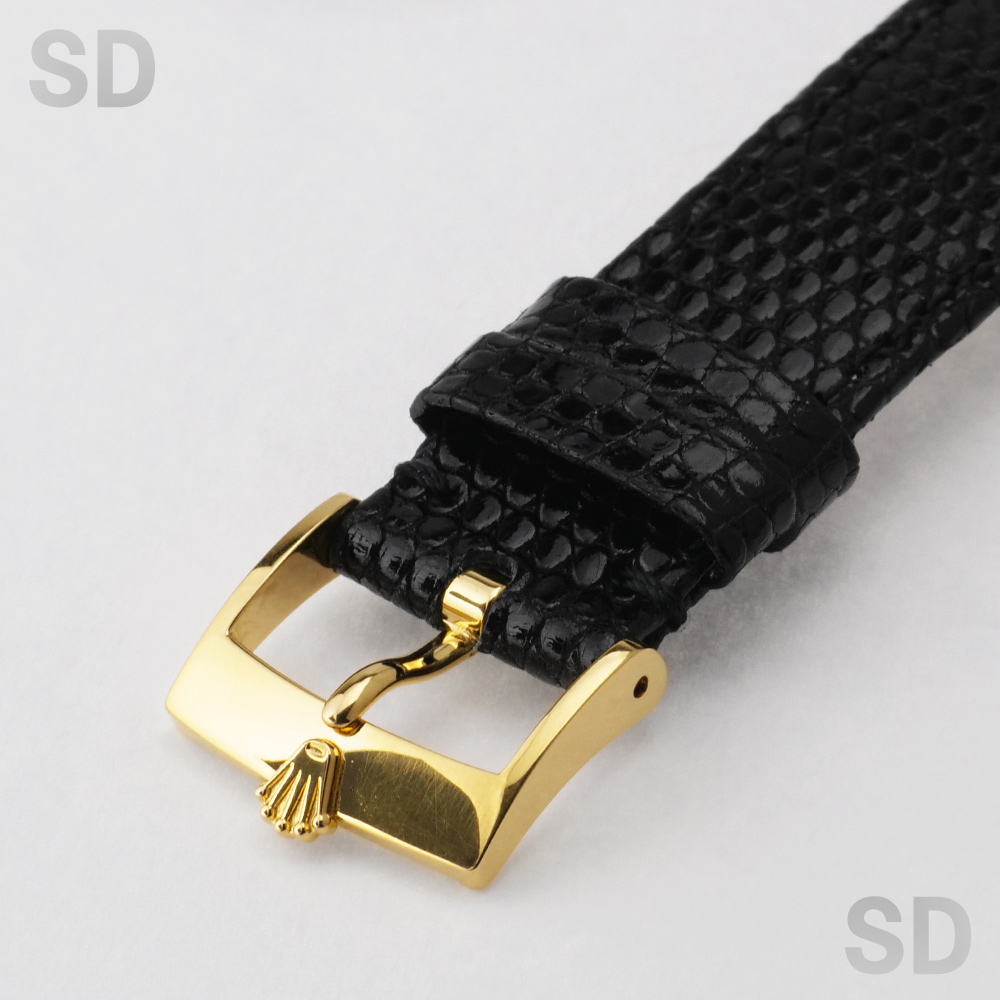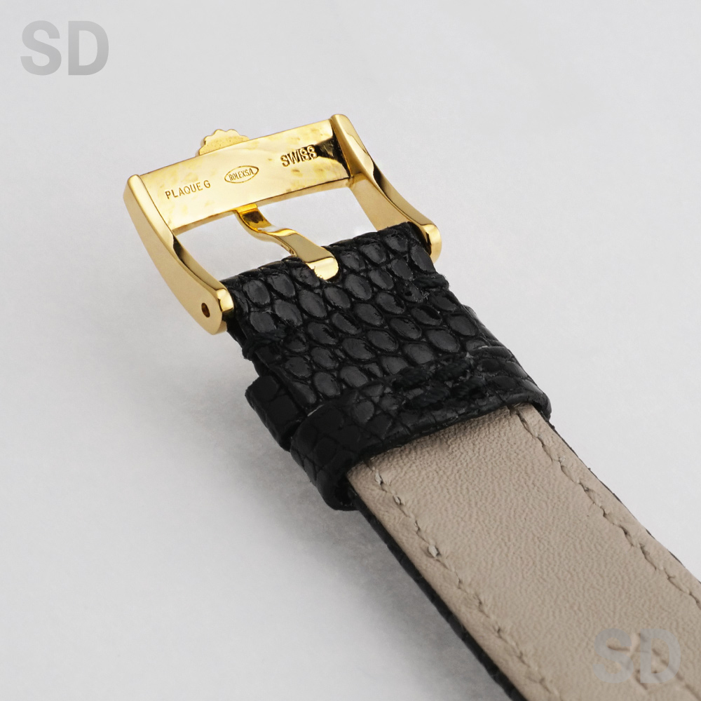 2025年にメーカーにて新品革ベルト交換を行っており、その際の修理納品明細書が付属いたします。本体には光沢ある黒の純正リザードレザーに純正金メッキ尾錠が装備されております。