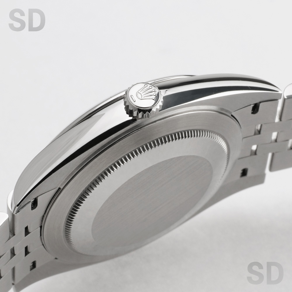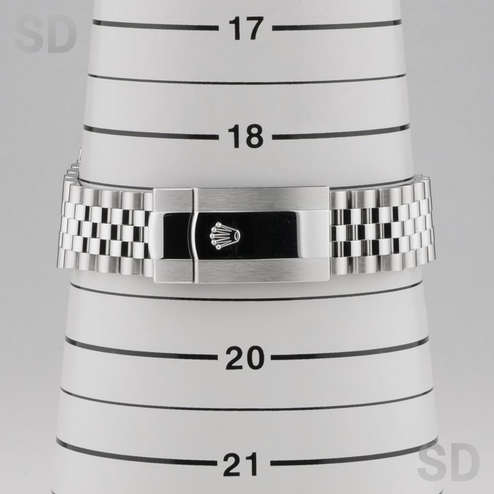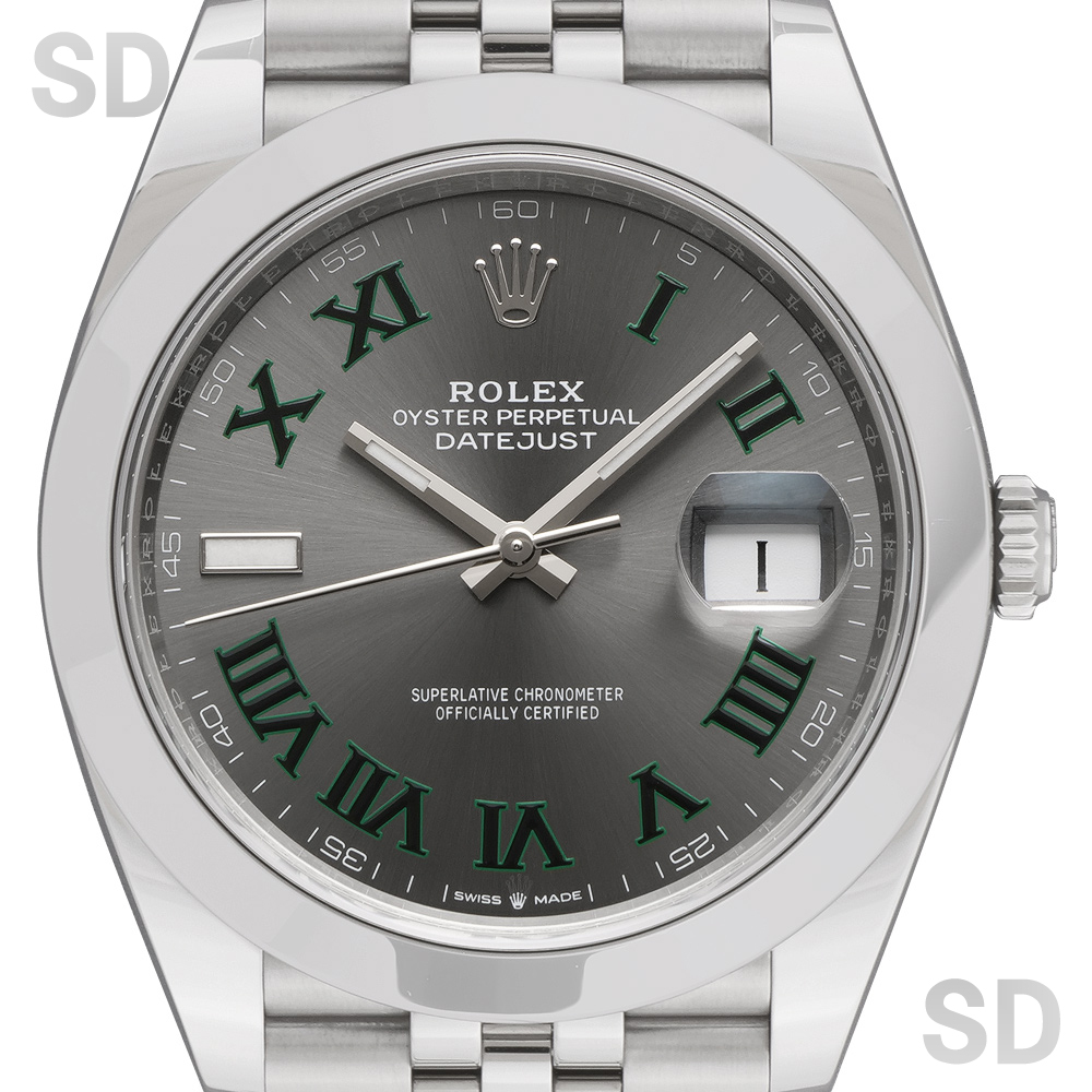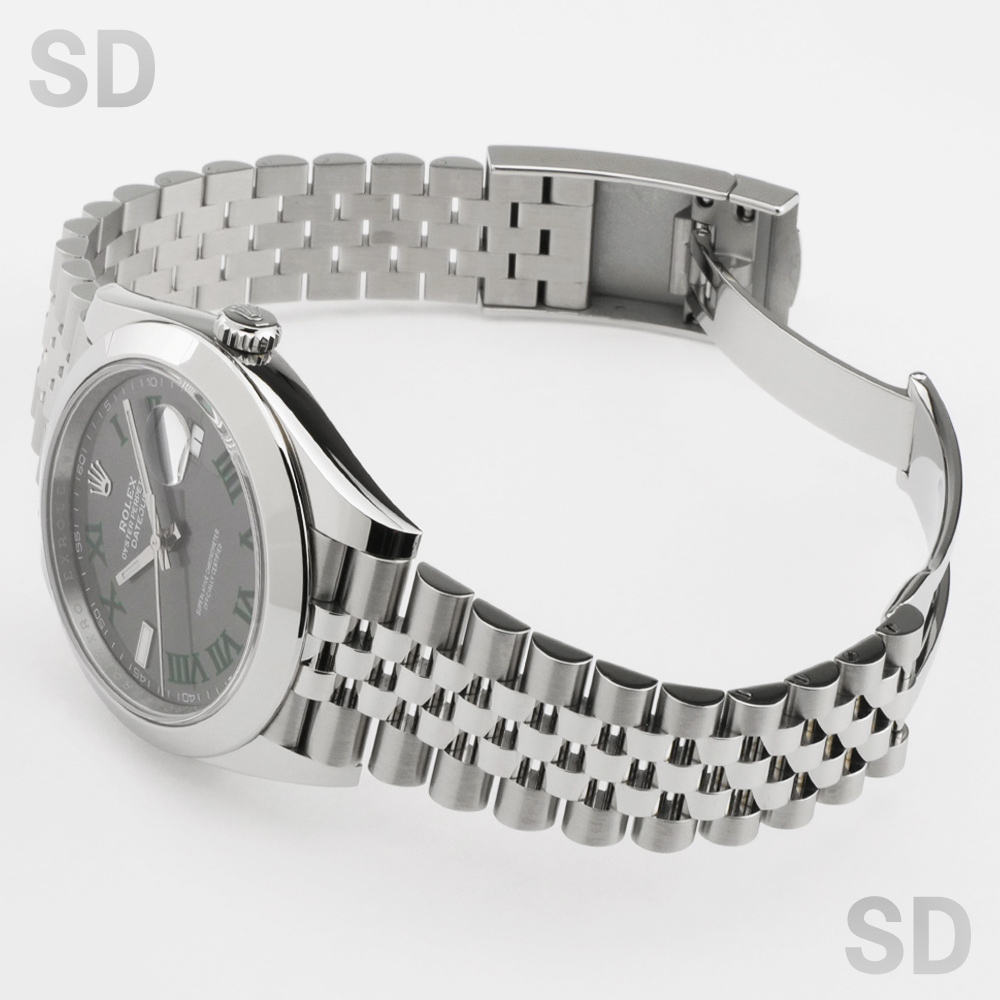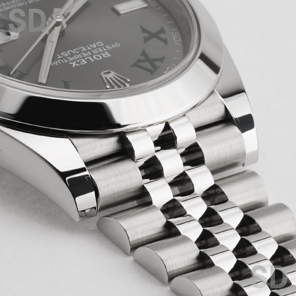 こちらのモデルは2017年に発表された現行モデル。36mmケースのデイトジャストとはサイズ違いとされていますが、36mmと異なりポリッシュされたスムースベゼルはフラットな形状をしております。生産が終了となったデイトジャストIIの後継機モデルとして製造されておりますが、ラグやケース形状の変更が加えられ長時間パワーリザーブの新ムーブメントCal.3235を搭載。また、文字盤には現在一番人気となるスレートローマが装備されており、落ち着いた色合いにローマ数字を縁取るグリーンカラーが印象的でファンからは「ウィンブルドンダイヤル」とも呼ばれ愛されています。シンプルなスムースベゼルにジュビリーブレスレットを装備されたオンオフ問わずご使用出来る最新鋭のモデル。飽きのこないデザインで、末永くお使い頂けます。