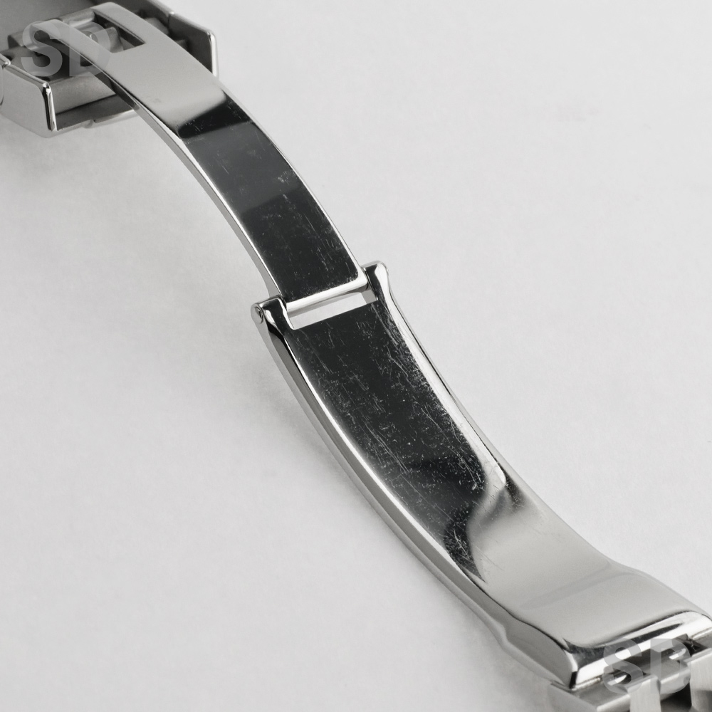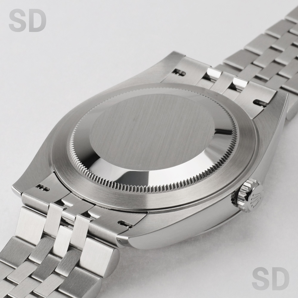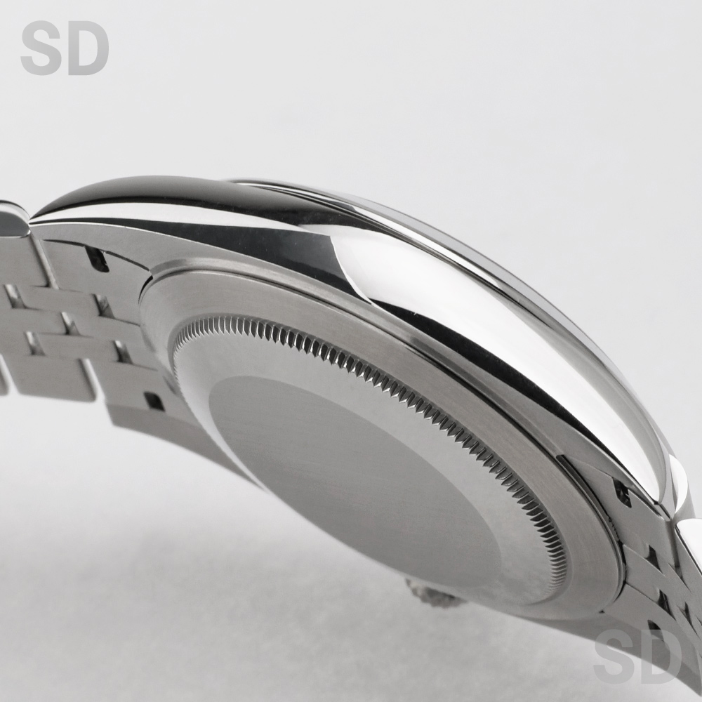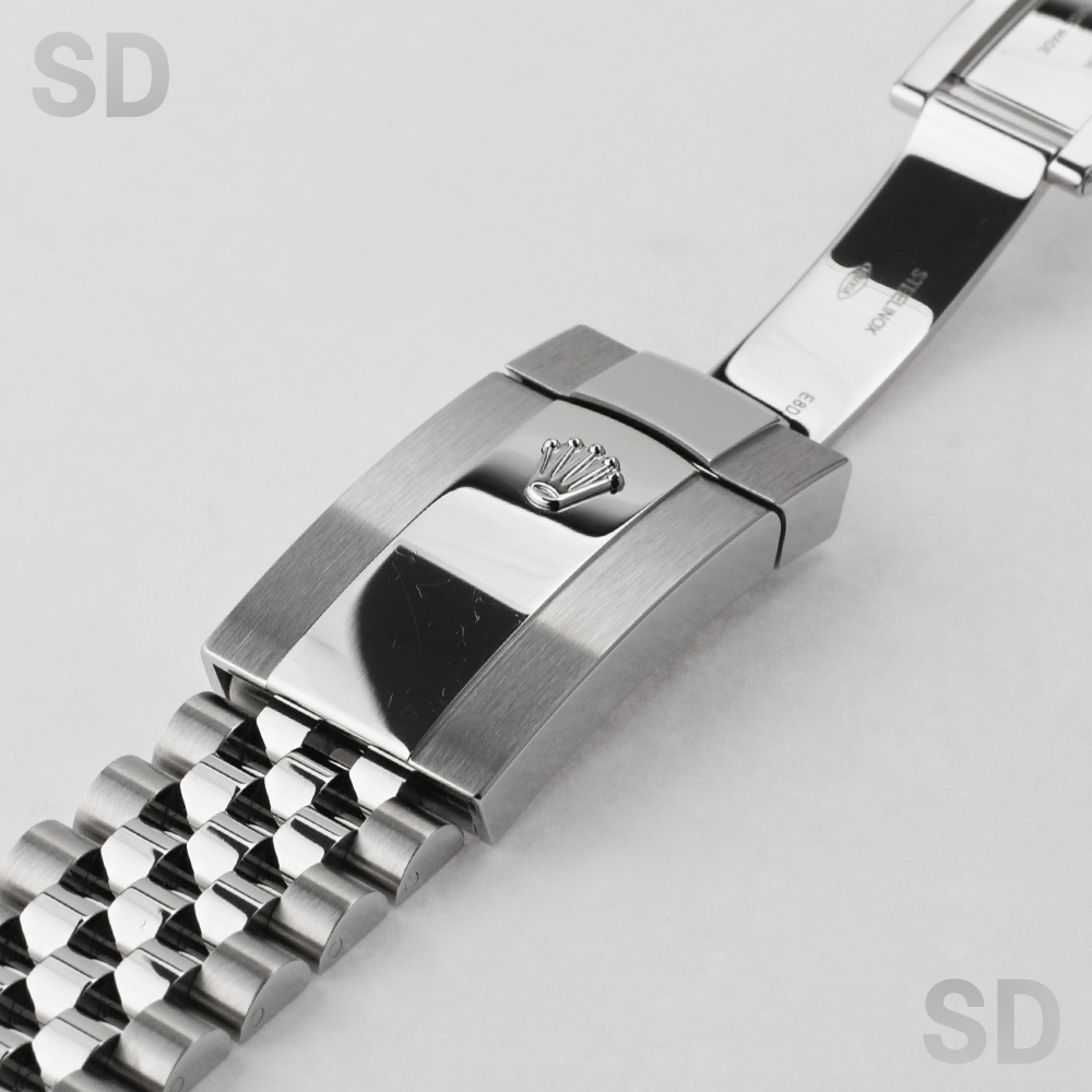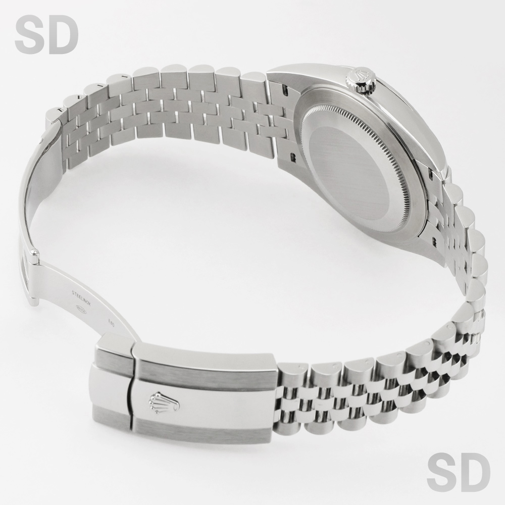 こちらのモデルは2017年に発表された現行モデル。36mmケースのデイトジャストとはサイズ違いとされていますが、36mmと異なりポリッシュされたスムースベゼルはフラットな形状をしております。生産が終了となったデイトジャストIIの後継機モデルとして製造されておりますが、ラグやケース形状の変更が加えられ長時間パワーリザーブの新ムーブメントCal.3235を搭載。また、文字盤には現在一番人気となるスレートローマが装備されており、落ち着いた色合いにローマ数字を縁取るグリーンカラーが印象的でファンからは「ウィンブルドンダイヤル」とも呼ばれ愛されています。シンプルなスムースベゼルにジュビリーブレスレットを装備されたオンオフ問わずご使用出来る最新鋭のモデル。飽きのこないデザインで、末永くお使い頂けます。
