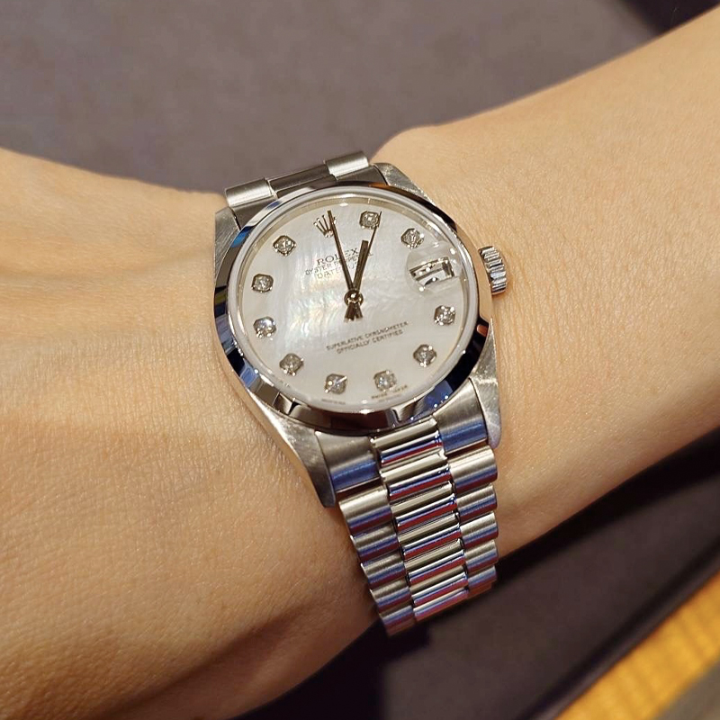 本モデルは、存在感のあるホワイトゴールド製フルーテッドベゼルとステンレススチールのコンビネーションが特徴で、ダイアルは上品で深みのあるアズーロブルーにローマンインデックスを組み合わせた仕様で、落ち着きと華やかさを兼ね備えた大変人気の高い一本でございます。