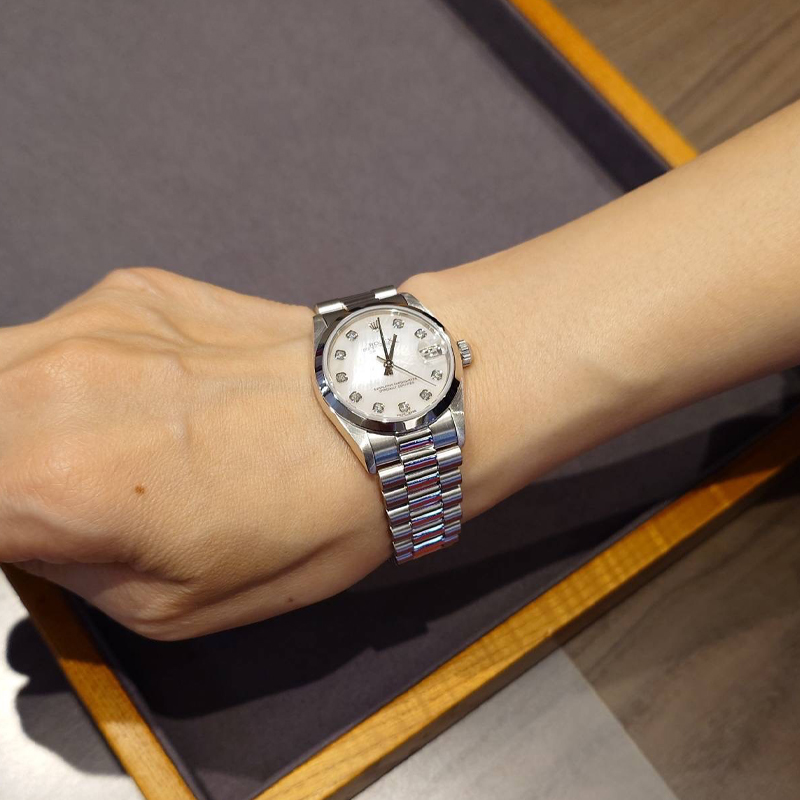 状態です。外装につきましては、裏ブタおよびクラスプ裏周辺に、展示時に生じた程度の些細な擦り傷や小傷が確認されるものの、いずれも目立つものではなく、研磨による傷取りを必要としないほど優れたコンディションを保っております。全体的に非常に綺麗な状態であり、十分にご満足いただける品質でございます。