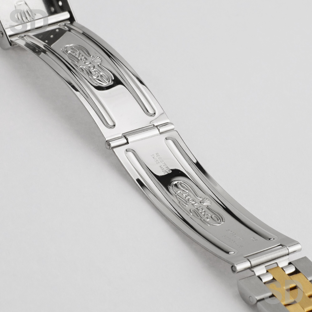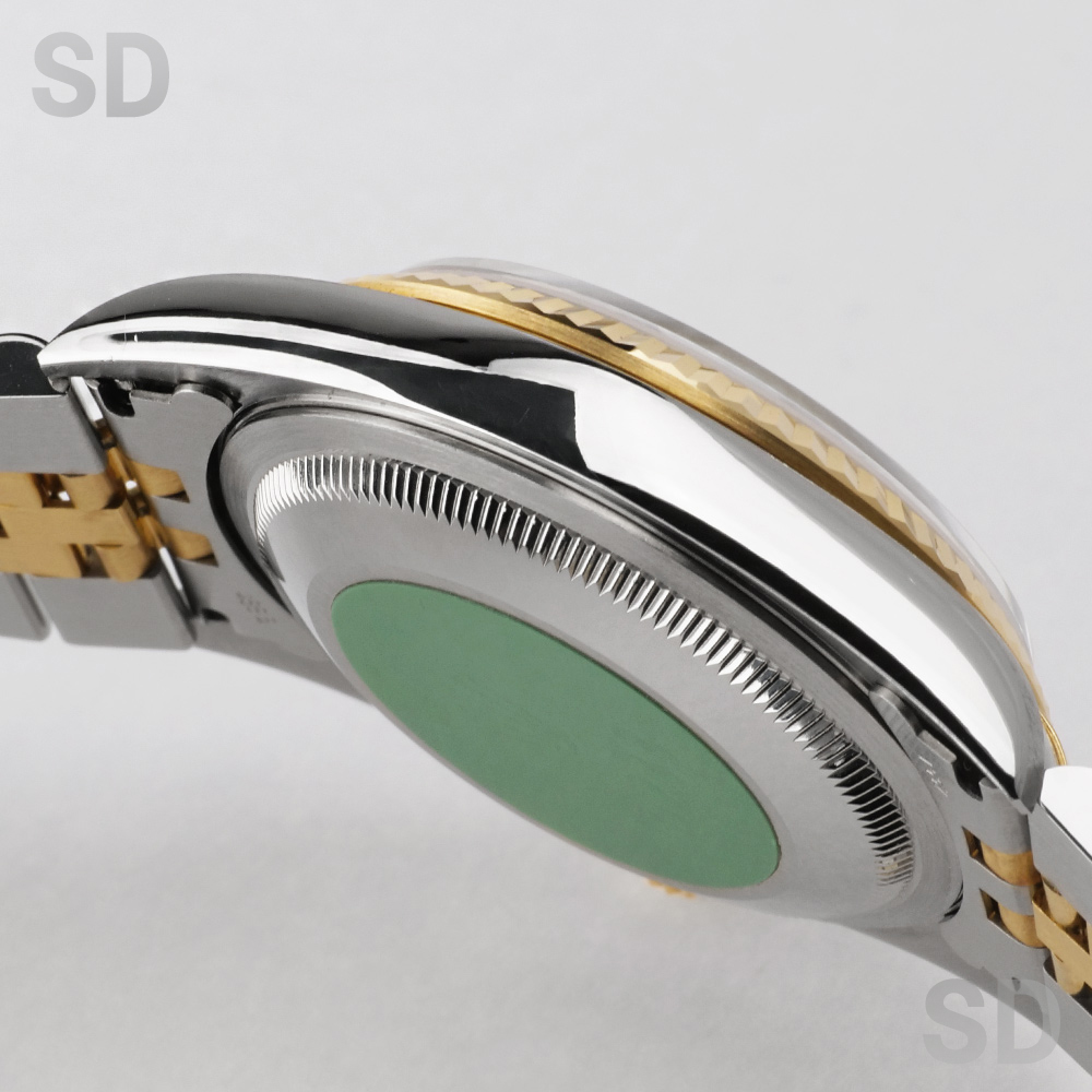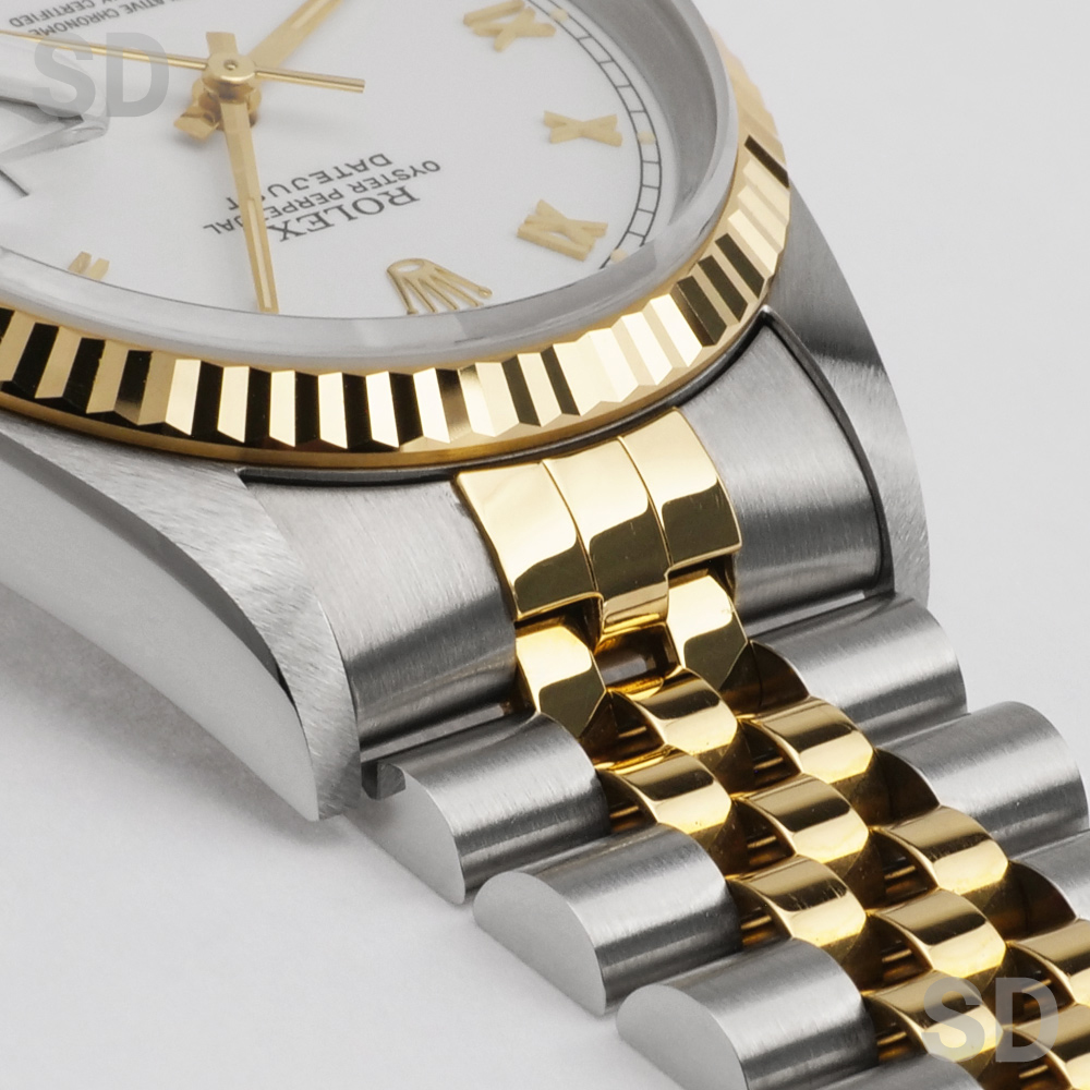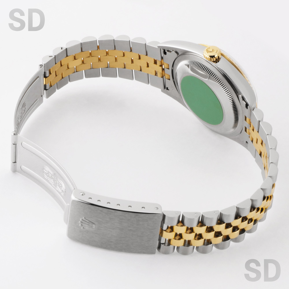 フルーテッドベゼルにジュビリーブレスレットをセットしたイエローゴールドコンビはデイトジャストの中でも代表格とされるデザイン。1990年代初期に”ロレックス×コンビ”から「ロレコン」と呼ばれ一世を風靡したこちらのモデルは、世代を超えて現在でも愛される定番モデルとなりました。現行モデルから数え2世代前のモデルではありますが、旧式モデルとはいえロレックスの代表的な最高ムーブメントとされるCal.3135搭載で精度にも定評がありケースのシャープさとブレスレットの軽さにより普段使いとしても扱いやすく、あえて旧型を選ばれる方も多いほど、当店一番人気のモデルです。