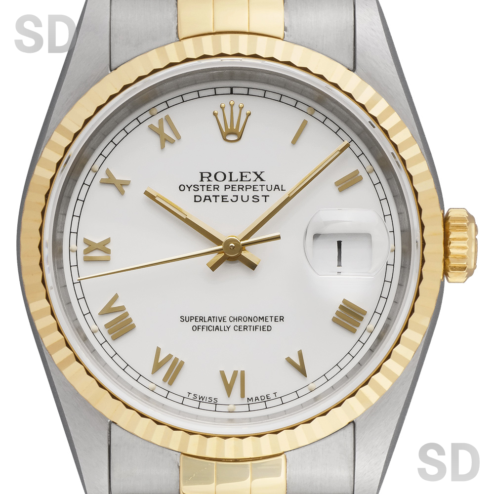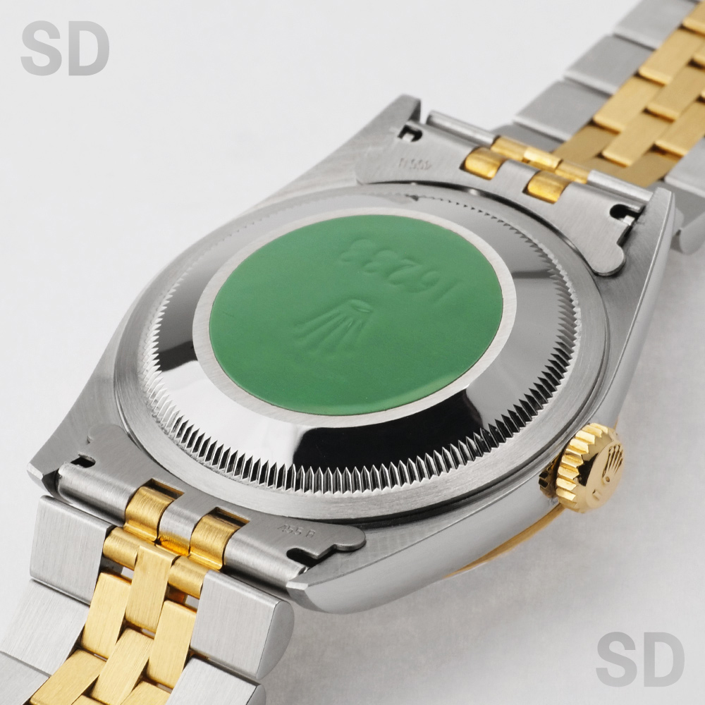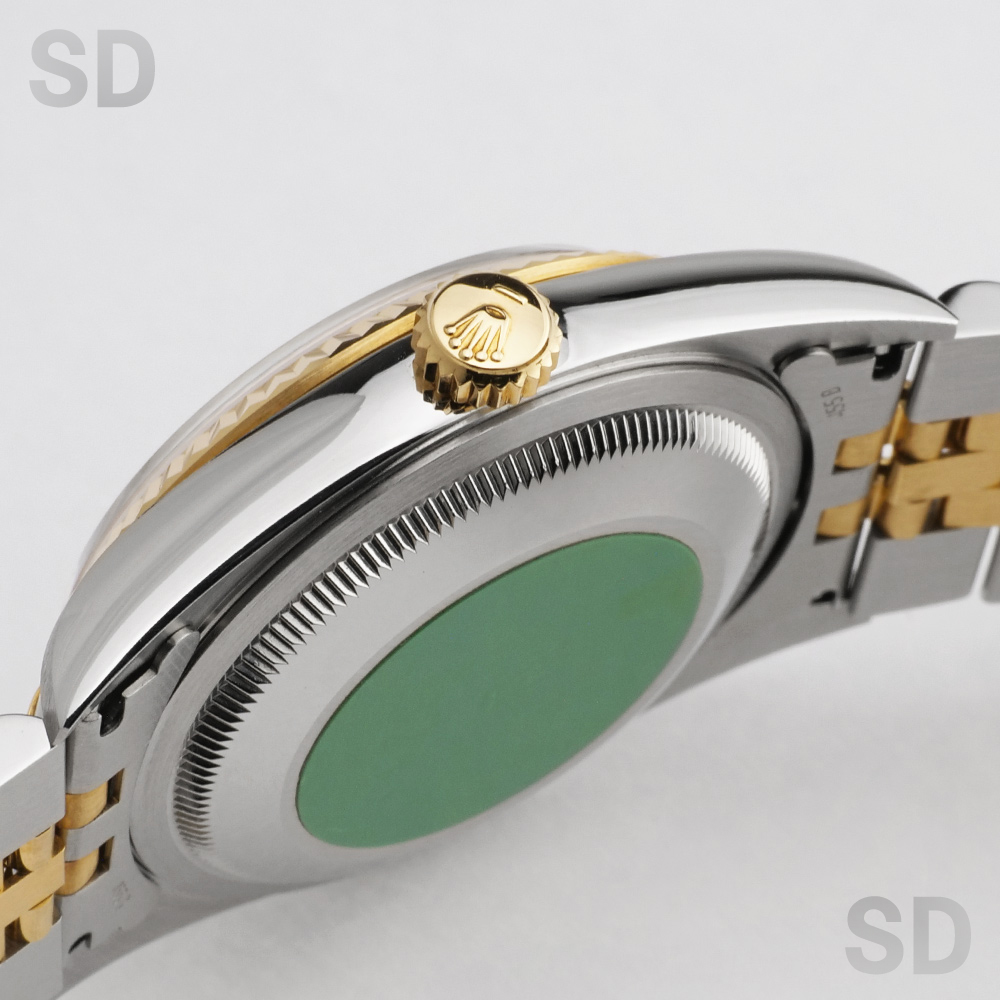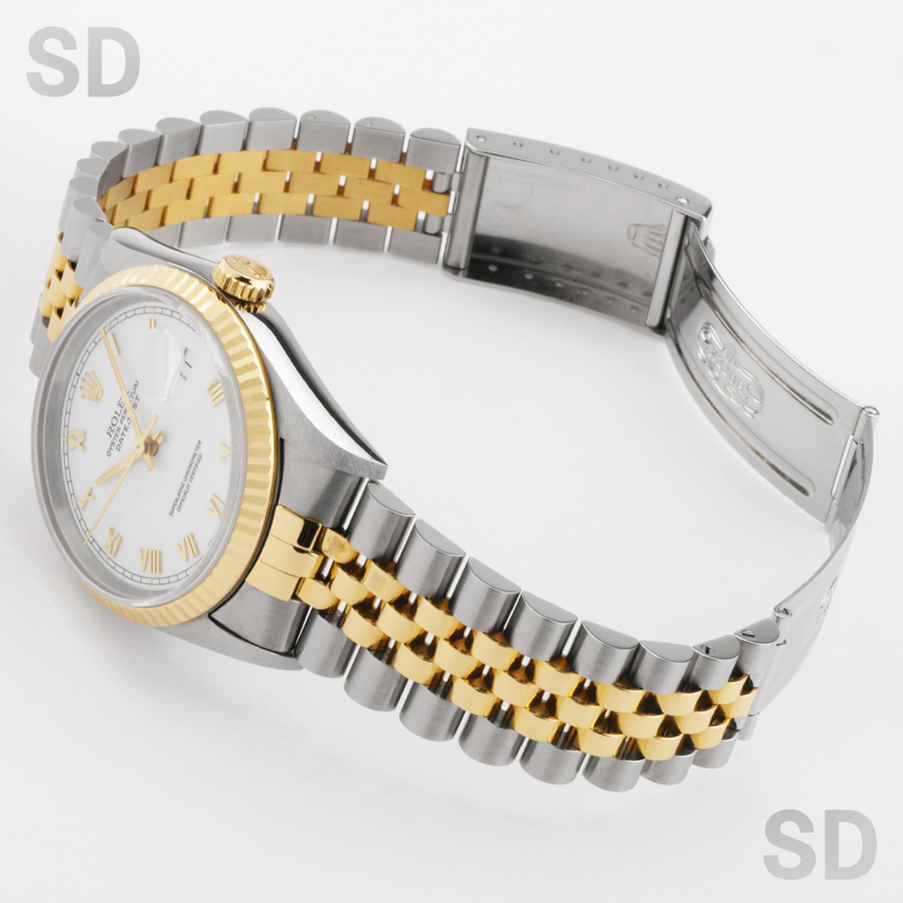 フルーテッドベゼルにジュビリーブレスレットをセットしたイエローゴールドコンビはデイトジャストの中でも代表格とされるデザイン。1990年代初期に”ロレックス×コンビ”から「ロレコン」と呼ばれ一世を風靡したこちらのモデルは、世代を超えて現在でも愛される定番モデルとなりました。現行モデルから数え2世代前のモデルではありますが、旧式モデルとはいえロレックスの代表的な最高ムーブメントとされるCal.3135搭載で精度にも定評がありケースのシャープさとブレスレットの軽さにより普段使いとしても扱いやすく、あえて旧型を選ばれる方も多いほど、当店一番人気のモデルです。