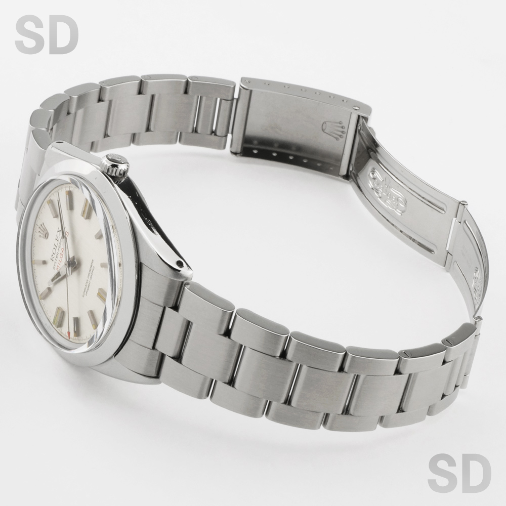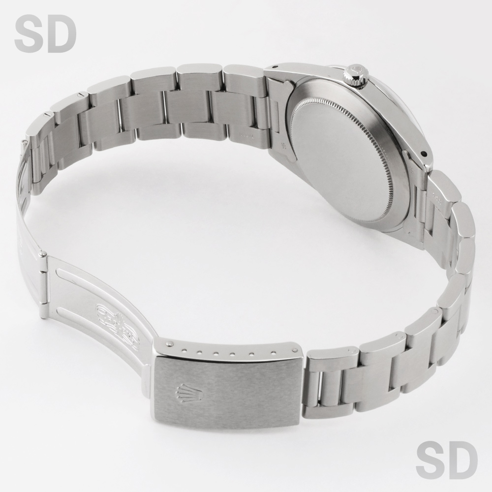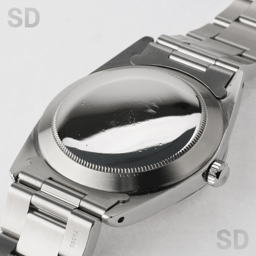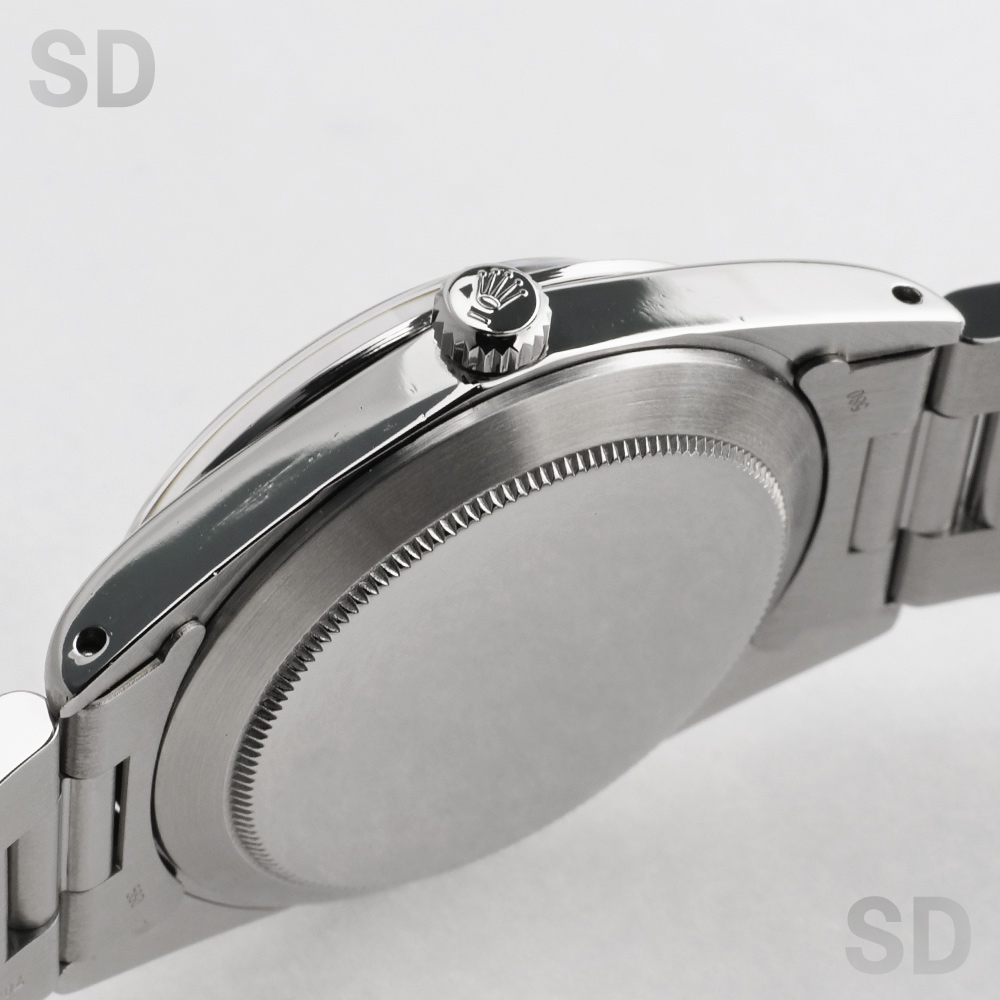 状態です。外装につきましては、日本ロレックスにて研磨仕上げが施されており、ロレックス特有の繊細で控えめなポリッシュが実施されております。そのため、取りきれない擦り傷小傷がベゼルや裏蓋に残っておりますが、いずれも大きく目立つものではなく、特筆すべきダメージはございません。製造年を考慮していただければ良好なコンディションを維持しております。