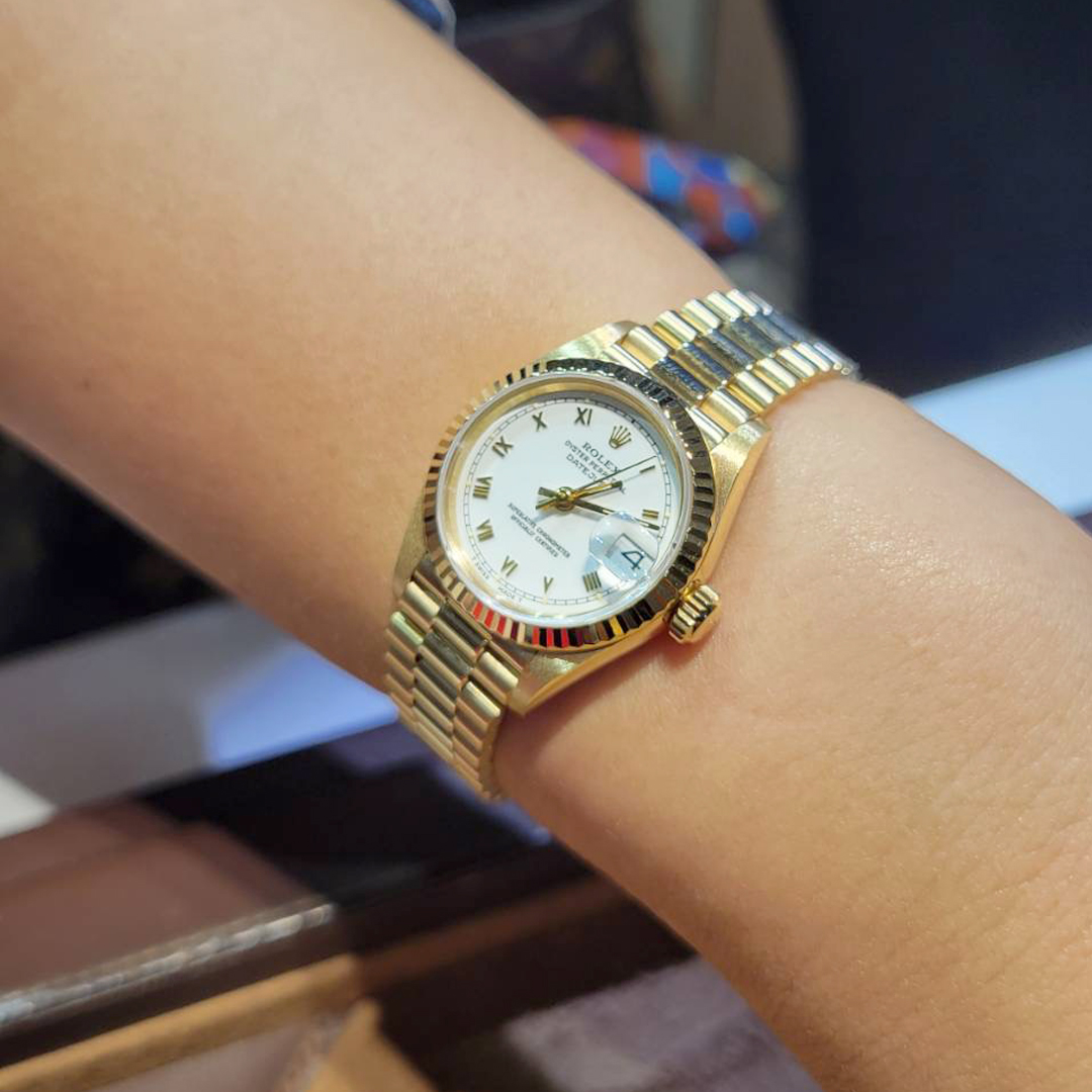 フルーテッドベゼルにジュビリーブレスレットを装備したこちらのモデルは、古くから愛されるデイトジャストを象徴するデザイン。こちらの個体にセットされている落ち着きあるオリーブグリーンの文字盤には、6時位置にローマ数字の「VI」を模ったダイヤモンドがセッティングされています。さり気なく輝き、腕元を華やかに彩るアクセサリーとしても最高のモデル。ファッションの一部としても着用出来、上品で美しい1本です。