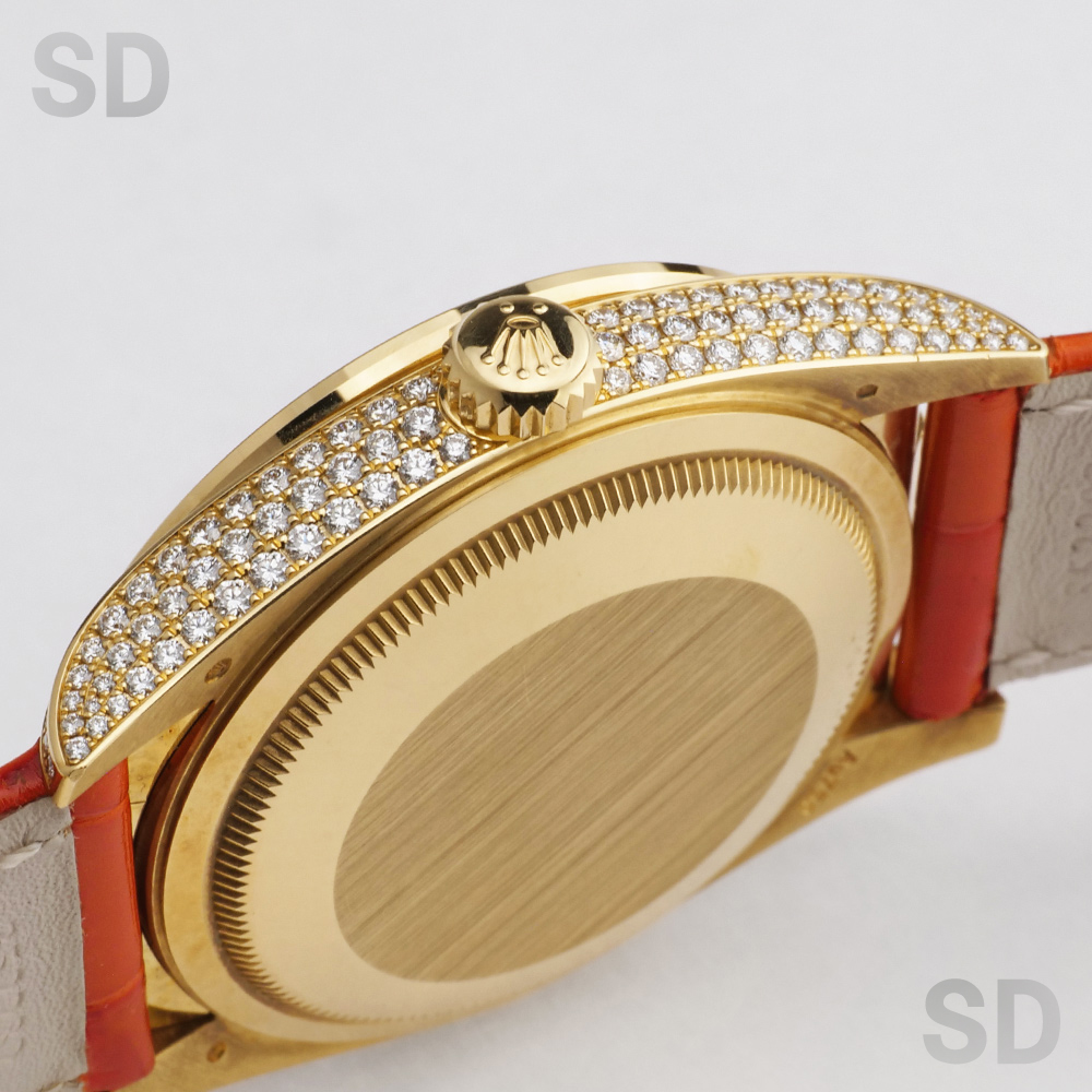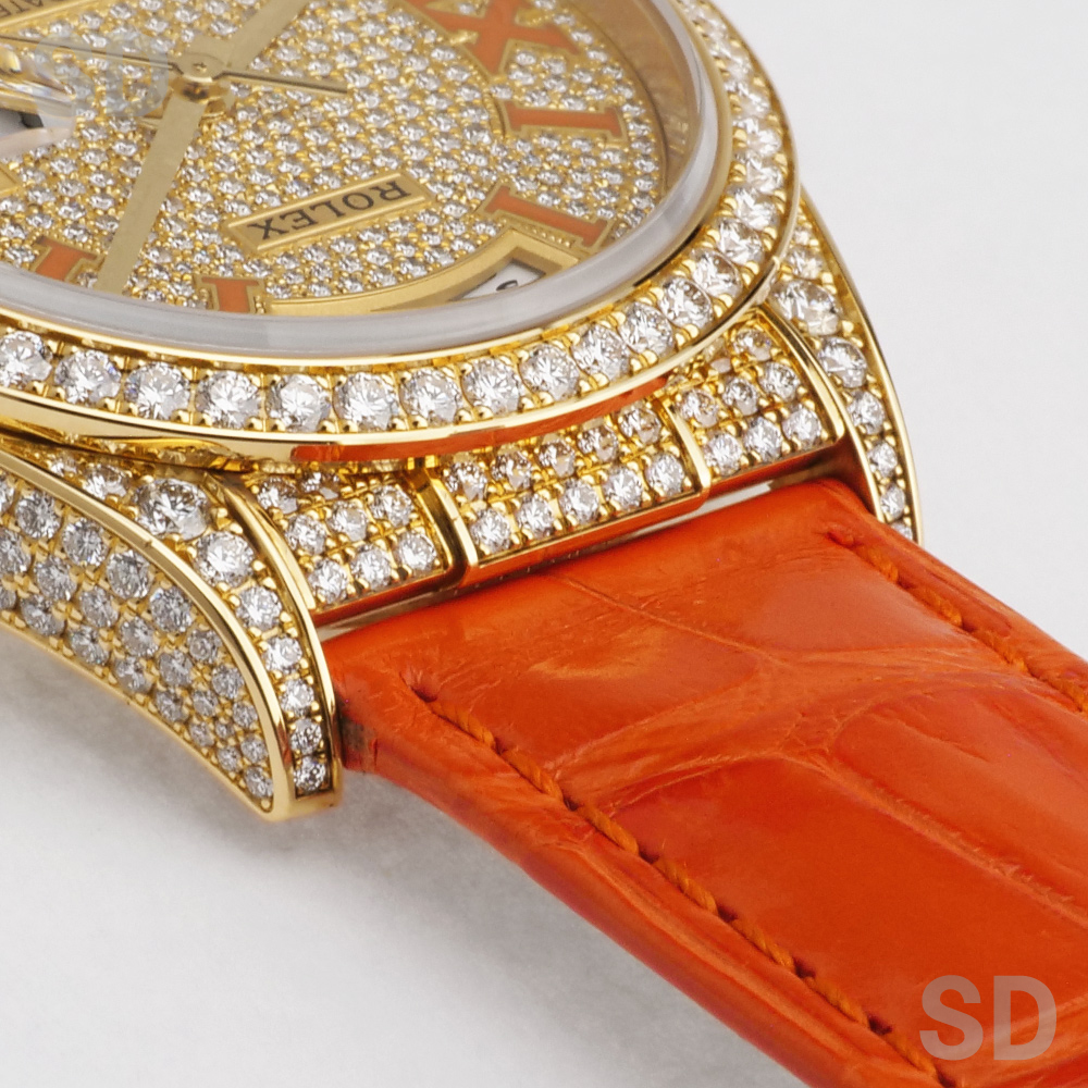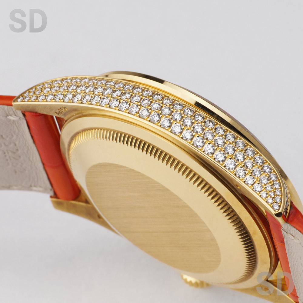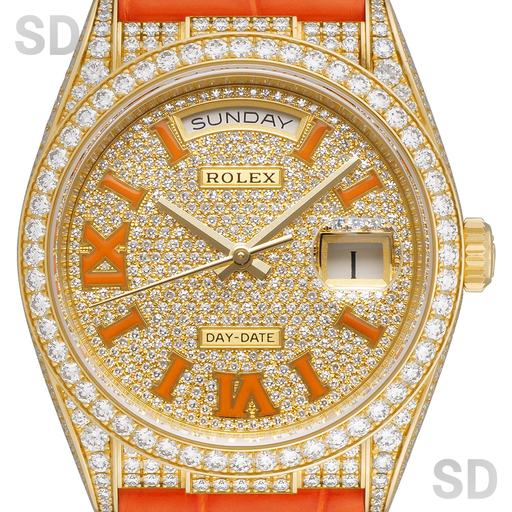 ロレックスの最高峰モデルとされるデイデイト。こちらのモデルは、2021年に登場したカタログ未掲載のシークレットモデルです。ケースサイドに166個、ラグに36個、フラッシュフィットに52個、ベゼルに52個、バックルに61個、文字盤に450個のブリリアントカットダイヤモンドがセットされており、まさに贅沢な特別モデル。文字盤のローマ数字はオレンジ(コーラル)エナメル。レザーベルトもインデックスに合わせ同色で統一されており、ポップでありながらもバランスのとれたゴージャスで素敵な1本となっております。