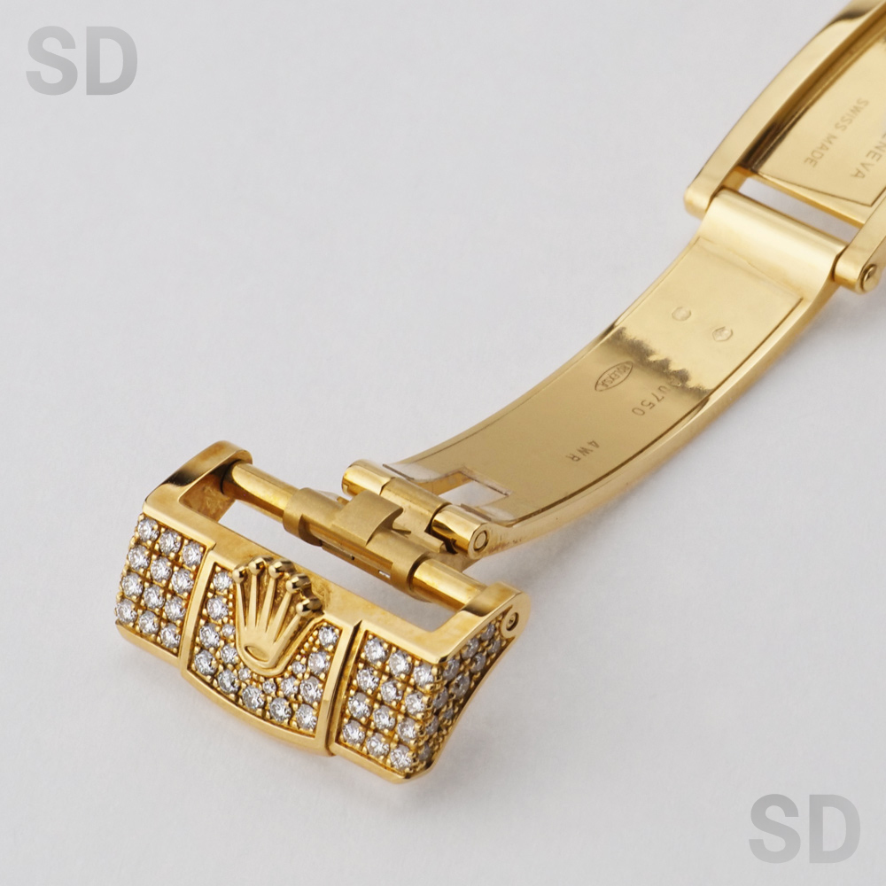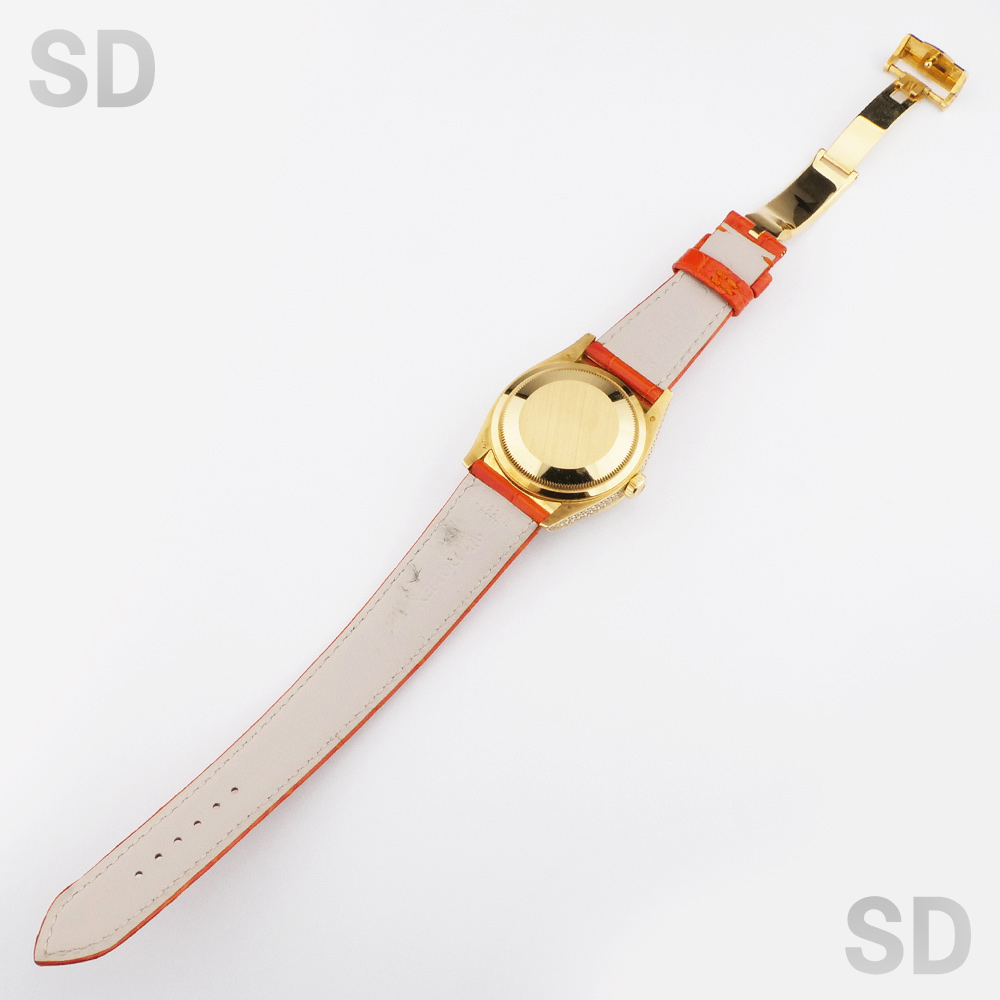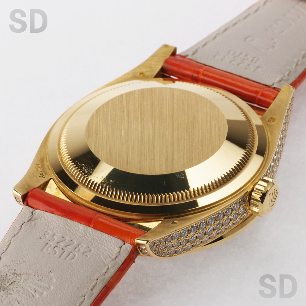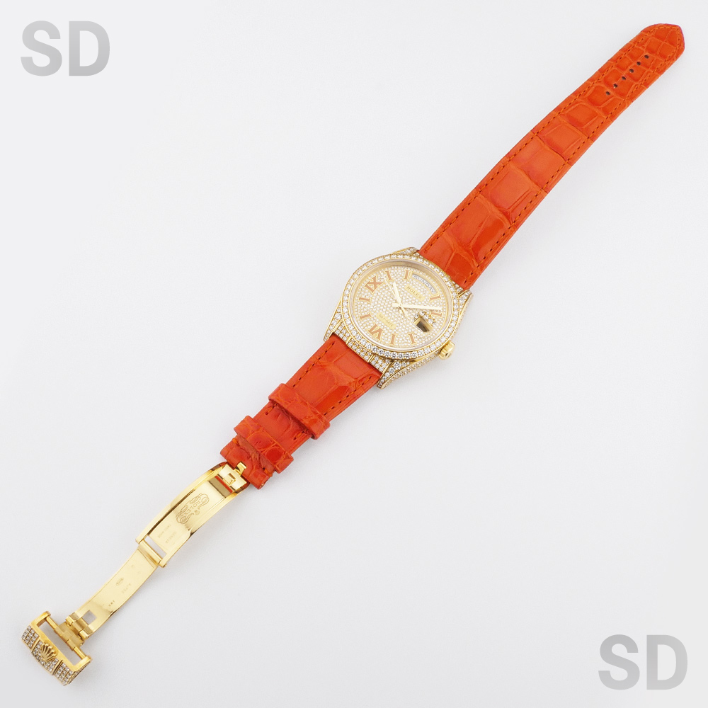 ロレックスの最高峰モデルとされるデイデイト。こちらのモデルは、2021年に登場したカタログ未掲載のシークレットモデルです。ケースサイドに166個、ラグに36個、フラッシュフィットに52個、ベゼルに52個、バックルに61個、文字盤に450個のブリリアントカットダイヤモンドがセットされており、まさに贅沢な特別モデル。文字盤のローマ数字はオレンジ(コーラル)エナメル。レザーベルトもインデックスに合わせ同色で統一されており、ポップでありながらもバランスのとれたゴージャスで素敵な1本となっております。