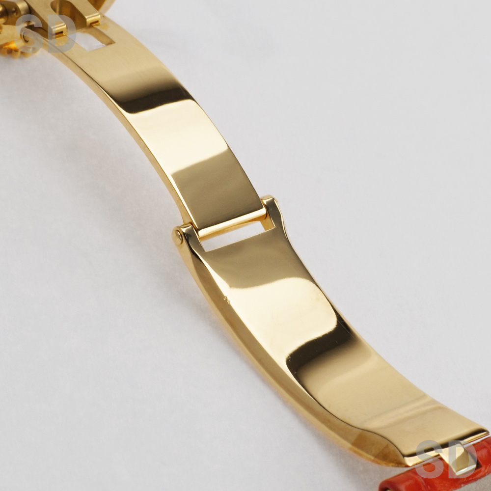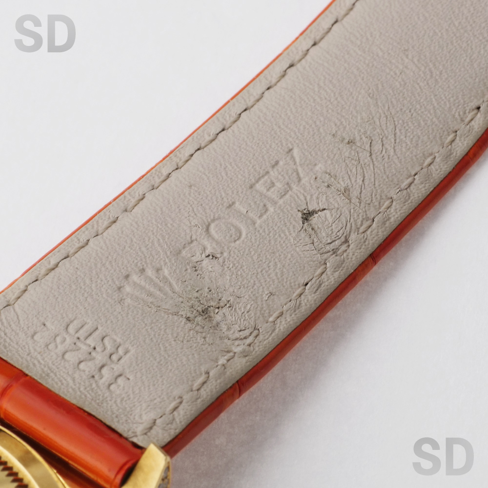 純正革ベルトはオレンジ色の光沢あるクロコダイルレザーですが、子穴を使用した形跡はなく、レザー自体の使用感はないものの裏面に一部擦れと破けがございます。