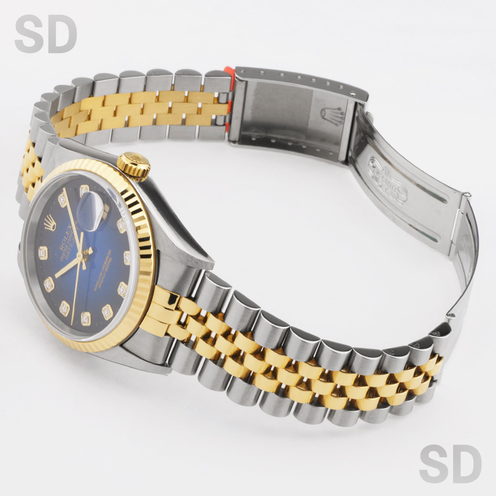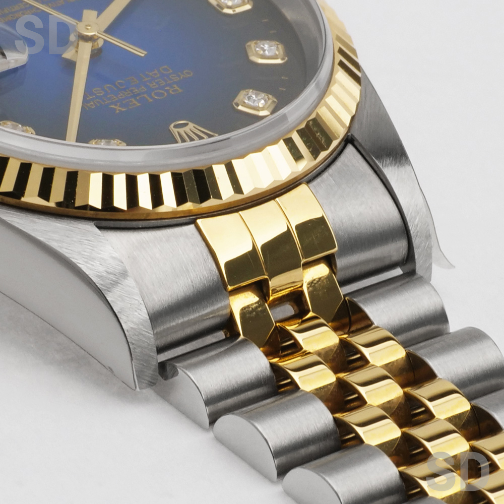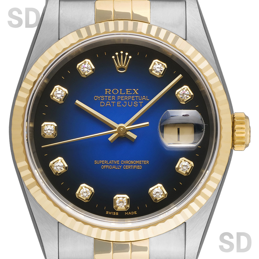 また、こちらはブルーグラデーションダイヤルがセットされた人気の高いモデル。近年オンブレダイヤルと称される文字盤が登場し、改めてグラデーションダイヤルが再評価されております。インデックスのダイヤモンドがさり気なく輝く上品な1本。とても煌びやかで美しいモデルであり末永くお使い頂く上でも流行り廃りもなく飽きのこない最高の1本です。