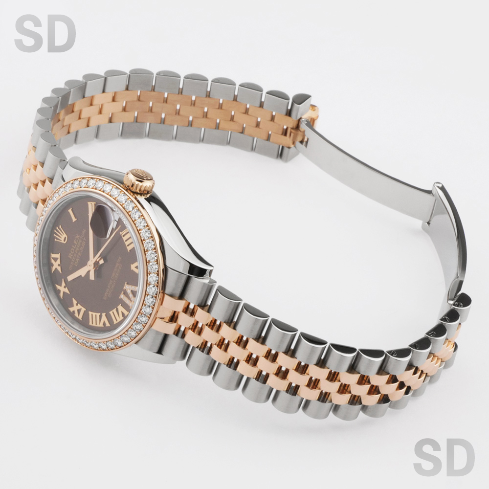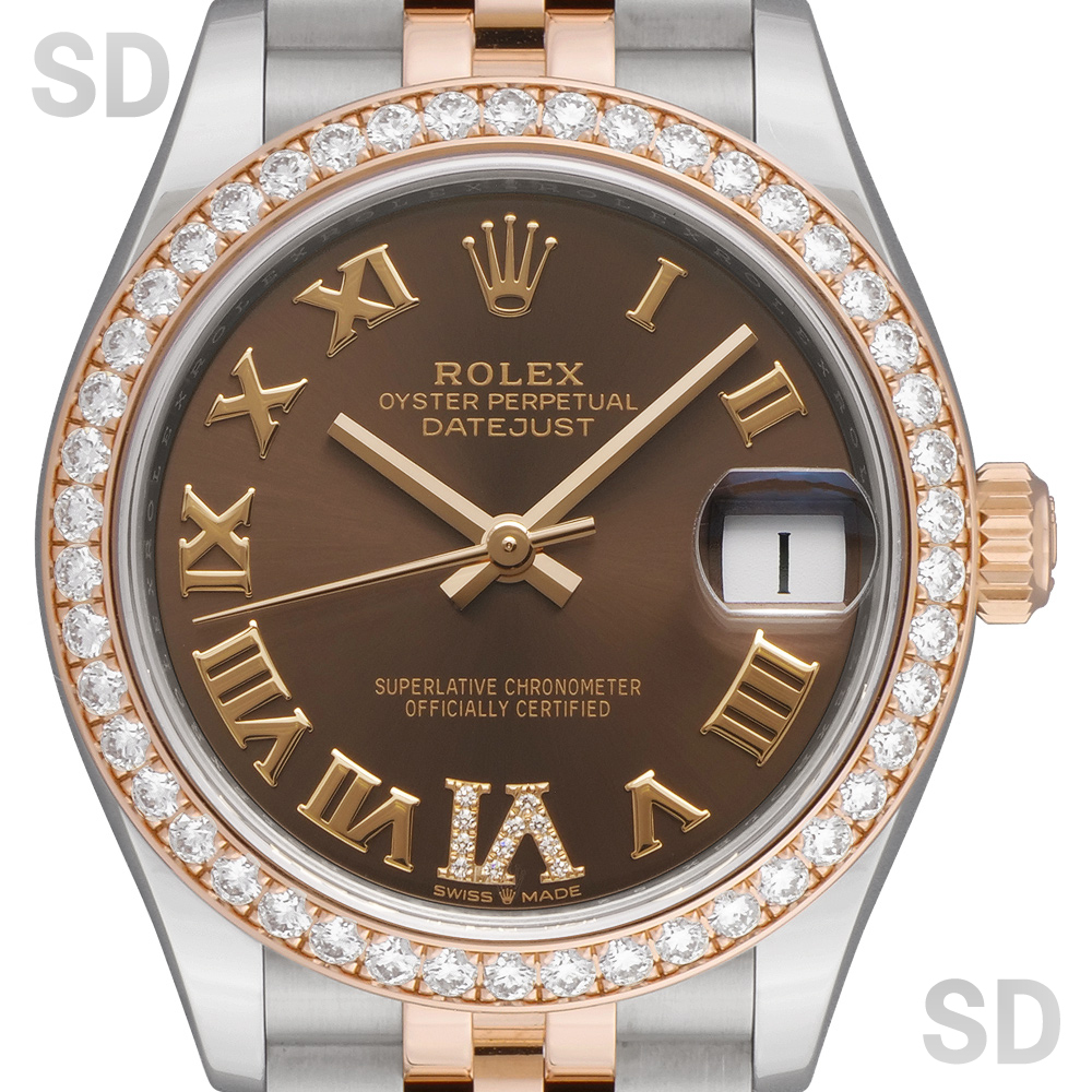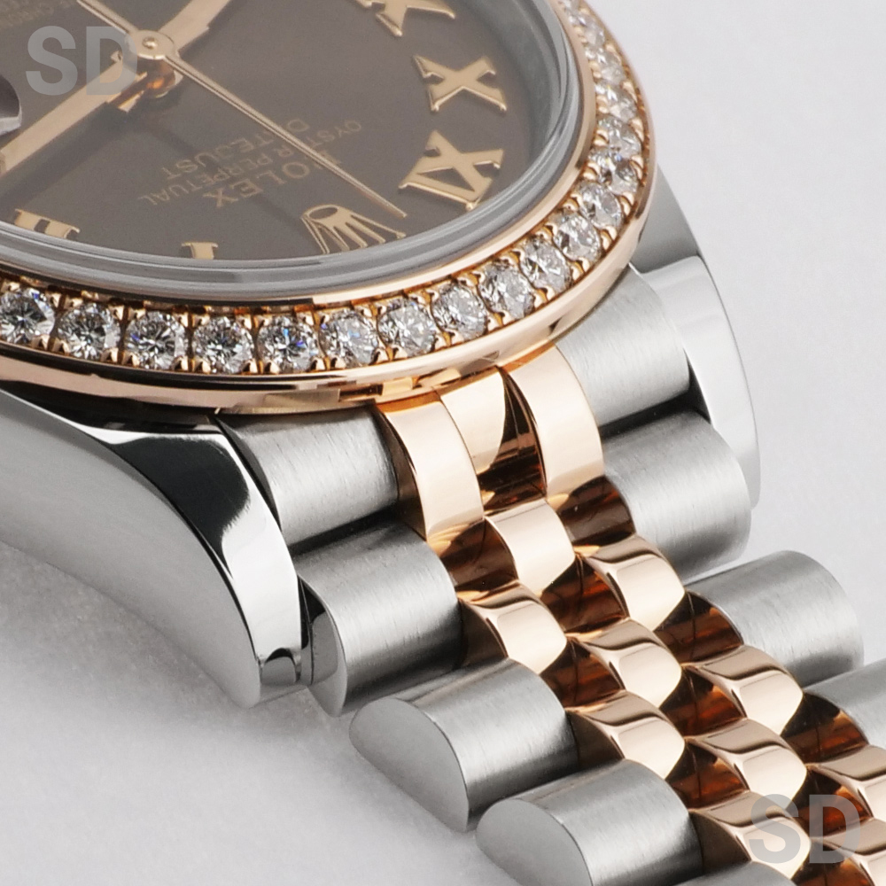 こちらのモデルは最新鋭ムーブメントCal.2236を搭載した現行モデル。女性でも少し大きめのサイズ感を希望される方にオススメの31mmケースのデイトジャストです。ダイヤモンドがセットされたベゼルにジュビリーブレスレットを装備し、エバーローズゴールドと相性抜群のチョコレートカラーの文字盤には6時位置にダイヤモンドで模られたローマ数字がとても煌びやかで上品な腕時計。腕元を華やかに彩るジュエリーとしても最高の1本です。