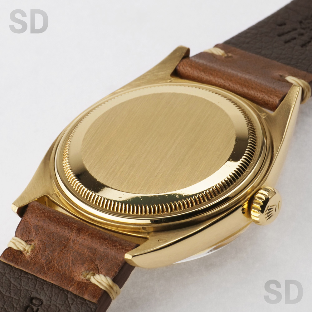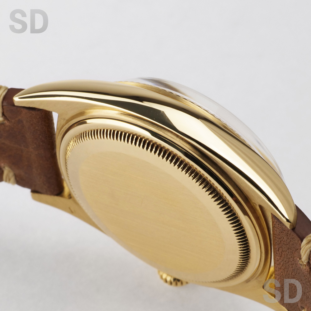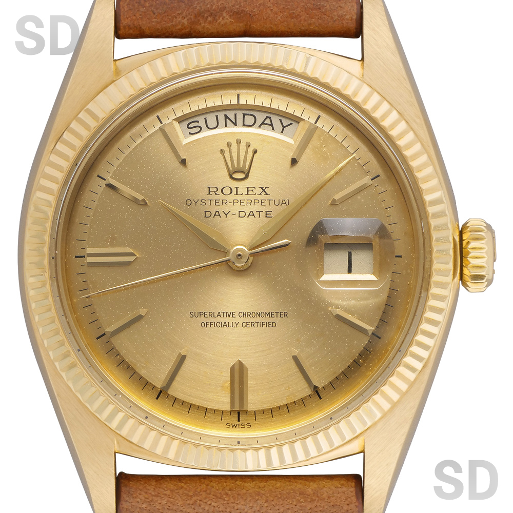 文字盤の外周が段落ちしているのが特徴的なこちらのモデルは1958年頃から1977年まで製造されていたデイデイト。こちらは主に初期個体に装備されているフルーテッドベゼルが細かい「コインエッジ」ベゼルの個体であり、文字盤にも美しいコンセントリックのような同心円状の仕上げが施されている珍しい1本。また、当時特有となるアルファハンドも含めヴィンテージテイストが詰まったマニアには堪らない個体ではないでしょうか。