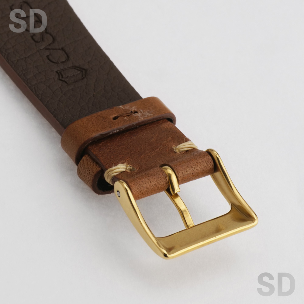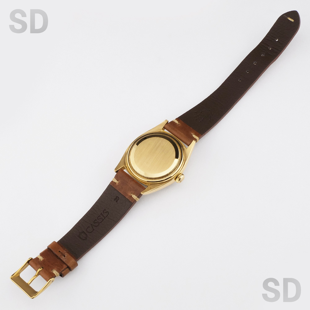 ケース裏にかつてブレスレットが装備されていたであろうへこみ跡が4カ所ございますが、現品にはキャメル色の社外革ベルトを装備しており、尾錠も社外品となります。革ベルトには展示傷程度のシワや痕がございますが、まだまだご使用いただけます。