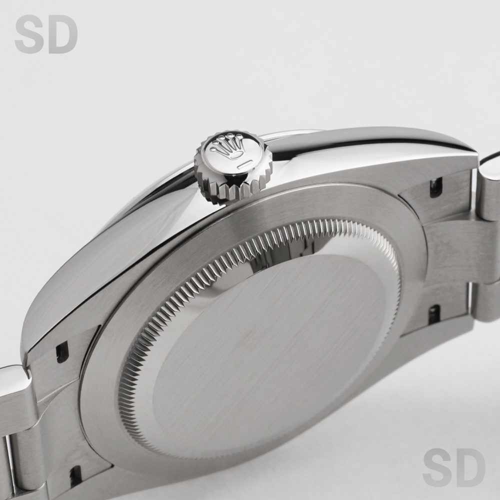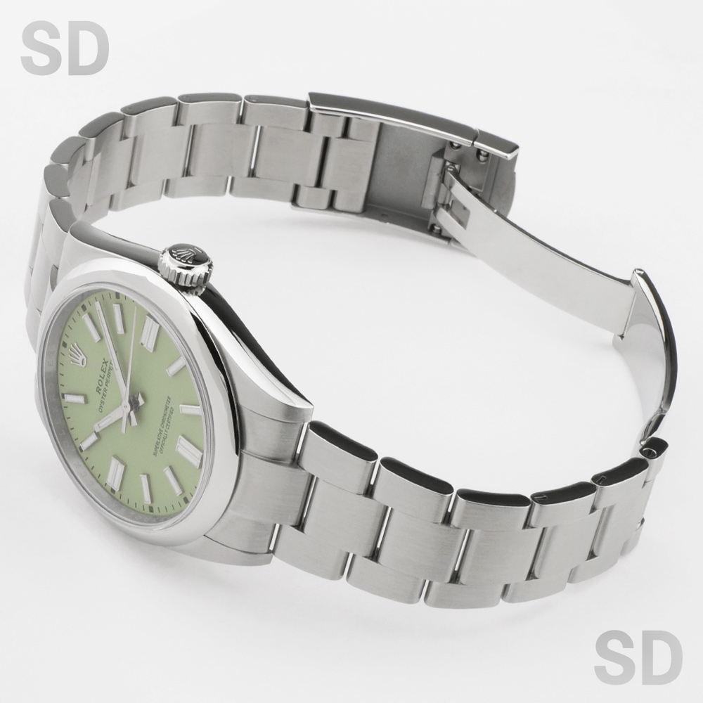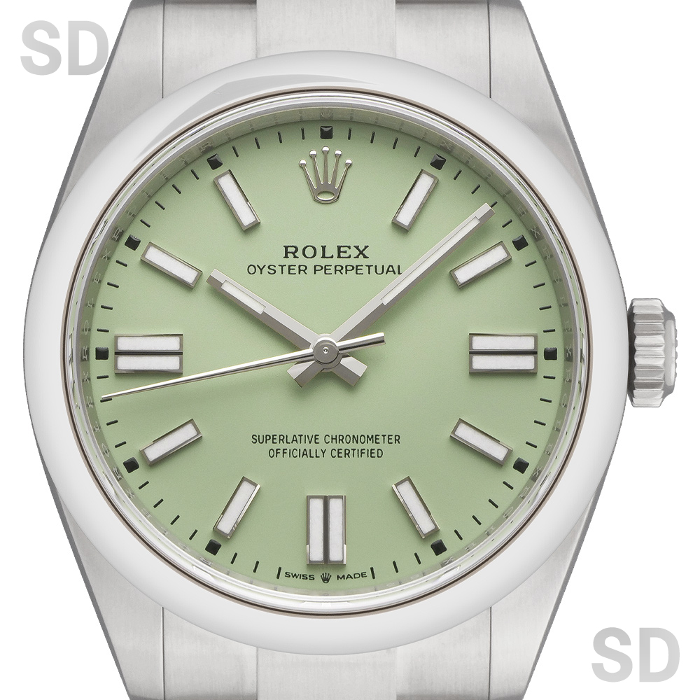 2025年のモデルチェンジで発表された新世代オイスターパーペチュアルは、ロレックスを代表するベーシックラインでありながら、完成度の高い意匠と実用性を兼ね備え、世界中の時計愛好家から高い支持を集めております。特に本モデルに採用されているピスタチオダイアルは、登場当初から瞬く間に話題を集め、市場流通量が極めて少なく入手困難な文字盤カラーのひとつとなっております。鮮やかでありながら上品な色調は、他のカラーバリエーション、例えばブライトブラックやシルバーと比較しても一際個性を放ち、腕元に華やかさと独自性を添えてくれます。そのため「シンプルでありながら他とは異なる一本を」とお考えの方に、高い所有欲を満たしてくれる一本といえます。