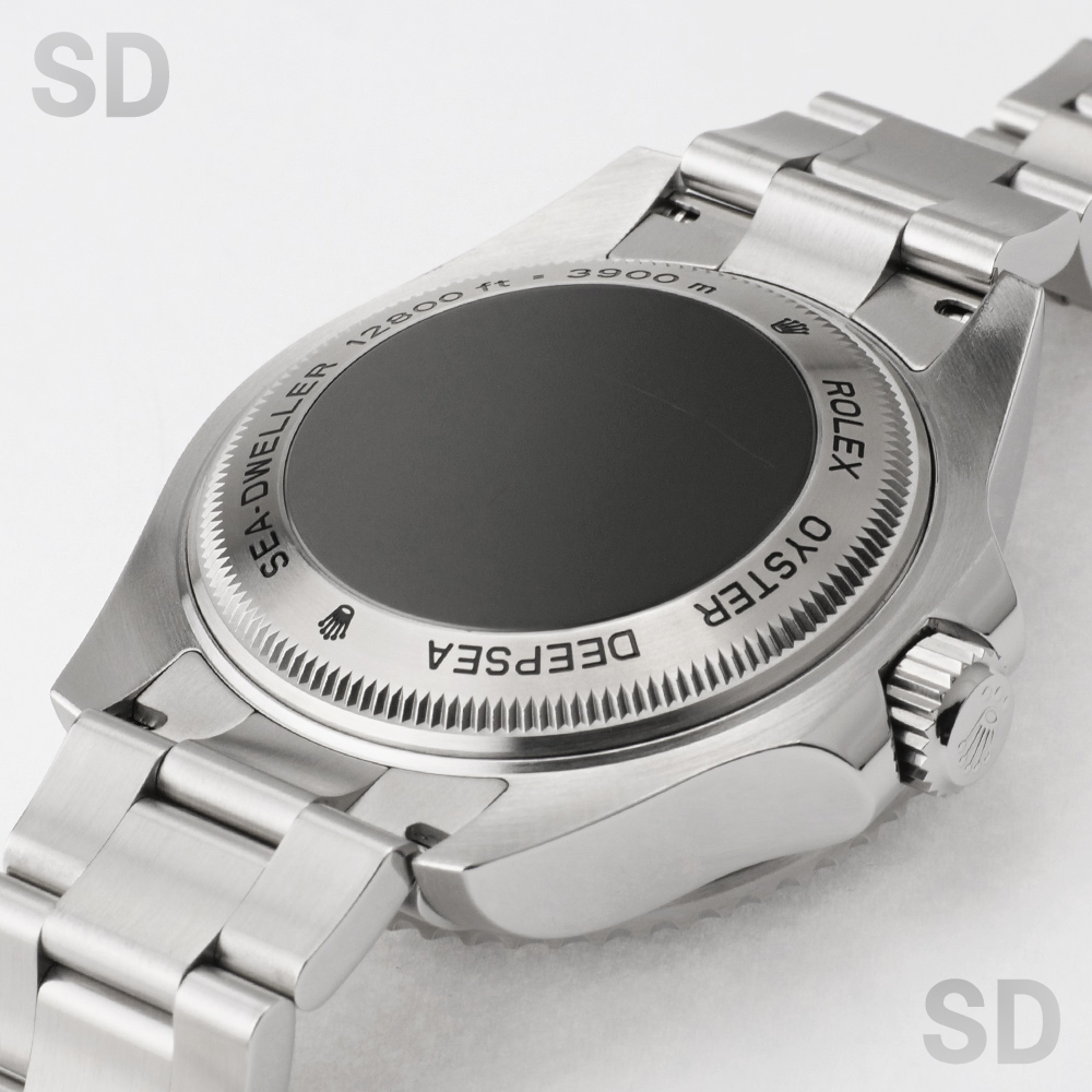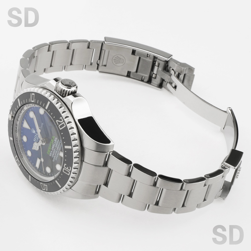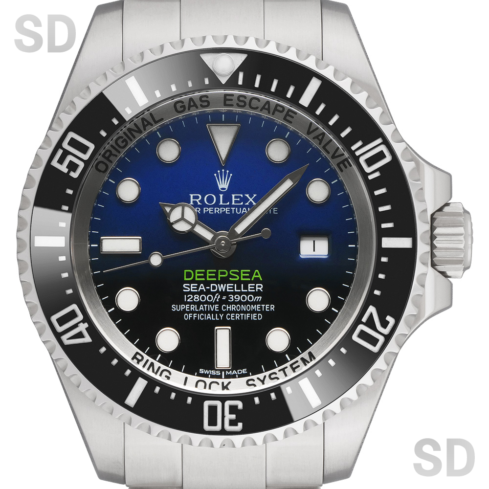 ロレックスの誇る超プロスペックダイバーズモデル、ディープシー。自社開発し特許を取得した、リングロックシステムを採用し、厚さ5.5mmのドーム型サファイアクリスタルガラスに窒素合金ステンレスで作られた耐圧リングと3.28mmのグレード5のチタン合金製の裏ブタにより防水性能は3900m。44mmというケースサイズに厚さは約17.7mmというビックサイズではありますが、その分存在感は抜群。