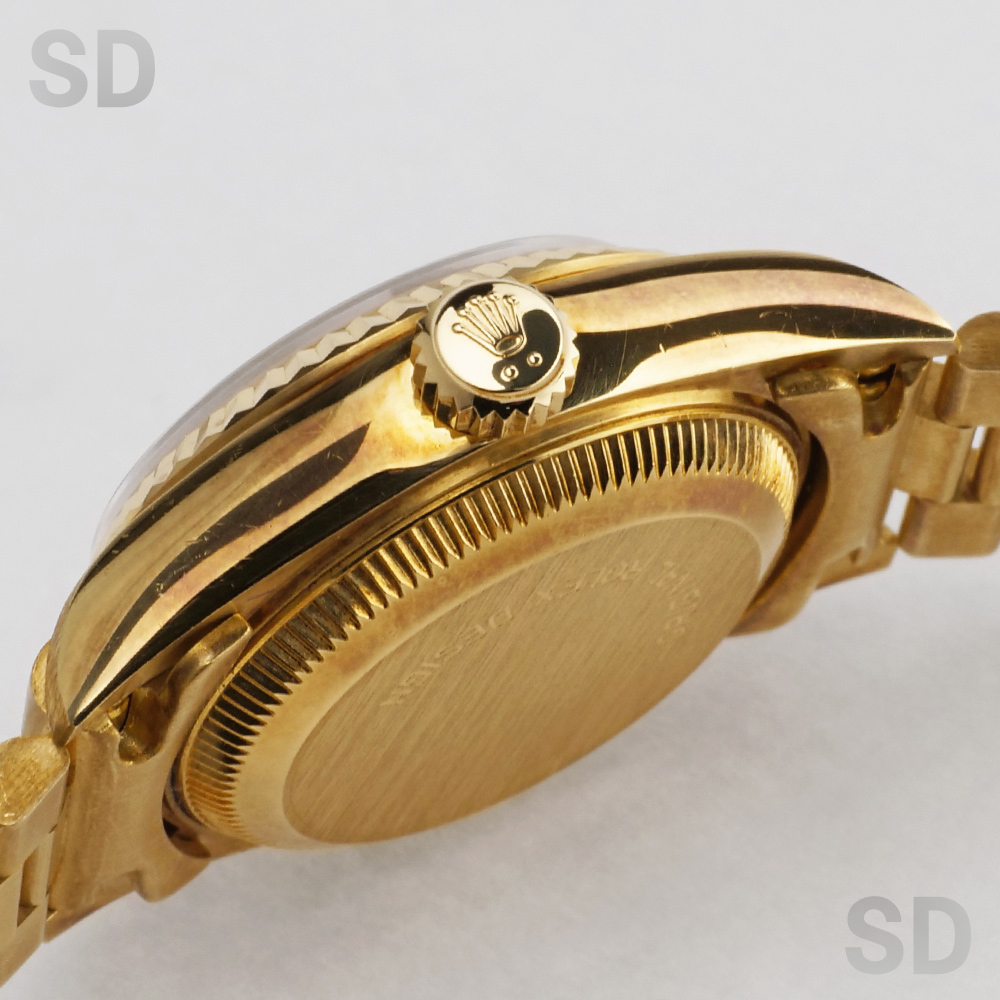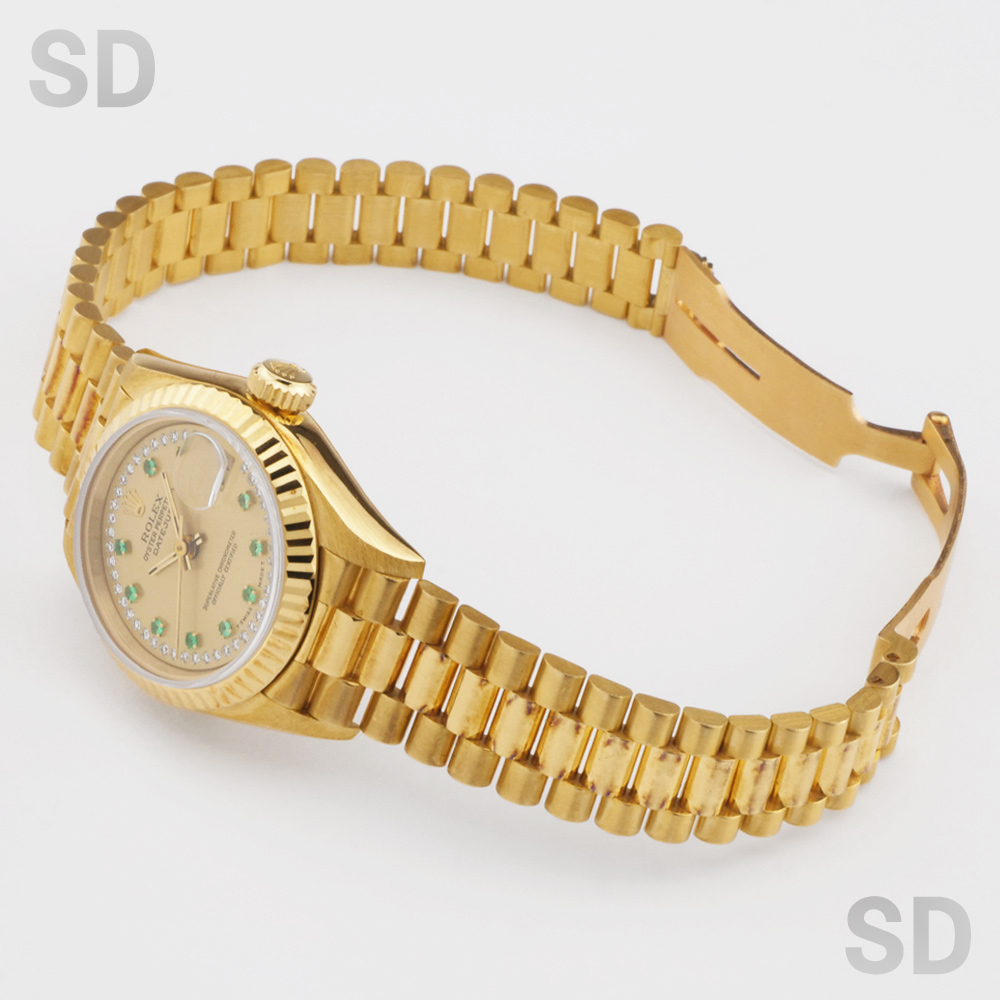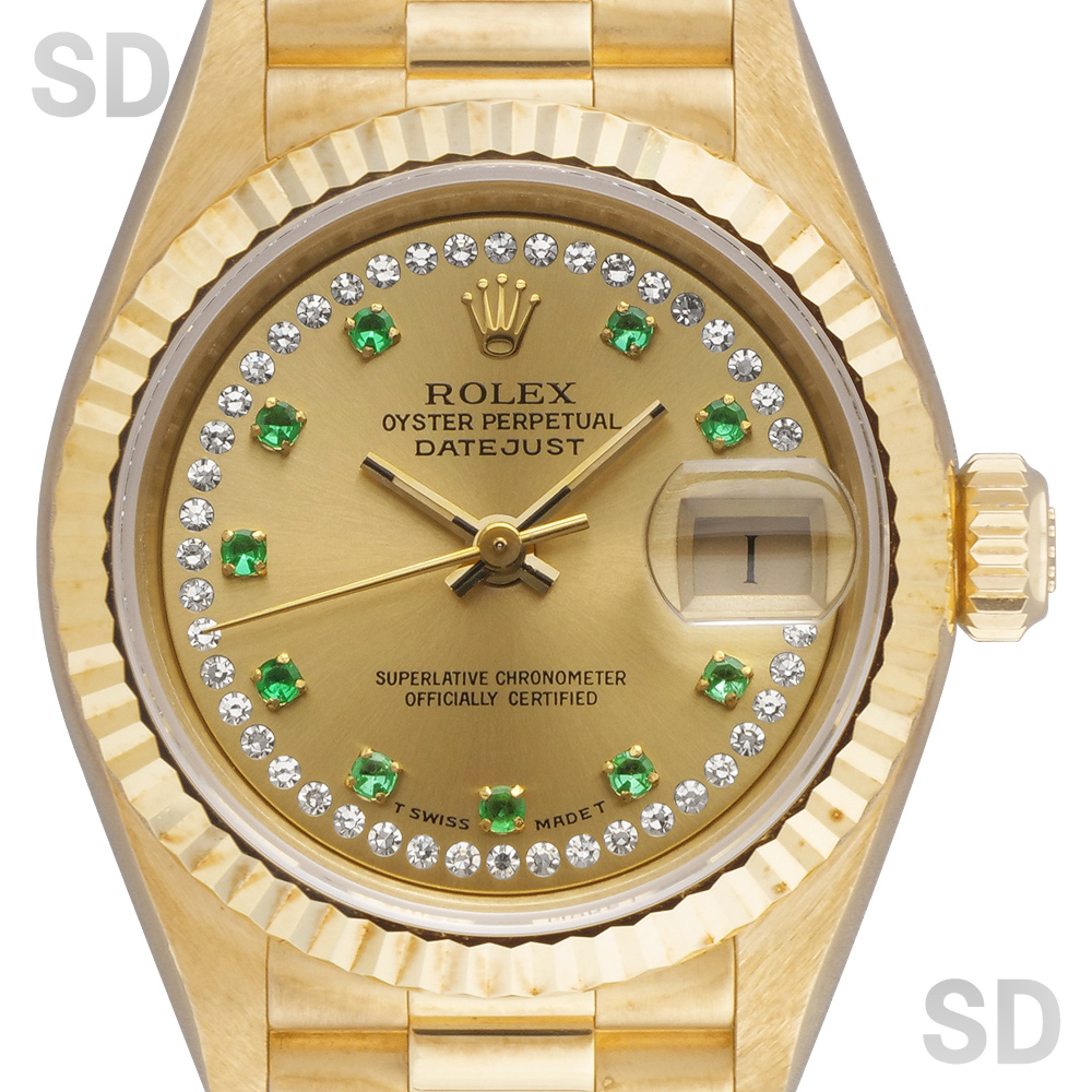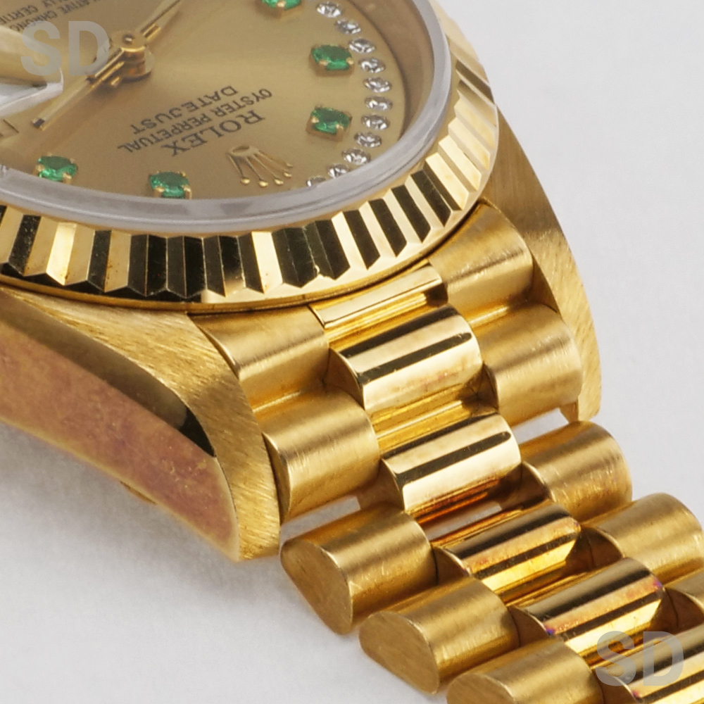 現在は生産が終了してしまった本個体は、ケース径26mmのレディースサイズに、イエローゴールド無垢のケースおよびブレスレットを備え、フルーテッドベゼルが上品な輝きを添える一本です。シャンパンダイアルには、45石のダイヤモンドと10石のエメラルドを配した通称ミリヤードダイアルを採用し、金無垢モデル専用のプレジデントブレスレットがロレックスならではの格式を演出します。また、サテン仕上げが施された外装により、後継モデルと比べて落ち着いた佇まいを感じさせる点も魅力です。