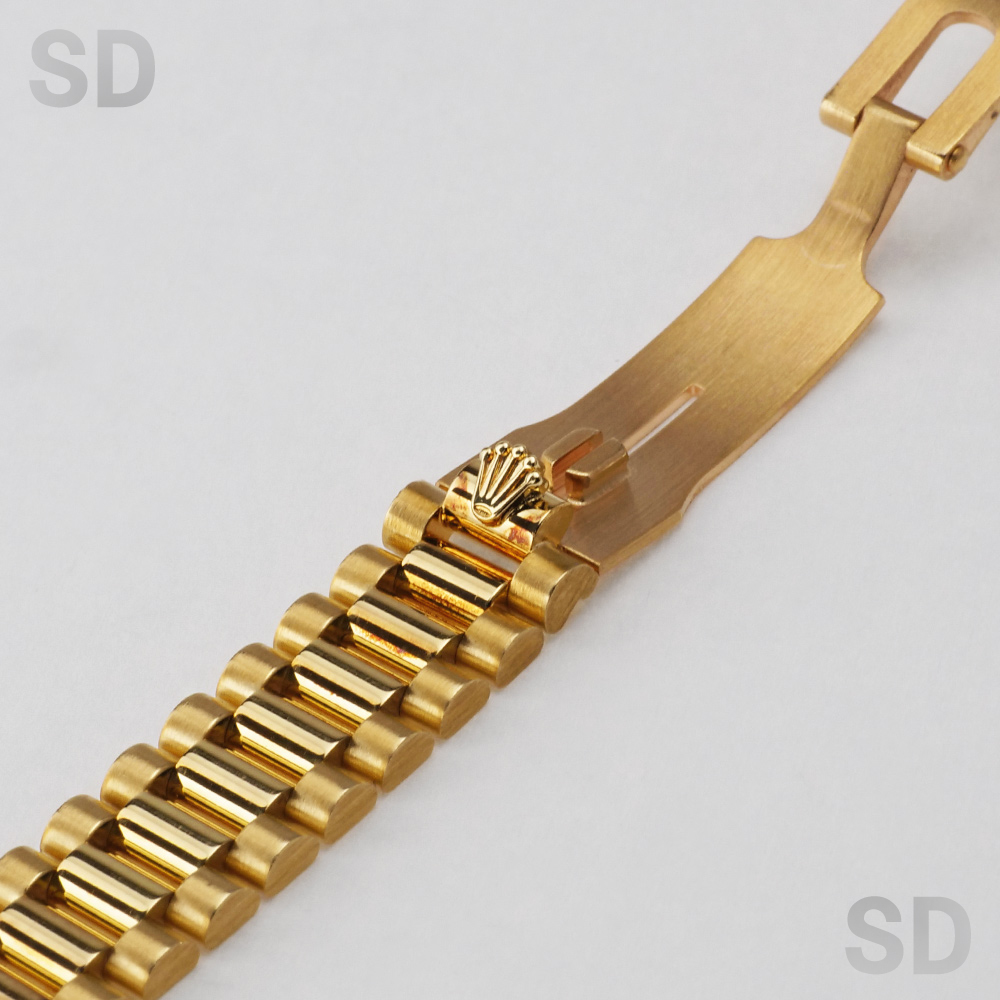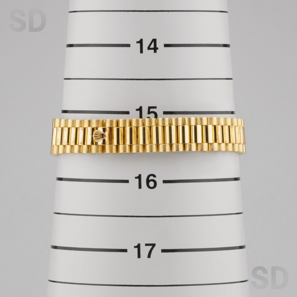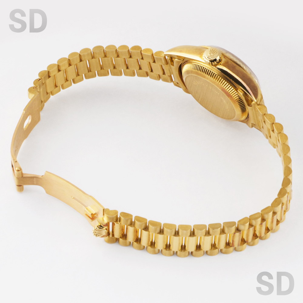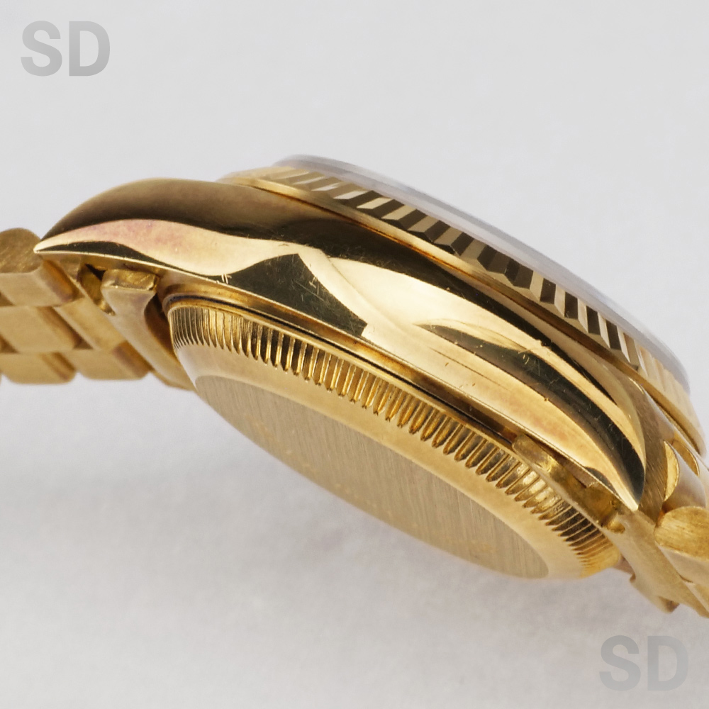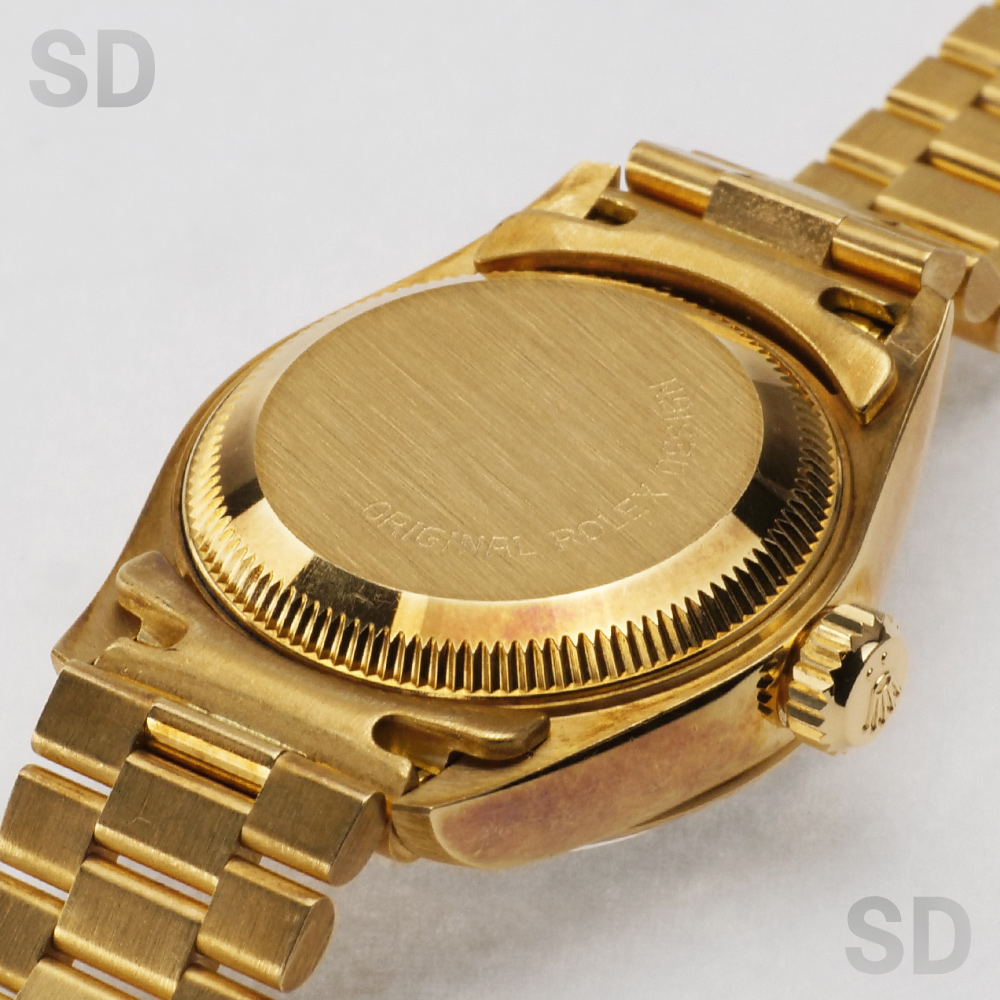 現在は生産が終了してしまった本個体は、ケース径26mmのレディースサイズに、イエローゴールド無垢のケースおよびブレスレットを備え、フルーテッドベゼルが上品な輝きを添える一本です。シャンパンダイアルには、45石のダイヤモンドと10石のエメラルドを配した通称ミリヤードダイアルを採用し、金無垢モデル専用のプレジデントブレスレットがロレックスならではの格式を演出します。また、サテン仕上げが施された外装により、後継モデルと比べて落ち着いた佇まいを感じさせる点も魅力です。