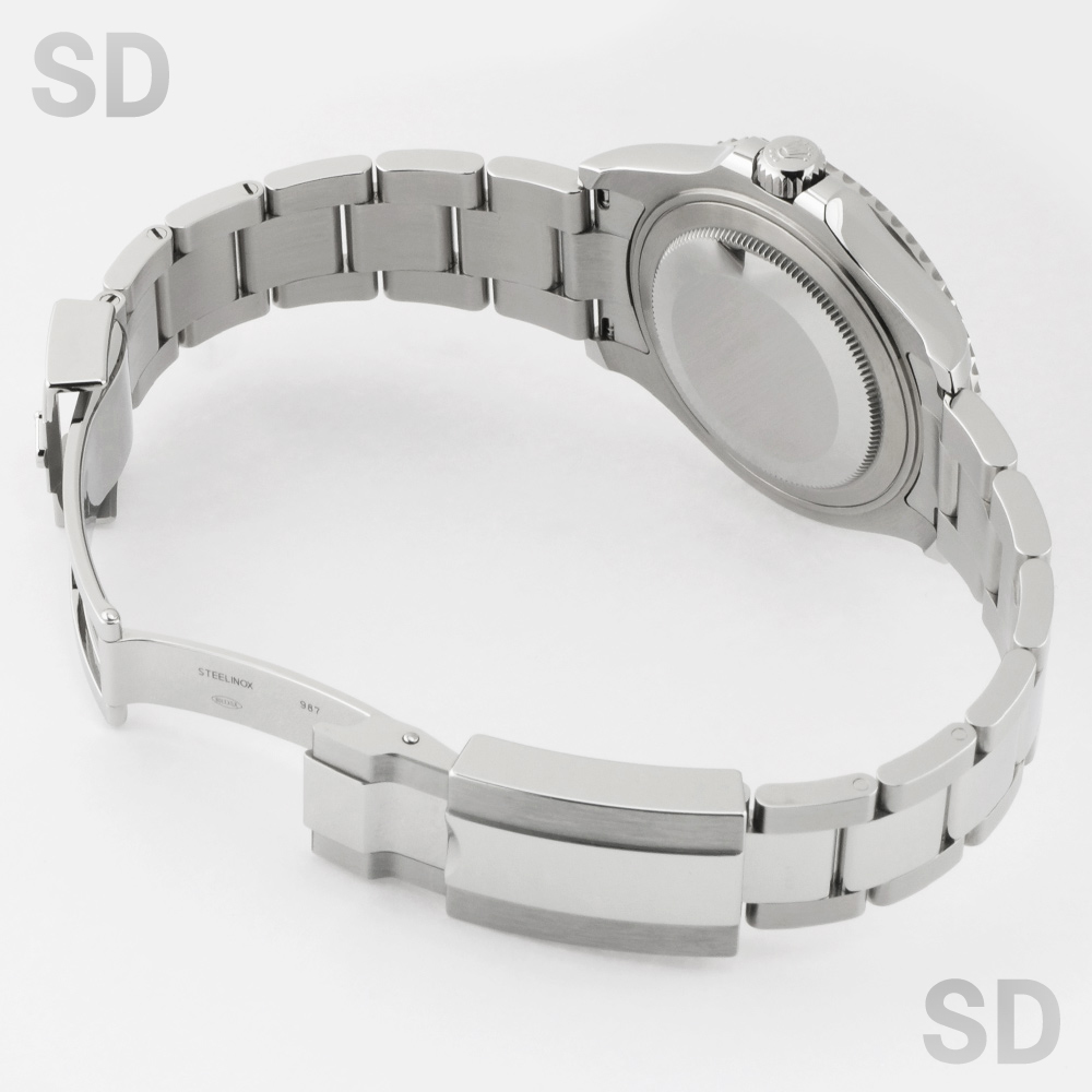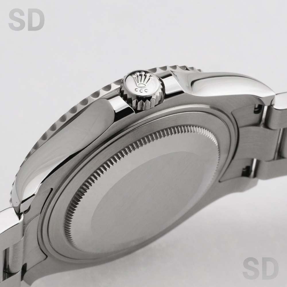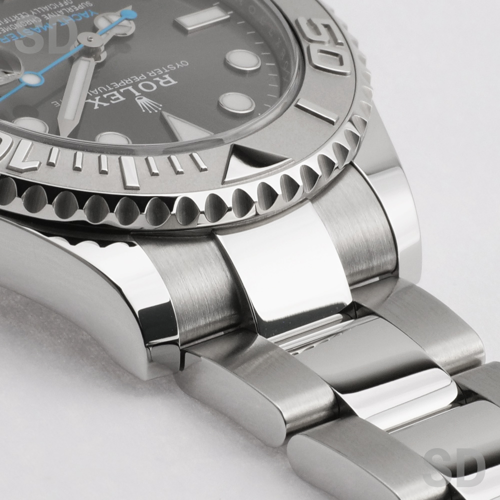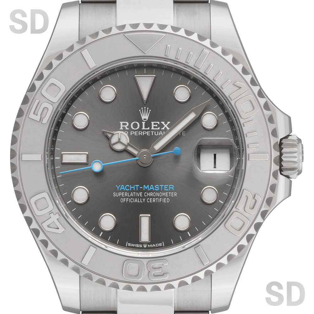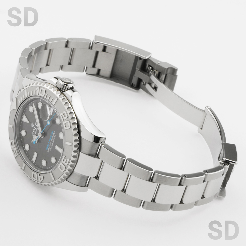 ロレックスで唯一のロレジウム(プラチナとステンレスのコンビ)モデルを持つヨットマスター。ベゼル全体にプラチナを使用しておりますが、表面にはブラスト仕上げが施され、数字と目盛りはポリッシュ仕上げにより光沢をもたせている為、立体感が生まれます。ヨットマスター40と比べこちらのヨットマスター37は少々小振りにも感じられるかもしれませんが、実際腕に着用されますと大きすぎず小さすぎずの絶妙なサイズ感。エレガントながらにスポーティでオンオフ問わず活用できるモデルです。