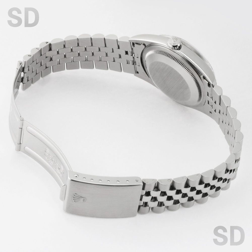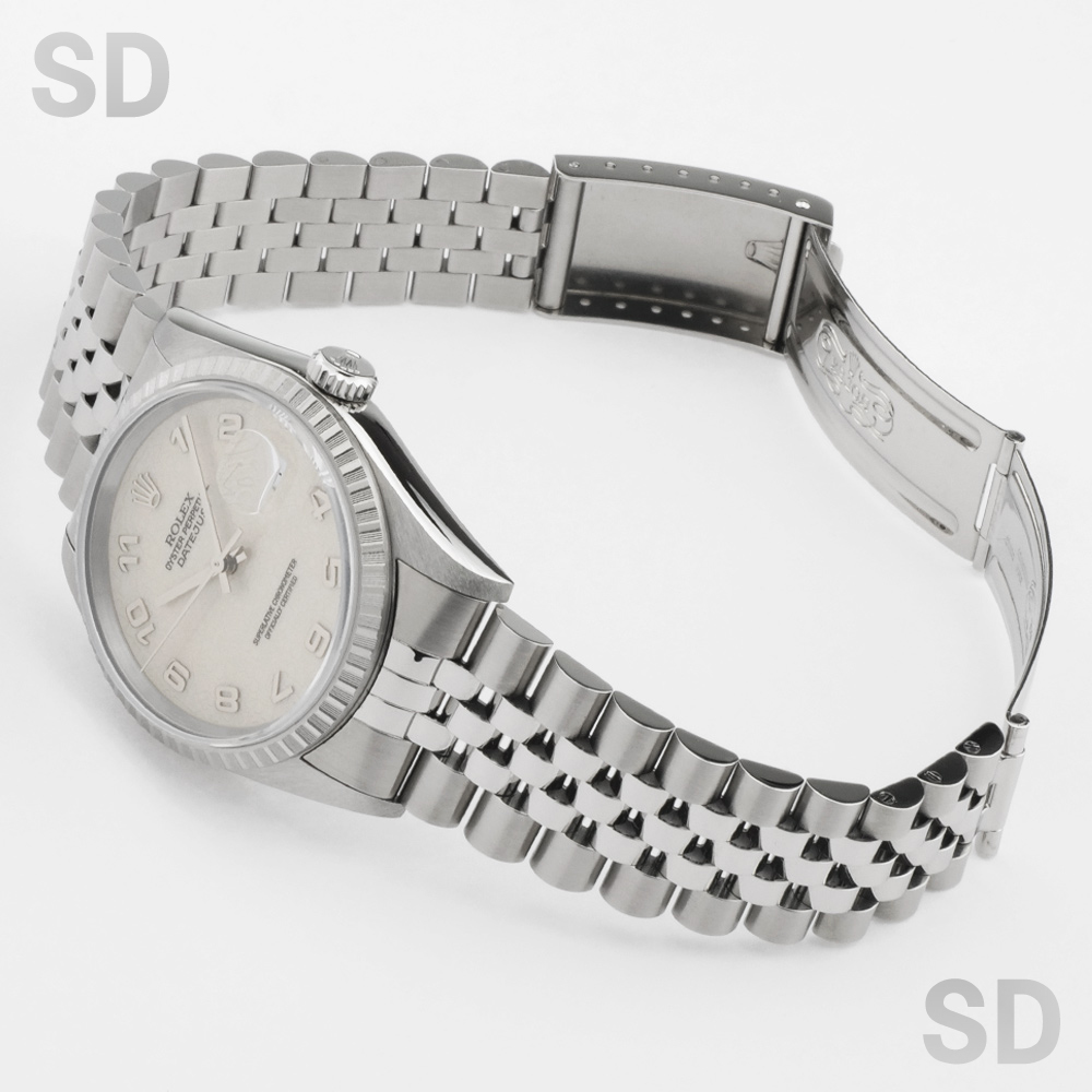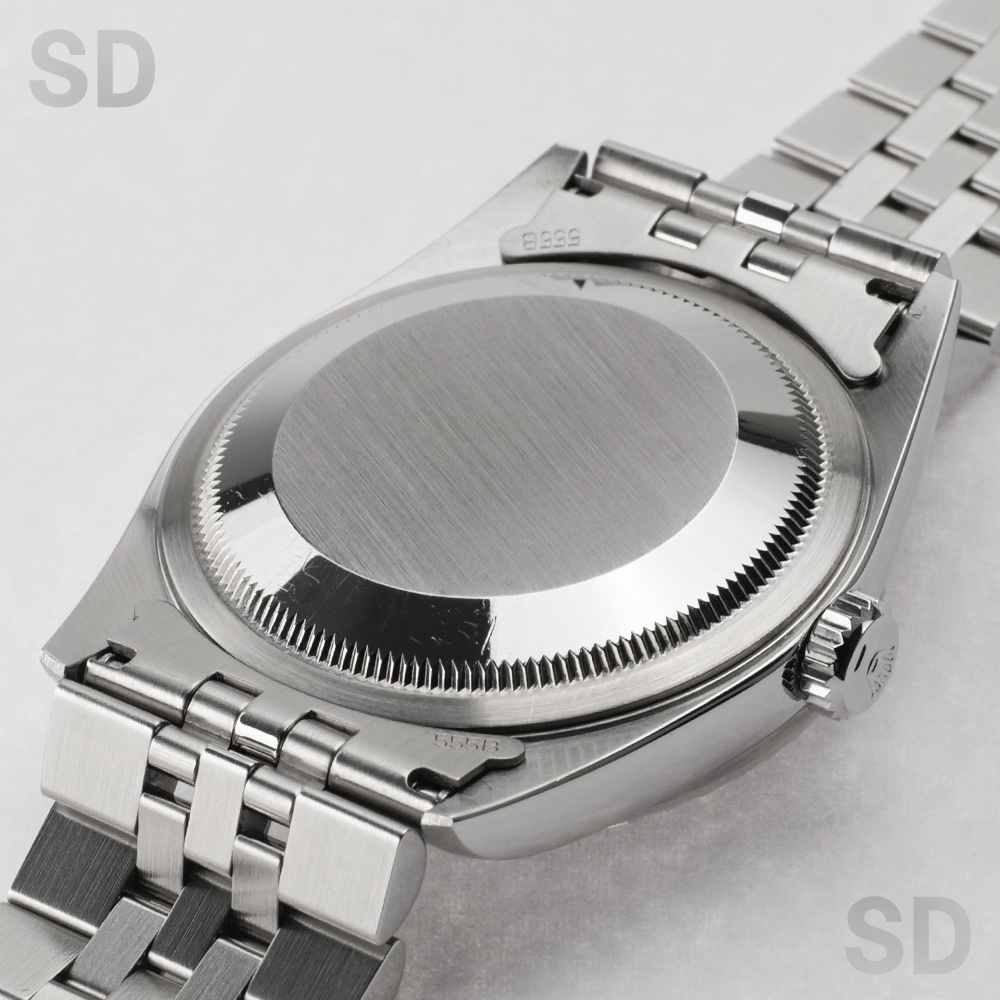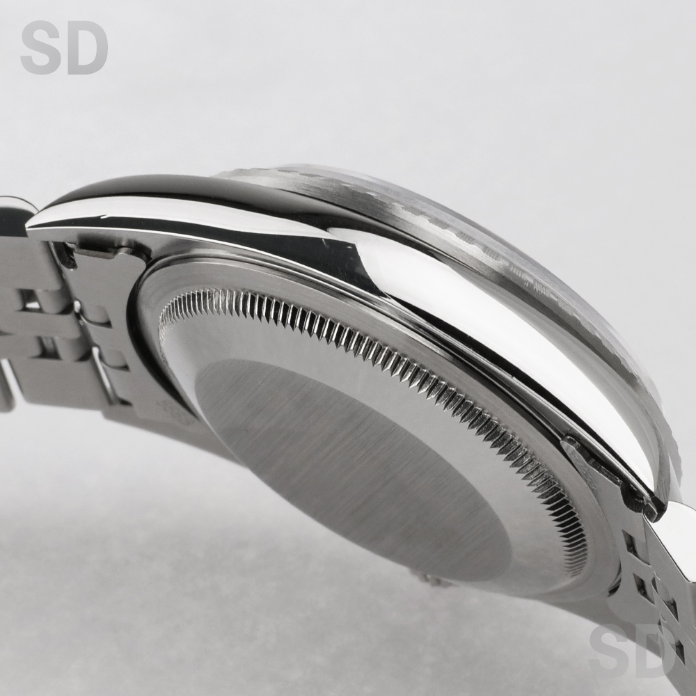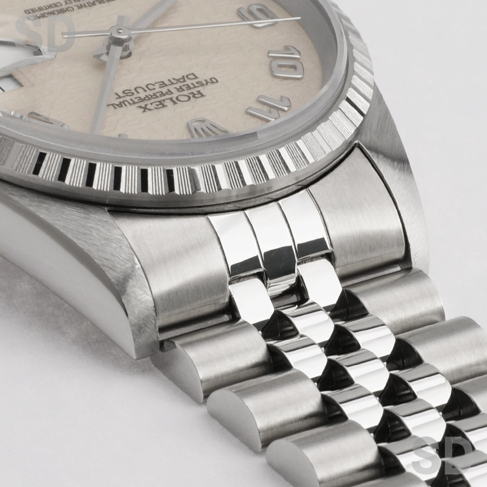 エングレーブドベゼルを装備したデイトジャスト。 エングレーブドとは「刻み」や「刻印」の意味であり、一見フルーテッドベゼルにも似ていますがステンレス製であり凹凸のある仕上げが特徴で、ジュビリーブレスレットとのセットアップはとてもドレッシーではありますがラフにお使い頂けるモデルです。また、こちらにセットされているコンピューター文字盤は「彫りコンピューター」とも呼ばれ、光の反射角度によって彫り込まれたROLEXの文字が浮き出てきます。とても煌びやかでありながらアイボリーの温か味ある色彩がとても上品な1本。流行り廃りがなく末永く愛用できます。