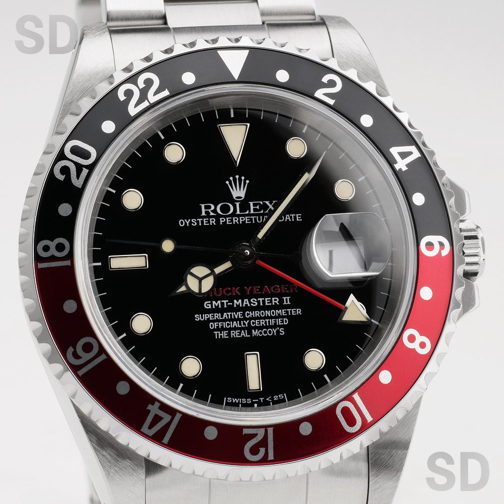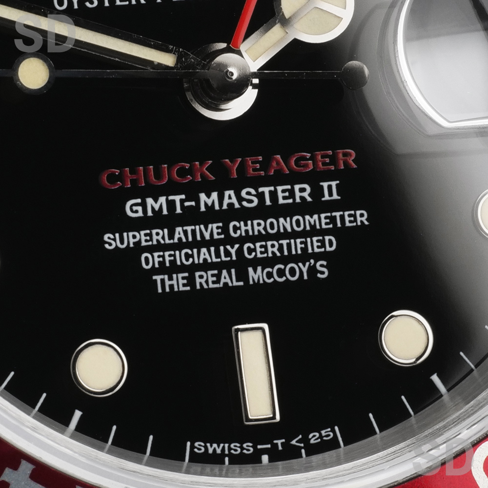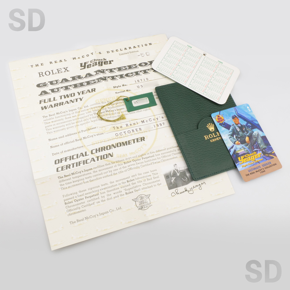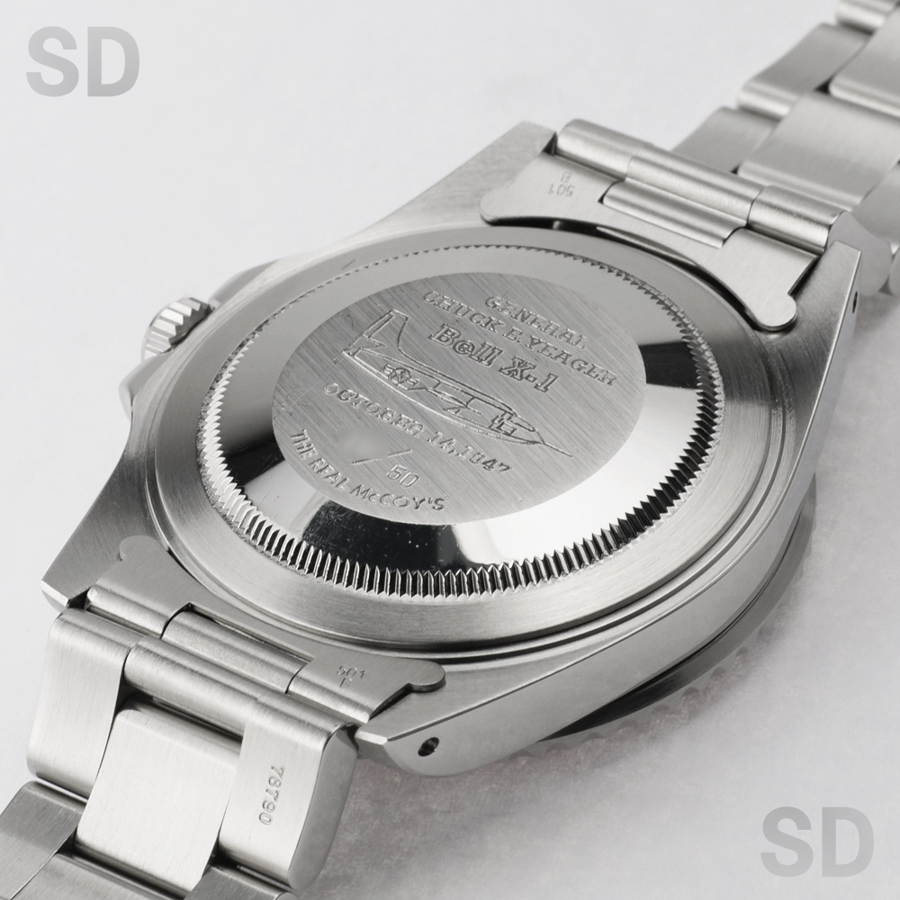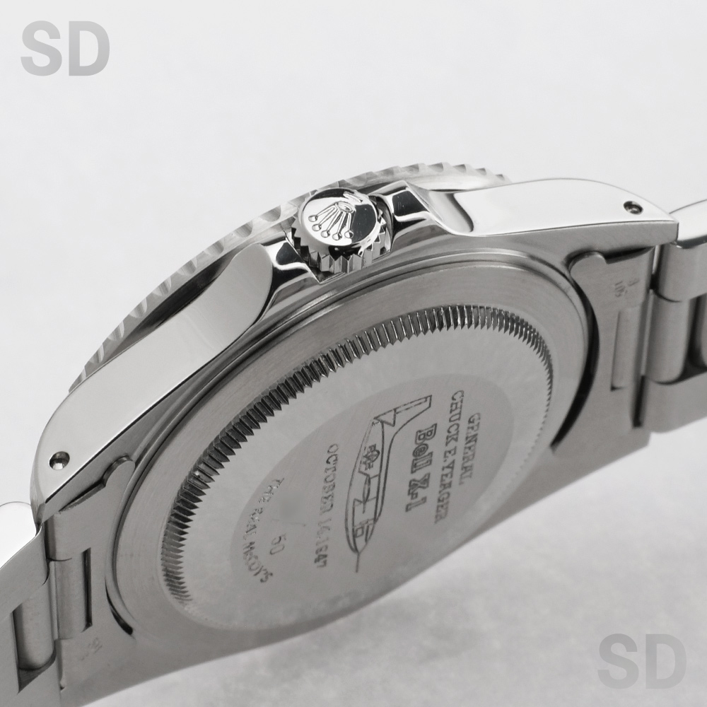 今回ご紹介するモデルは人類史上初めて音速飛行を成し遂げた元アメリカ空軍パイロットのチャック・イェーガーの音速突破50周年記念式典(1997年)を記念して「リアルマッコイズ社」が企画したチャック・イェーガーのダブルネームです。このモデルは1997年に発売されたファーストモデルで、Ref.16710赤黒ベゼル、Ref.16700赤青ベゼル、Ref.16700黒ベゼルで、それぞれ限定50本製造されました。裏ブタにはチャック・イェーガー氏が実際に搭乗した音速突破時の航空機X-1と共にマッハ0.92を記録した日付も刻印されています。裏ブタおよび専用保証書に、50本限定本数のシリアルナンバーも記載されており、特別なレアモデルとしての風格をより一層漂わせます。