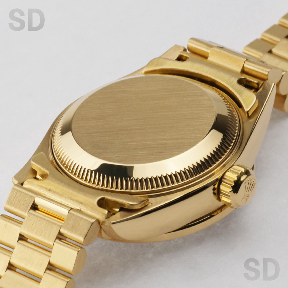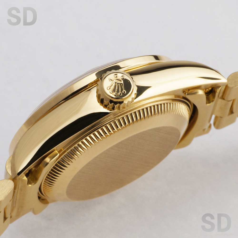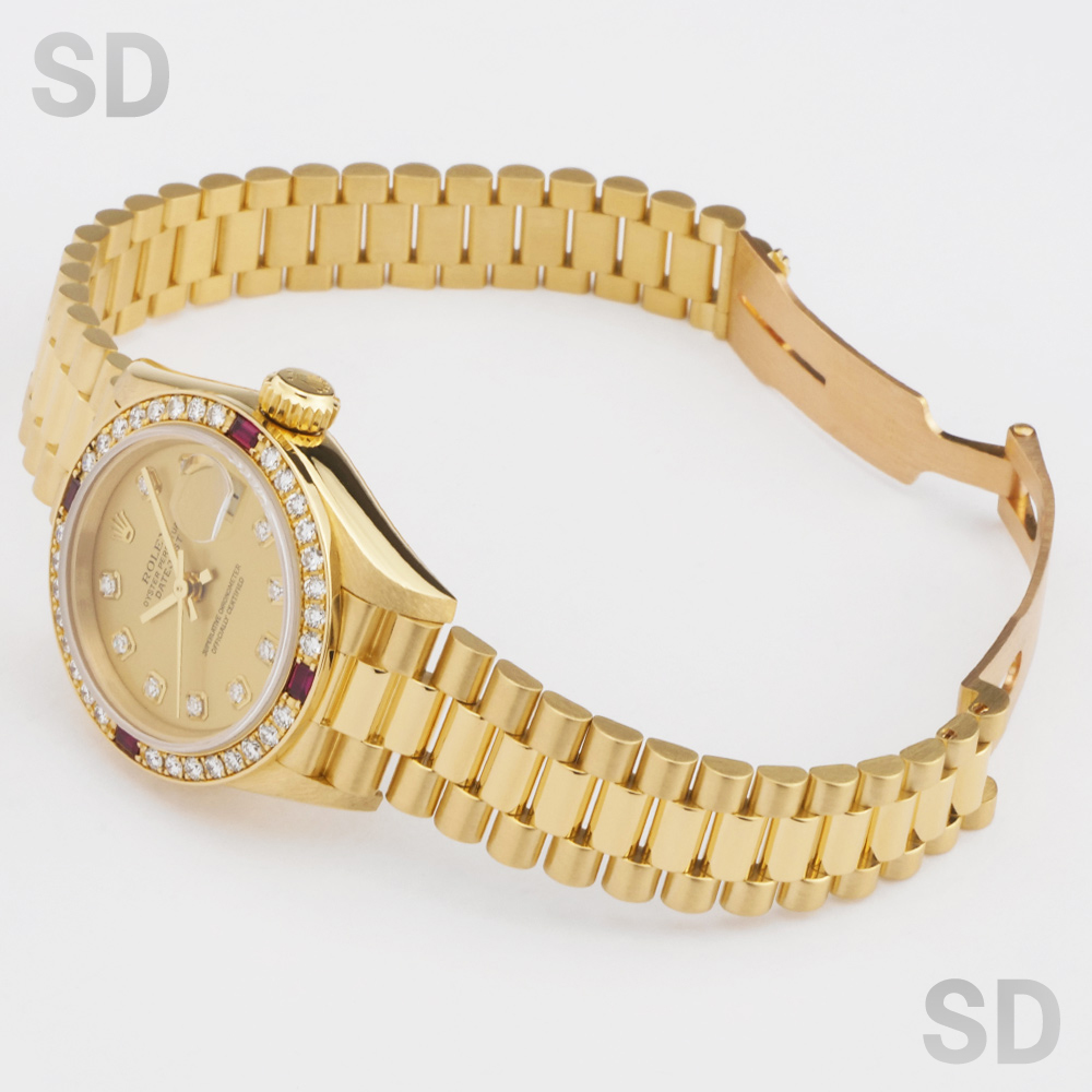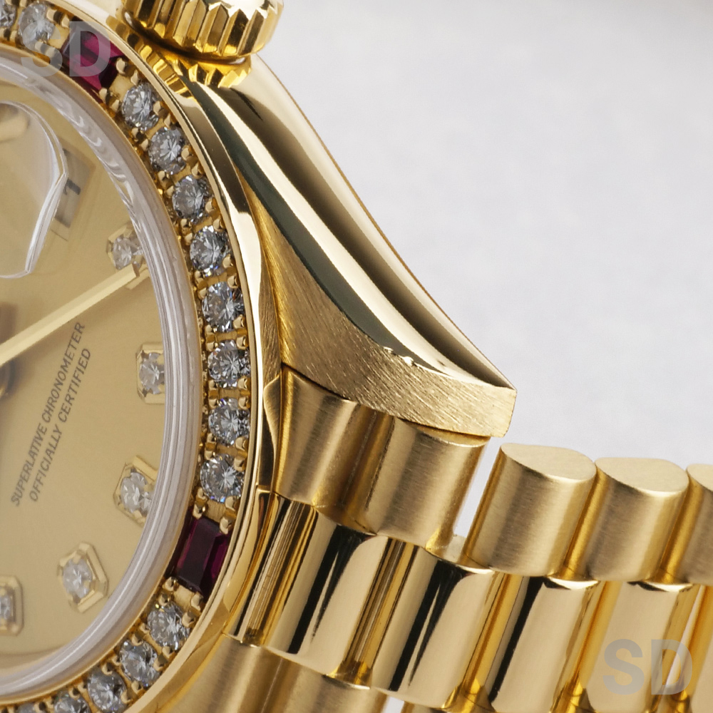 現在は生産が終了してしまった本個体は、ケース径26mmのレディースサイズに、イエローゴールド無垢のケースとブレスレットを備え、ベゼルには32石の純正ダイヤモンドと4石の純正バゲットルビーを配した華やかなモデルです。シャンパンダイアルに10石の大粒ダイヤモンドインデックスを組み合わせ、金無垢モデル専用のプレジデントブレスレットがロレックスならではの格式を演出します。ラグ表面やブレスサイドのサテン仕上げにより、後継モデルと比べて僅かながら落ち着いた雰囲気を感じさせる一本です。