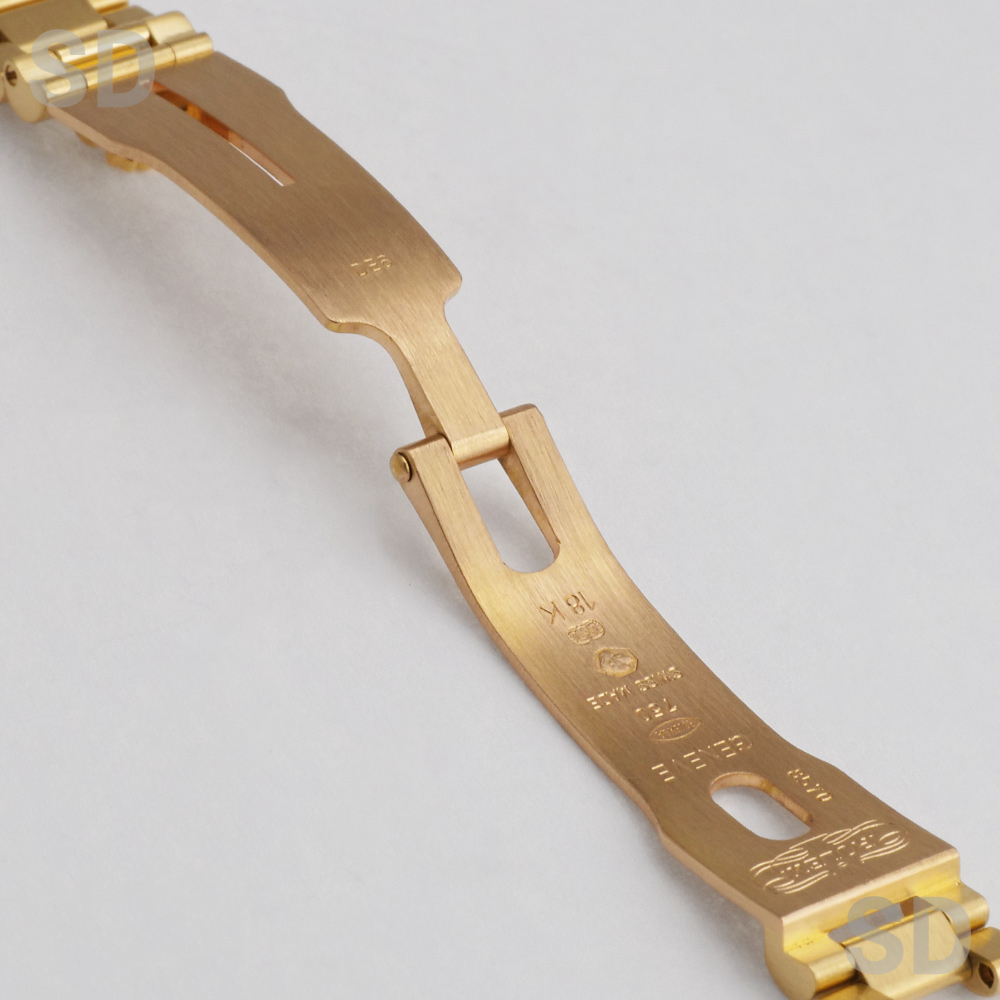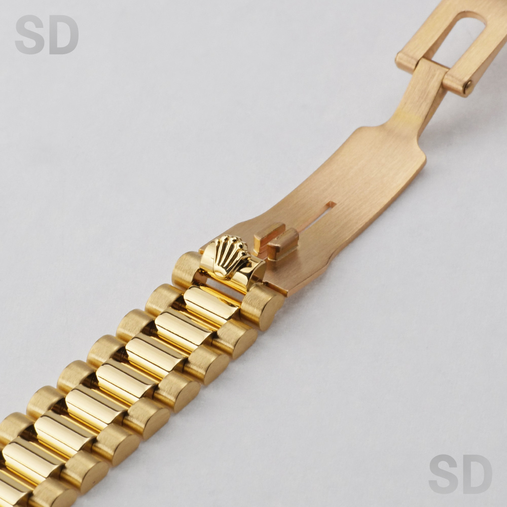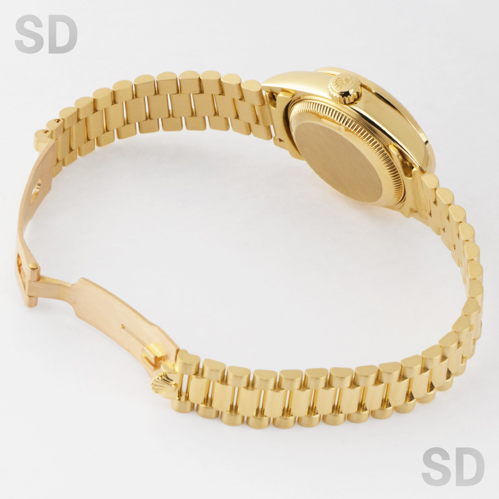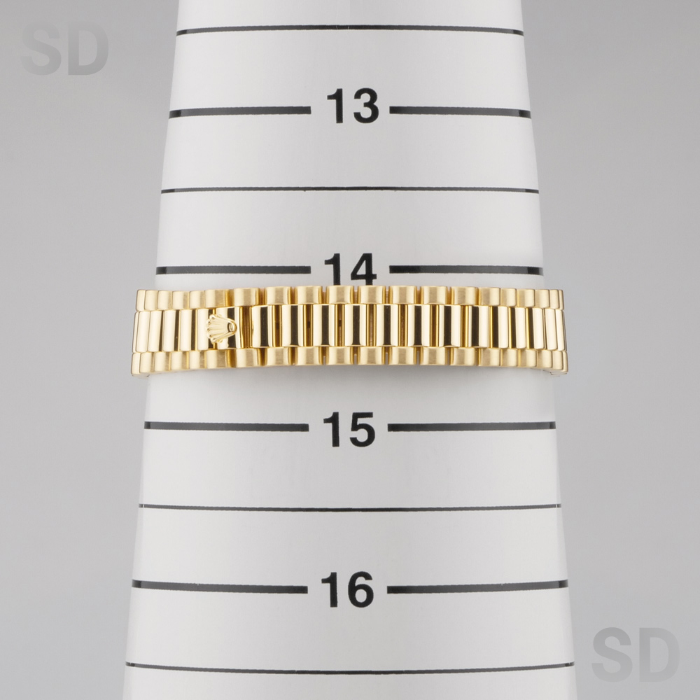 現在は生産が終了してしまった本個体は、ケース径26mmのレディースサイズに、イエローゴールド無垢のケースとブレスレットを備え、ベゼルには32石の純正ダイヤモンドと4石の純正バゲットルビーを配した華やかなモデルです。シャンパンダイアルに10石の大粒ダイヤモンドインデックスを組み合わせ、金無垢モデル専用のプレジデントブレスレットがロレックスならではの格式を演出します。ラグ表面やブレスサイドのサテン仕上げにより、後継モデルと比べて僅かながら落ち着いた雰囲気を感じさせる一本です。