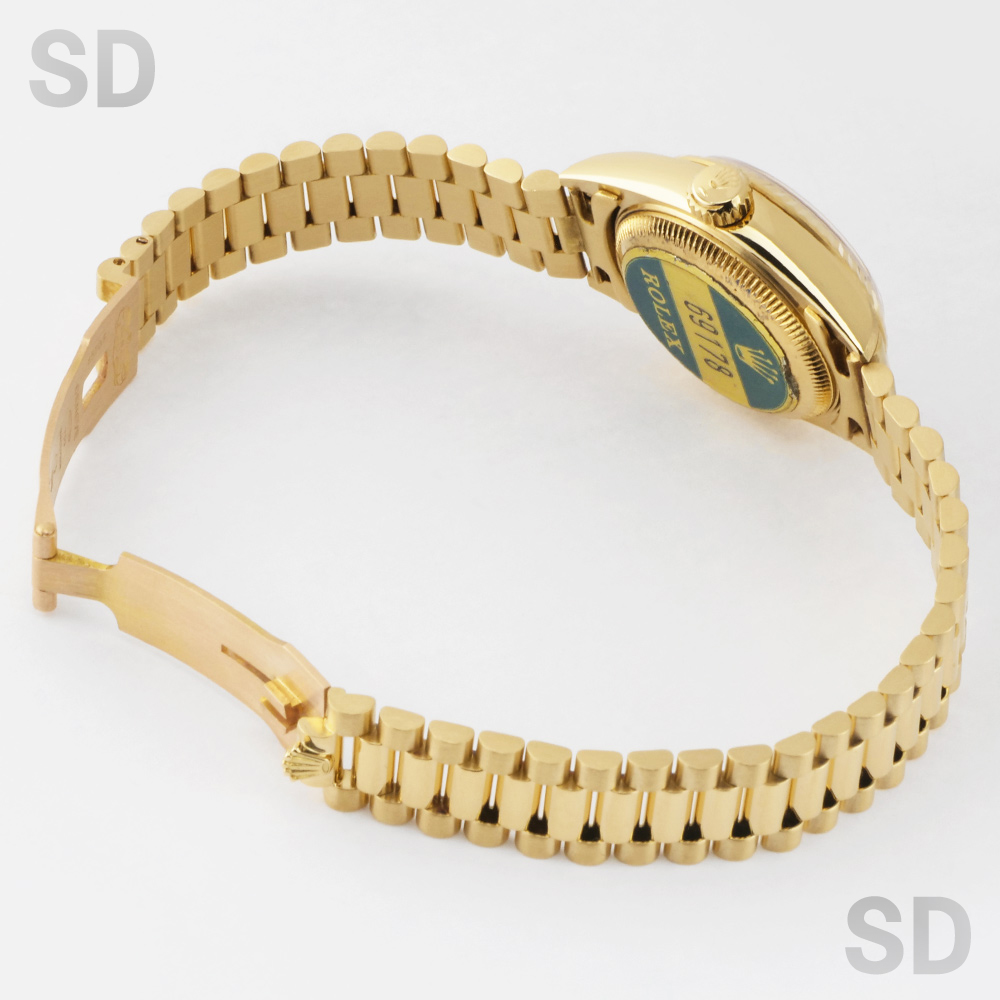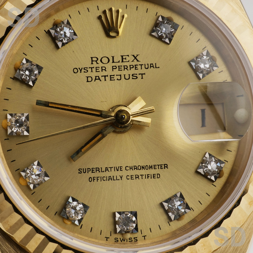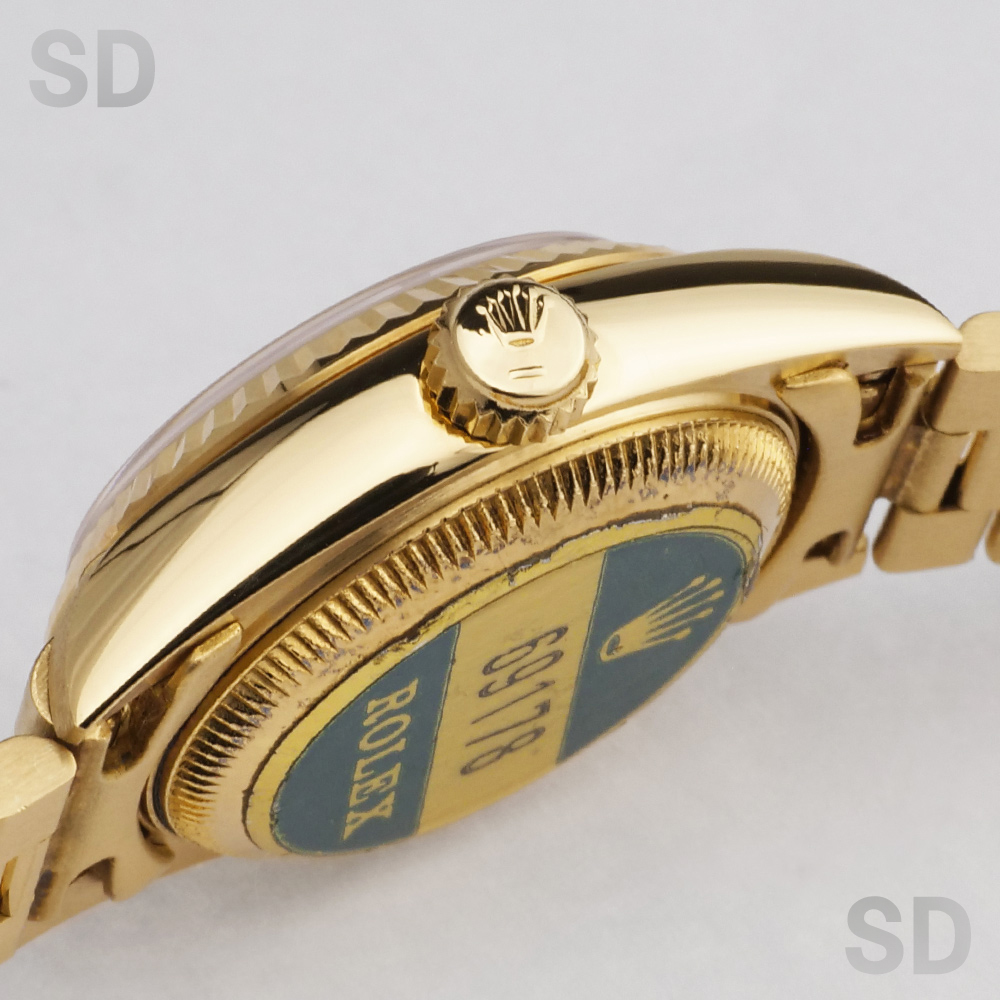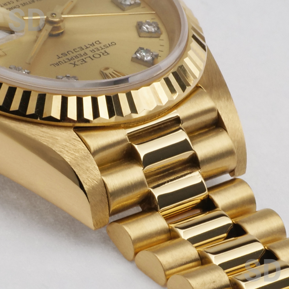 現在は生産が終了してしまった本個体は、ケース径26mmのレディースサイズに、イエローゴールド無垢のケースとブレスレットを備え、ロレックスを象徴とするフルーテッドベゼルのモデルです。定番のシャンパンダイアルに10石の旧型ダイヤモンドインデックスを組み合わせ、金無垢モデル専用のプレジデントブレスレットが存在感を演出します。ラグ表面やブレスサイドのサテン仕上げにより、後継モデルと比べて僅かながら落ち着いた雰囲気も感じさせてくれる一本です。