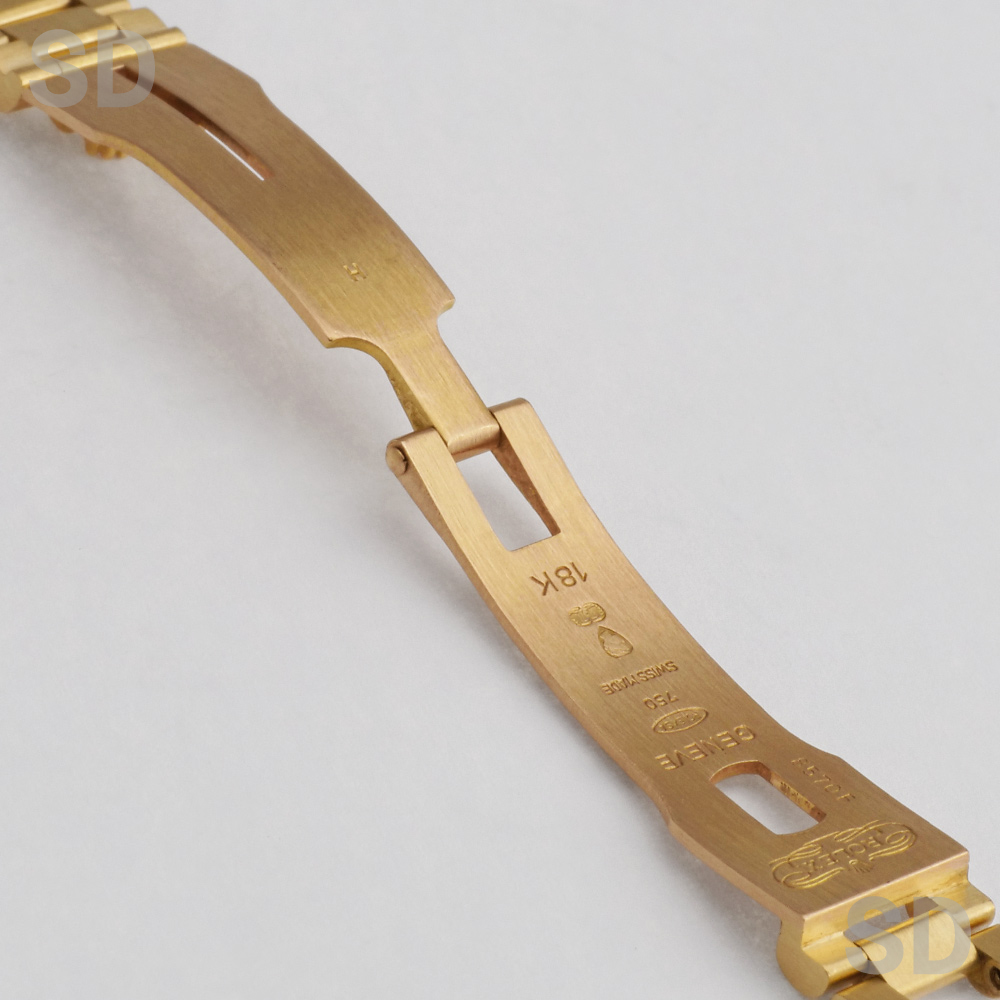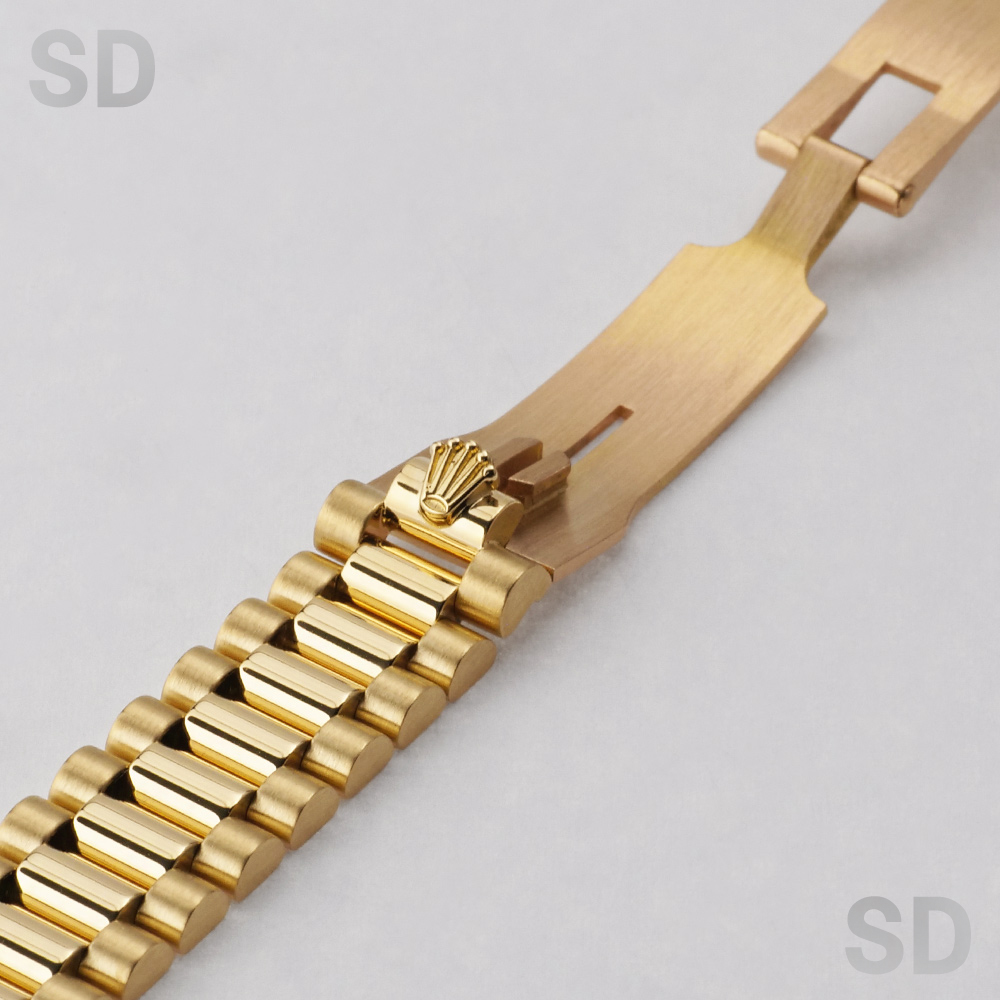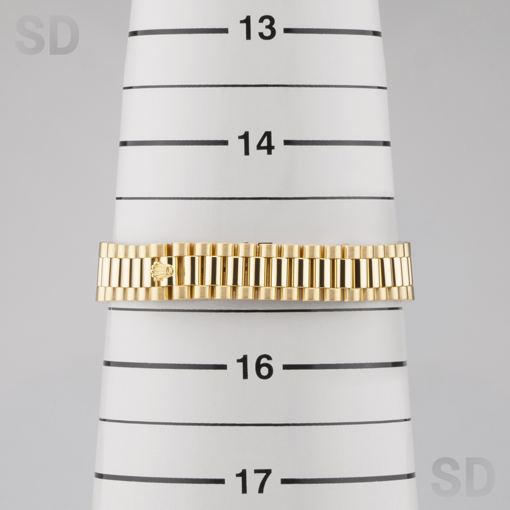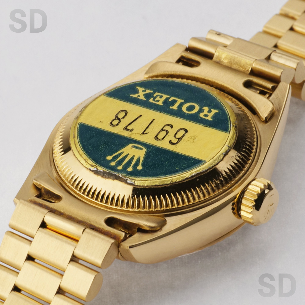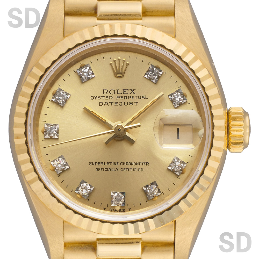 現在は生産が終了してしまった本個体は、ケース径26mmのレディースサイズに、イエローゴールド無垢のケースとブレスレットを備え、ロレックスを象徴とするフルーテッドベゼルのモデルです。定番のシャンパンダイアルに10石の旧型ダイヤモンドインデックスを組み合わせ、金無垢モデル専用のプレジデントブレスレットが存在感を演出します。ラグ表面やブレスサイドのサテン仕上げにより、後継モデルと比べて僅かながら落ち着いた雰囲気も感じさせてくれる一本です。