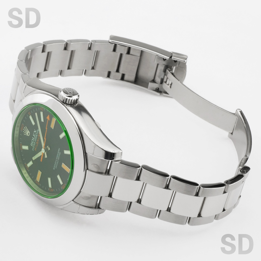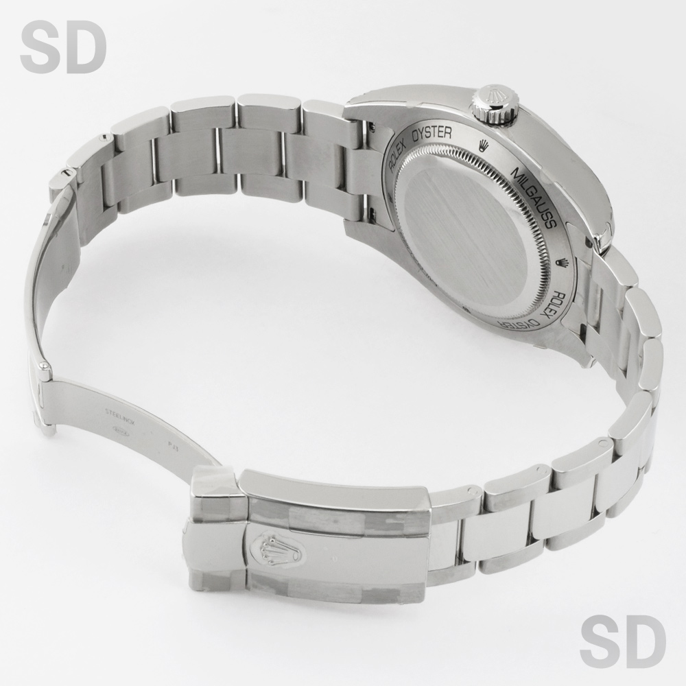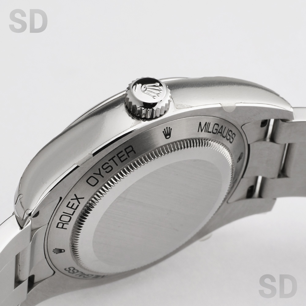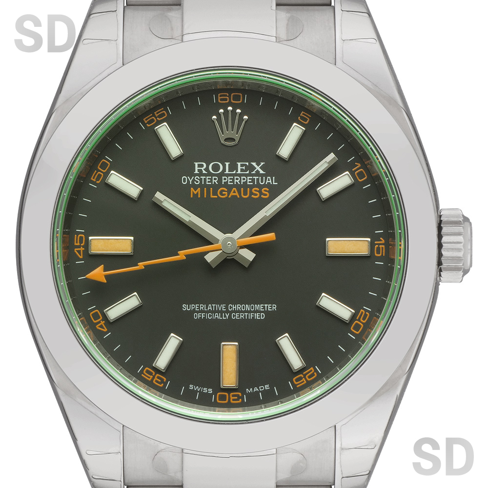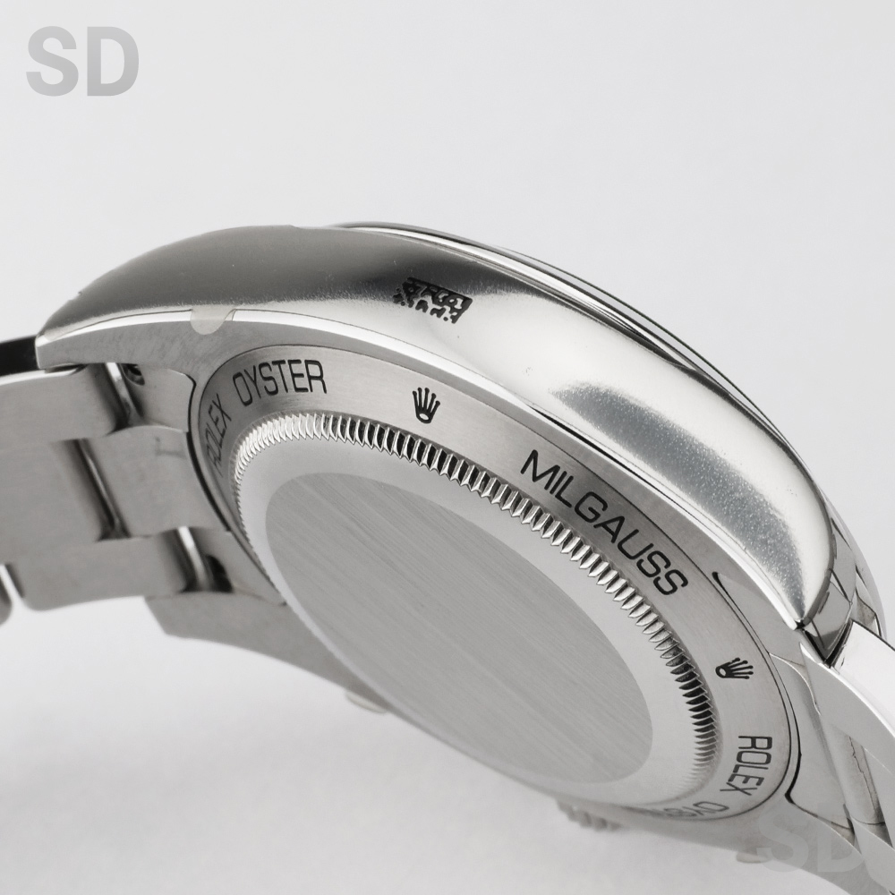 現在は生産が終了している本モデルは、ミルガウス誕生50周年のアニバーサリーモデルとして発表され、稲妻モチーフの秒針と、ロレックスのコーポレートカラーであるグリーンサファイアガラスが印象的なデザインとなっています。最大の魅力は高い耐磁性能にあり、一般的な時計(約60ガウス)に対し、1000ガウスに耐える設計を採用。オイスターケースと軟鉄製インナーケースによる二重構造でムーブメントを磁気から保護します。優れた耐磁構造を備え、実用性とロレックスならではの完成度を兼ね備えた一本です。