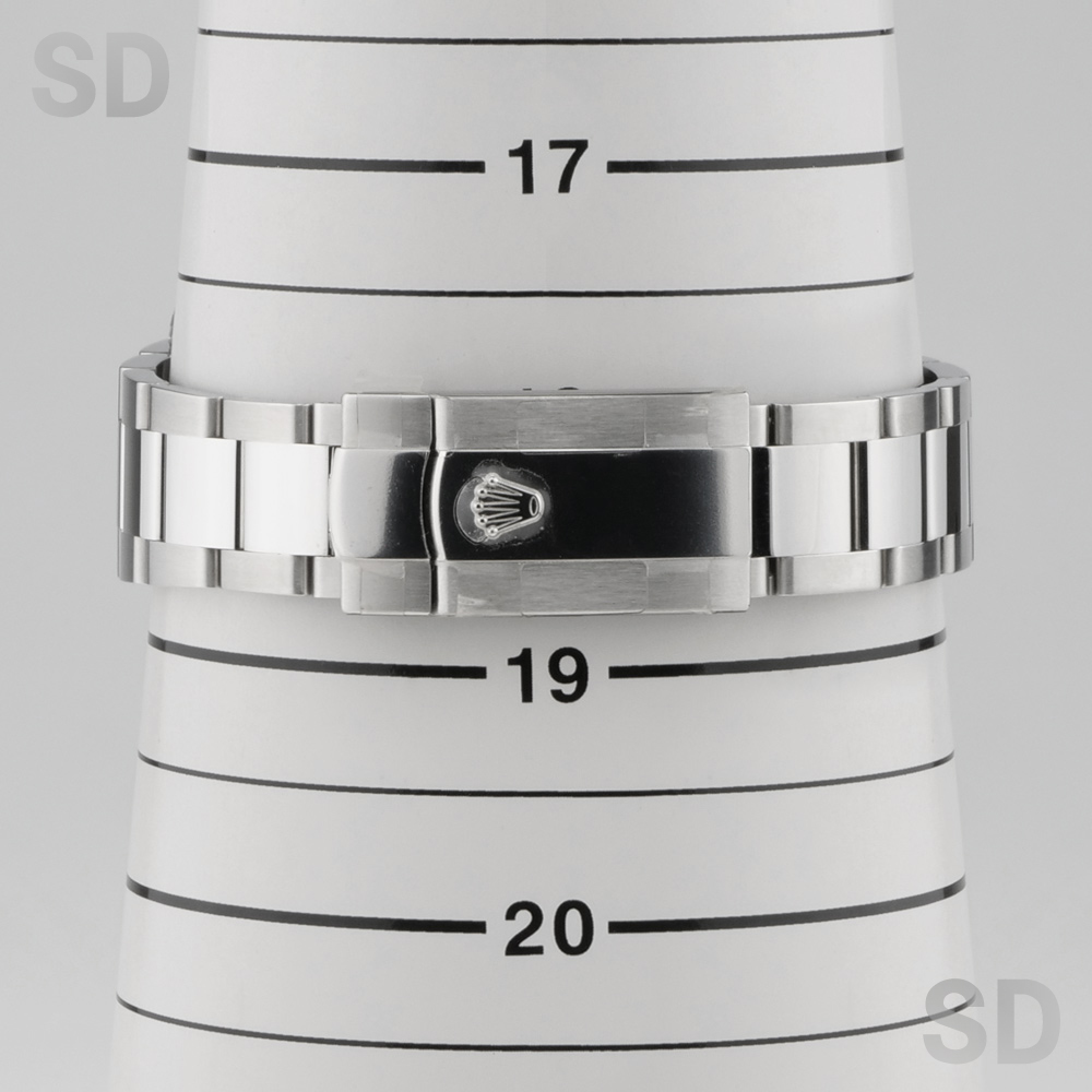 状態です。外装につきましては、メーカー出荷時の新品保護シールがラグ、ケースサイド、フラッシュフィット、バックル、クラスプ等に残っており、当店では外装仕上げを行っていないノンポリッシュの個体でございます。使用感は極めて少なく、保管・展示に伴う微細な傷や、サイズ調整の跡は僅かにございますが、限りなく未使用品(いわゆるデッドストック)に近いコンディションといえるお品物でございます。