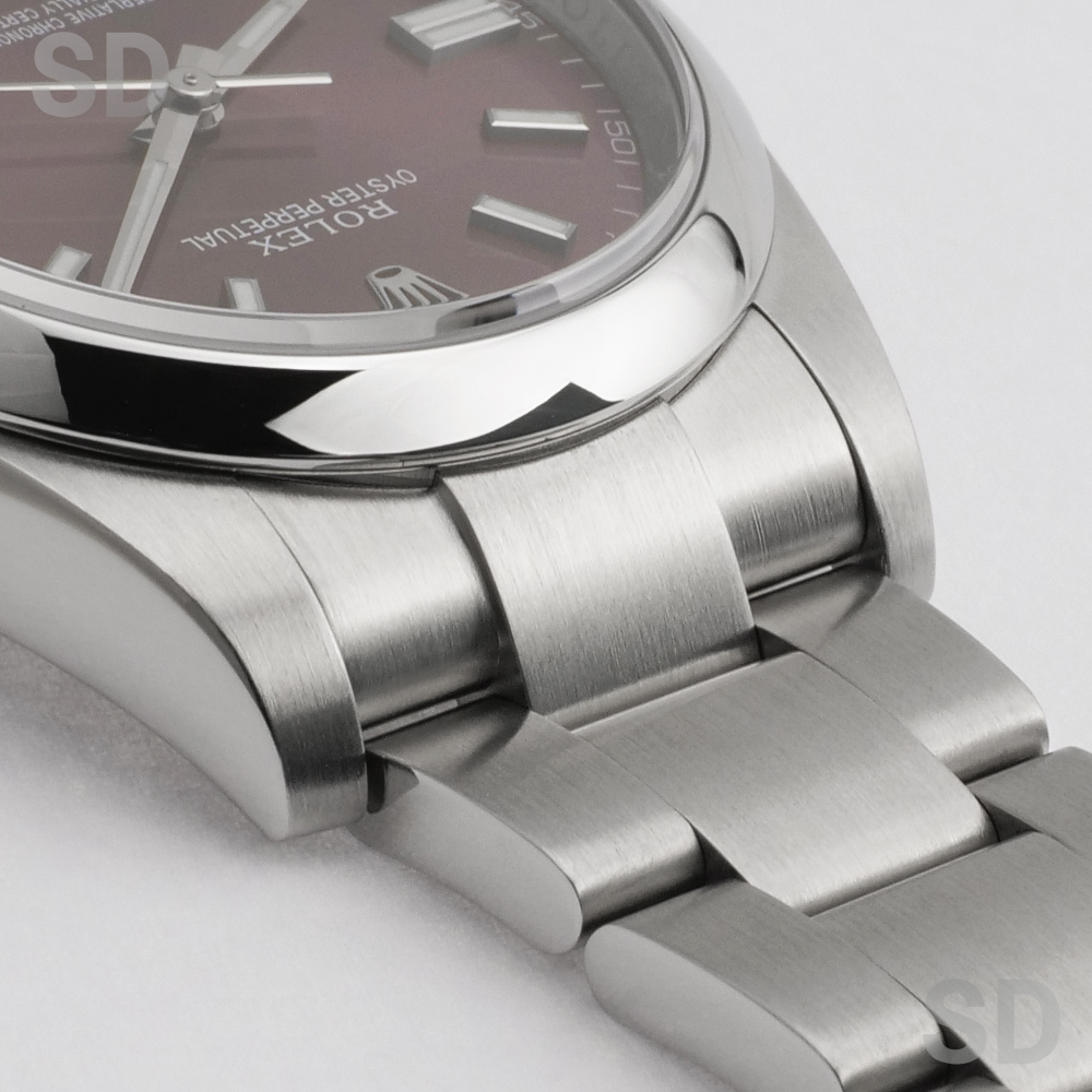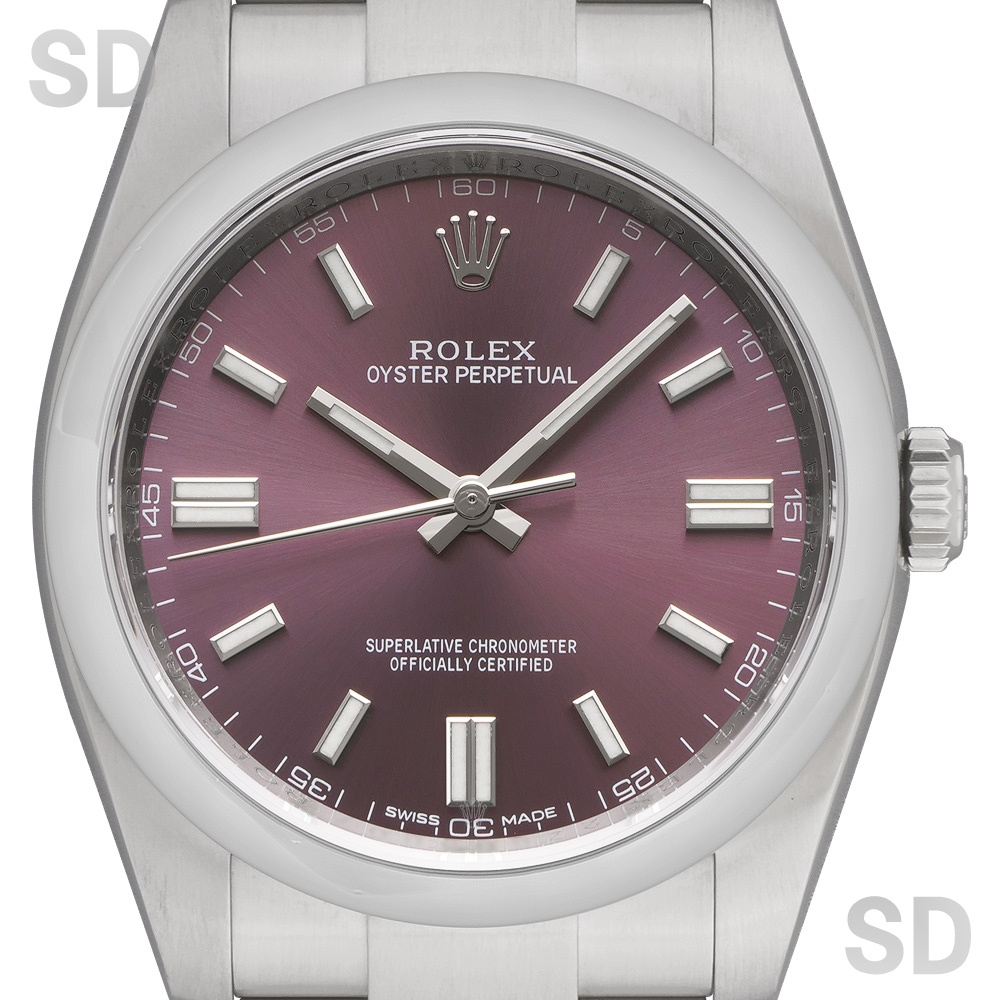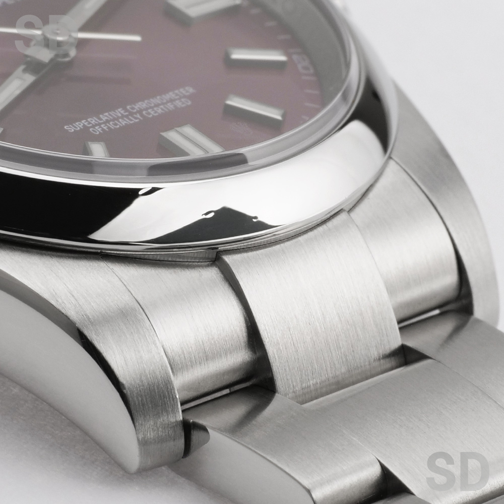 現在は生産終了となっている本モデルは、堅牢なオイスターケースと高精度自動巻きムーブメントを備えた、ロレックスの原点を体現するモデルです。丸みを帯びたポリッシュ仕上げのドームベゼルに、堅牢なオイスターブレスを組み合わせた実用的な仕様です。文字盤には、中心から放射状に広がるサンレイ仕上げのレッドグレープ(2014年追加カラー)を採用しており、ロレックスでは数少ないノンデイトの36mmモデルとして、高い人気を誇ります。
