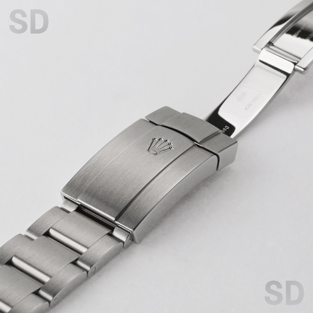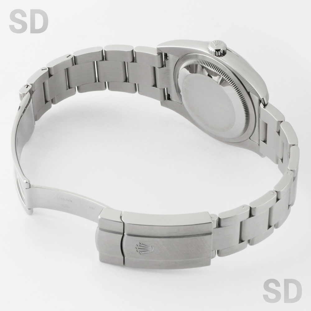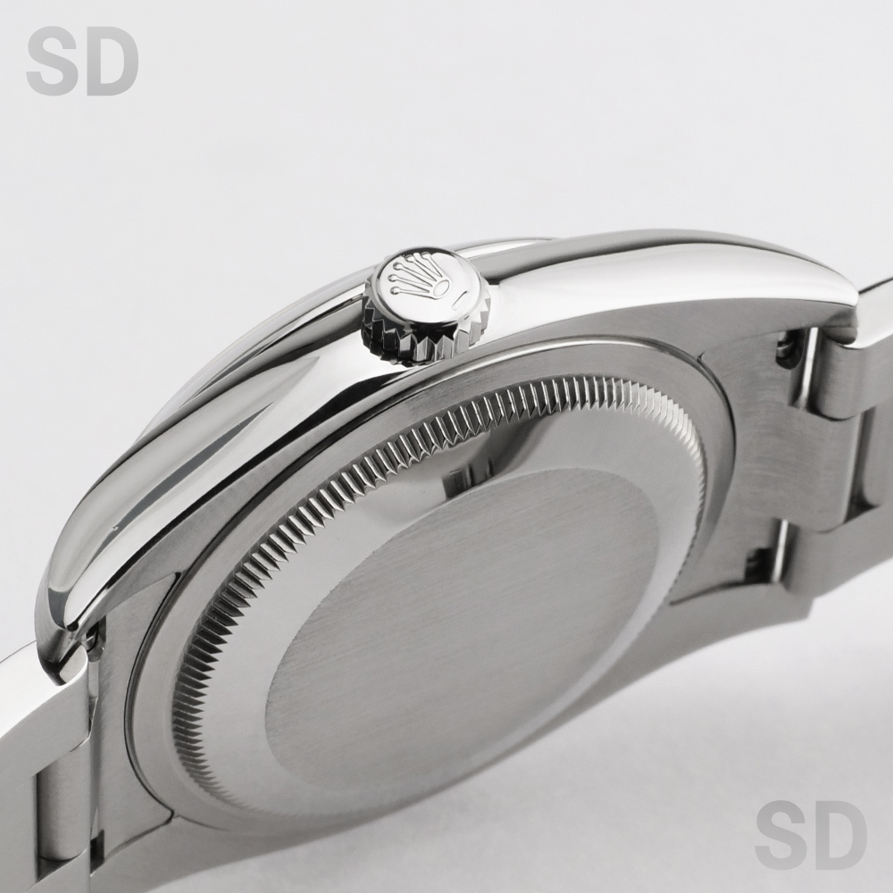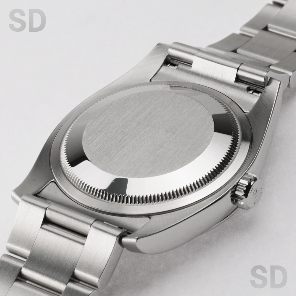現在は生産終了となっている本モデルは、堅牢なオイスターケースと高精度自動巻きムーブメントを備えた、ロレックスの原点を体現するモデルです。丸みを帯びたポリッシュ仕上げのドームベゼルに、堅牢なオイスターブレスを組み合わせた実用的な仕様です。文字盤には、中心から放射状に広がるサンレイ仕上げのレッドグレープ(2014年追加カラー)を採用しており、ロレックスでは数少ないノンデイトの36mmモデルとして、高い人気を誇ります。