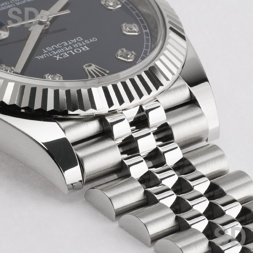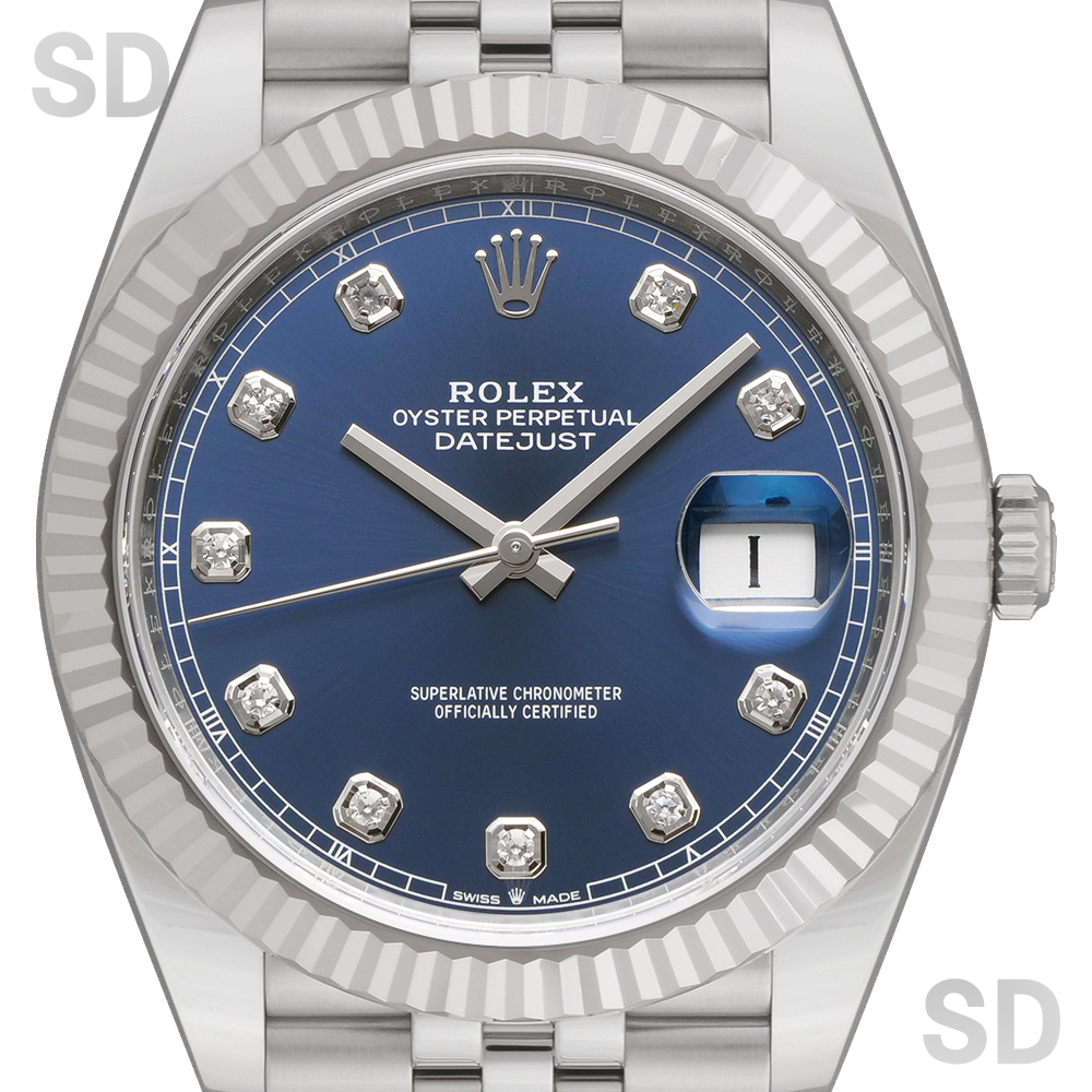 本モデルは、上質な光沢を湛えるホワイトゴールド製フルーテッドベゼルと、ステンレススチールを組み合わせたロレゾール(コンビ)仕様に、しなやかさと快適な装着性を兼ね備えたジュビリーブレスレットを装備。ダイヤルには発色の美しいブライトブルーに10Pのダイヤモンドインデックスを配し、デイトジャストならではの実用性に加え、端正で格調高い雰囲気を備えた、確かな存在感を放つ一本でございます。