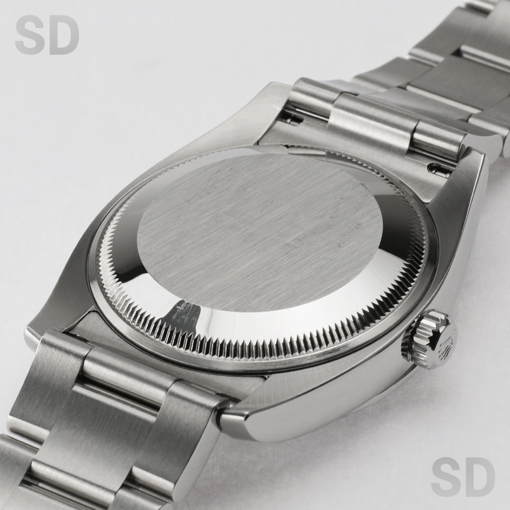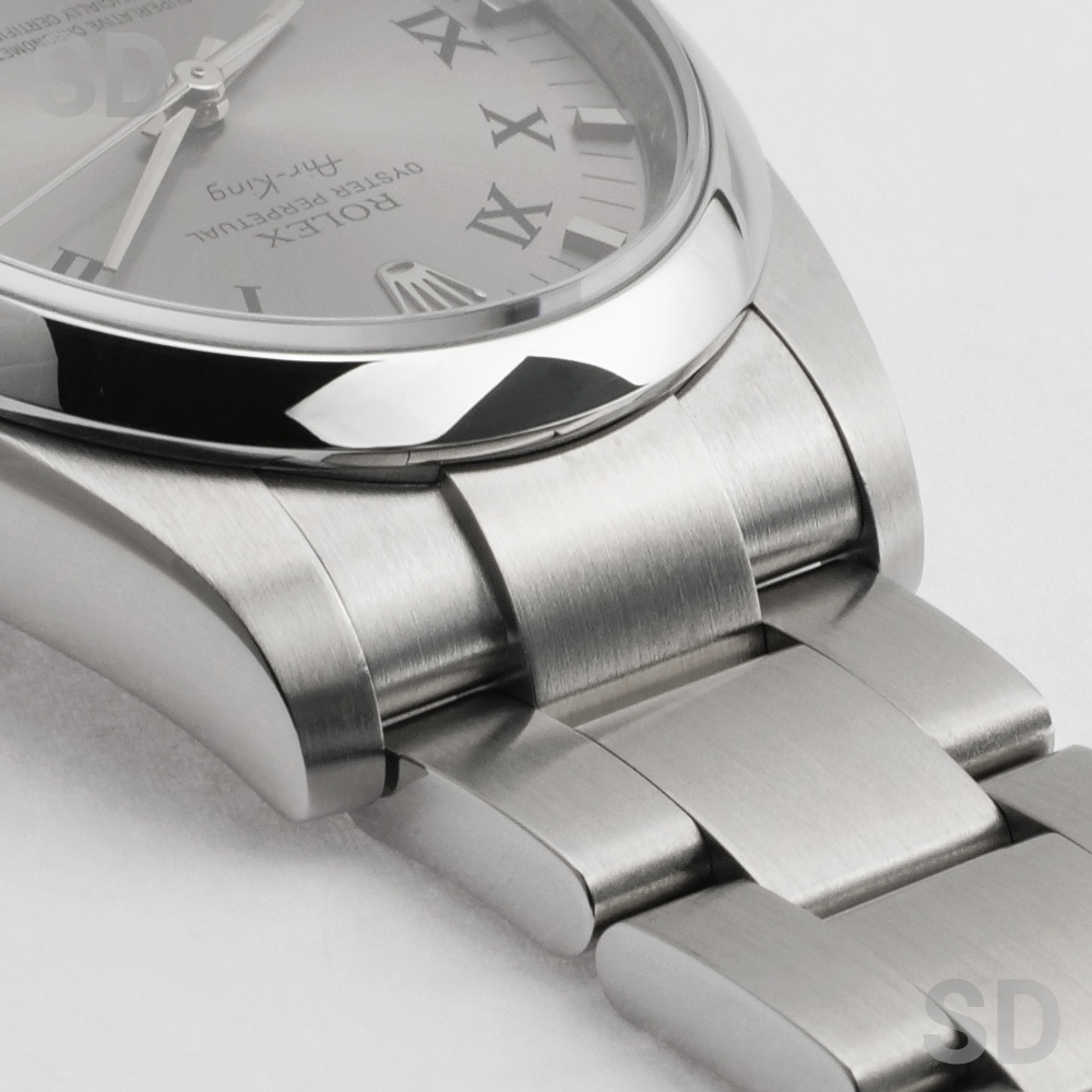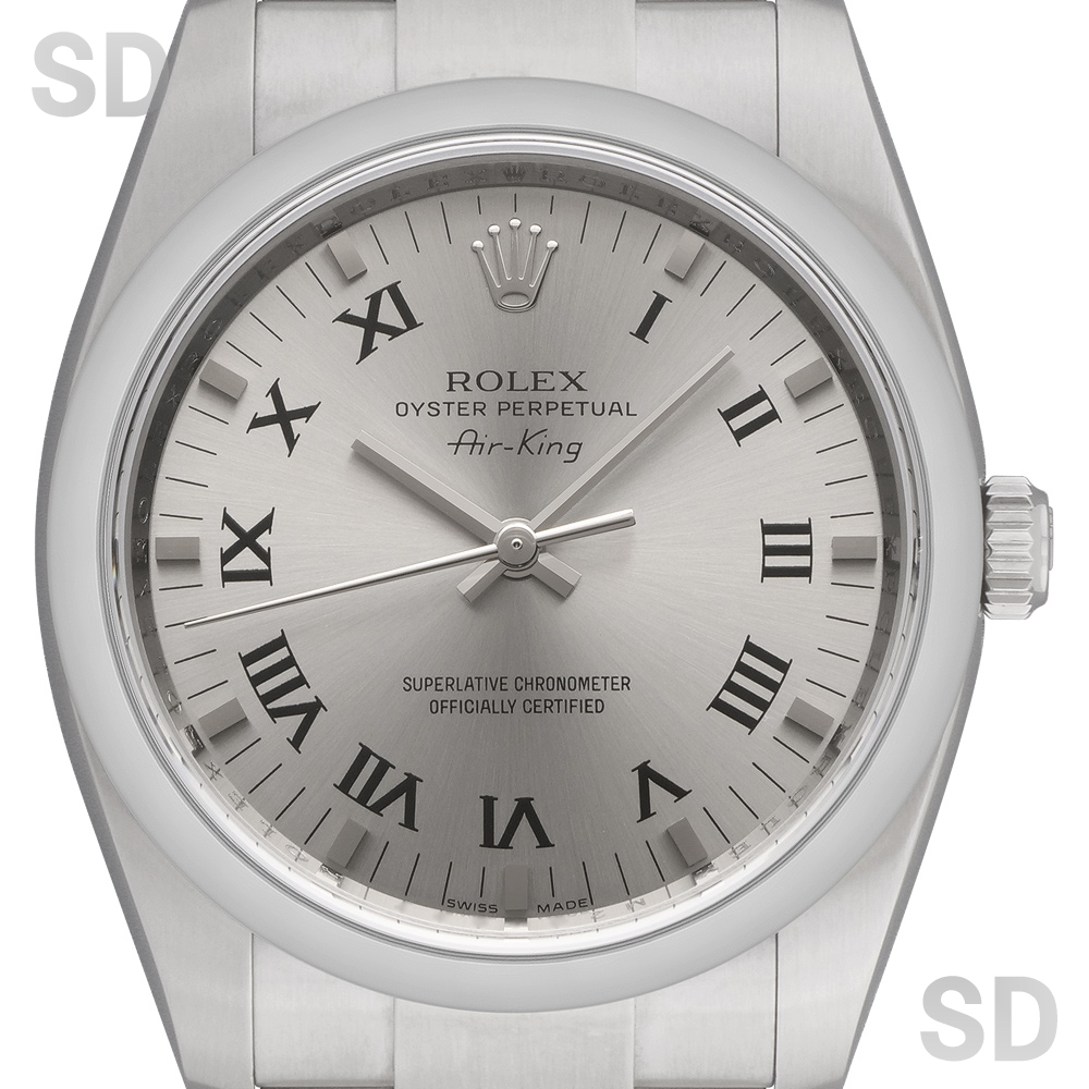 2014年頃にパーペチュアル34とモデル名が変わるまでペットネームとして末永く愛されていたエアキングシリーズ。他の日付なしモデルと同様のムーブメントCal.3130を搭載しており安定感のある精度を保ちます。こちらにセットされている文字盤は、ブラックペイントされたローマ数字のインデックスが印象的なグレープリントローマです。どこか渋みもありお洒落な1本で、比較的ラフにご使用出来るモデルです。