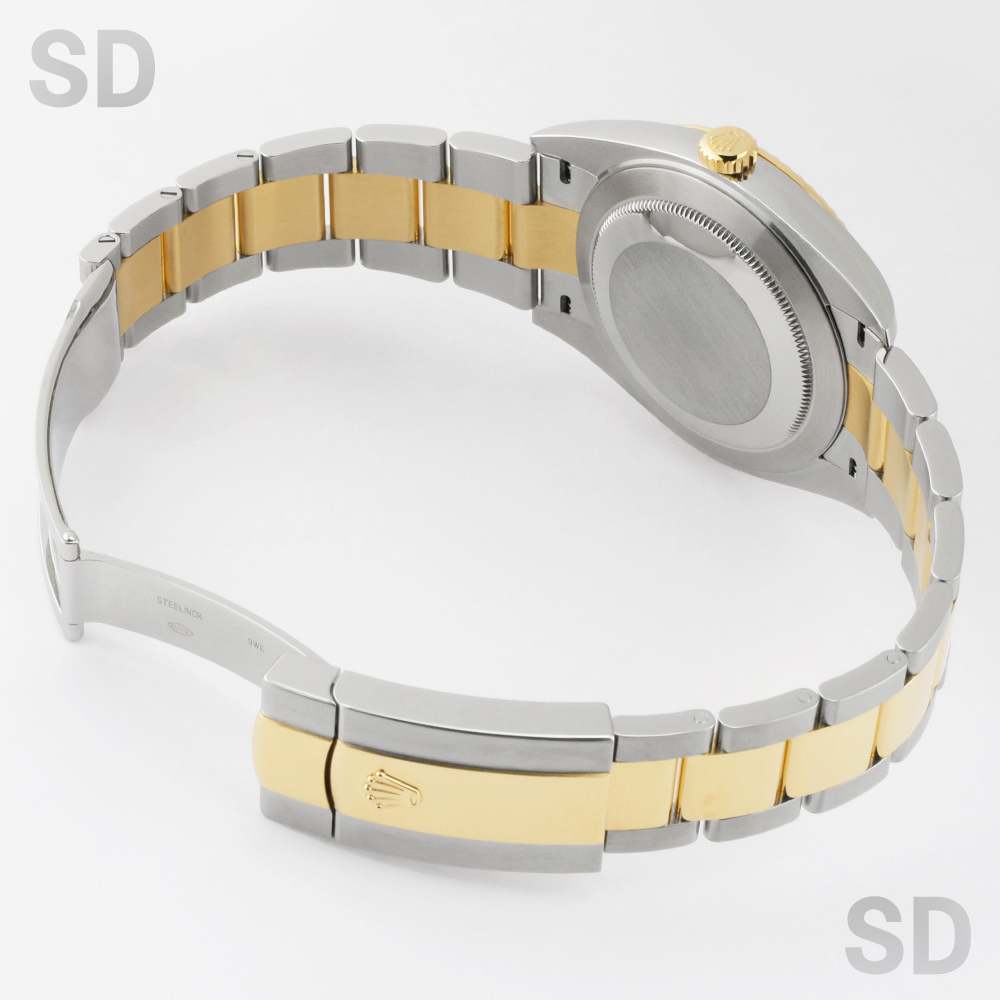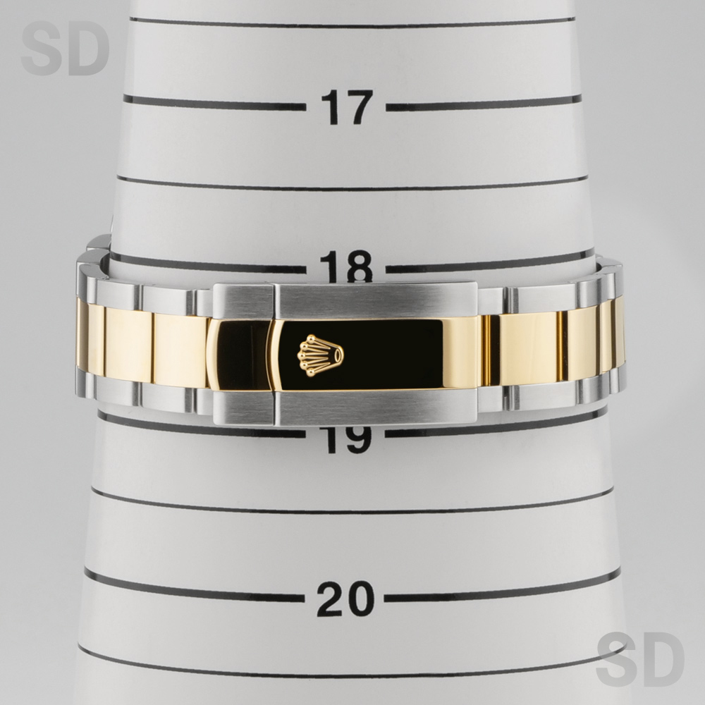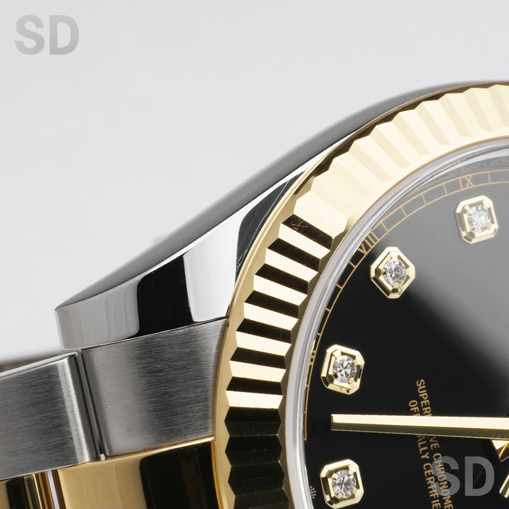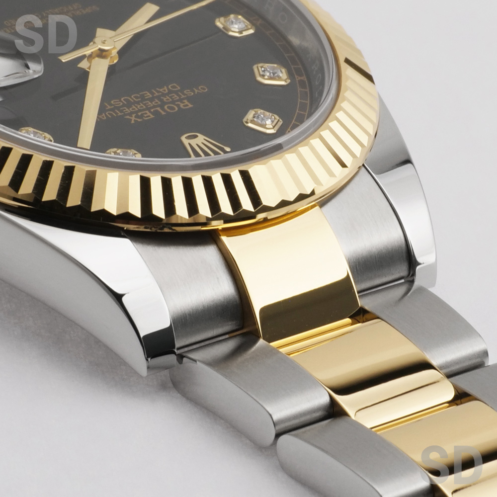 本モデルは、18Kイエローゴールドとステンレススチールを組み合わせたロレゾール(コンビ)仕様を採用。放射状に刻まれた立体的なカットのフルーテッドベゼルに、堅牢性の高いオイスターブレスレットが装着され、サンレイ仕上げが施されたブライトブラックダイアルにはダイヤモンドインデックスを配した、上品な輝きと華やかさを兼ね備えた表情が魅力の一本です。