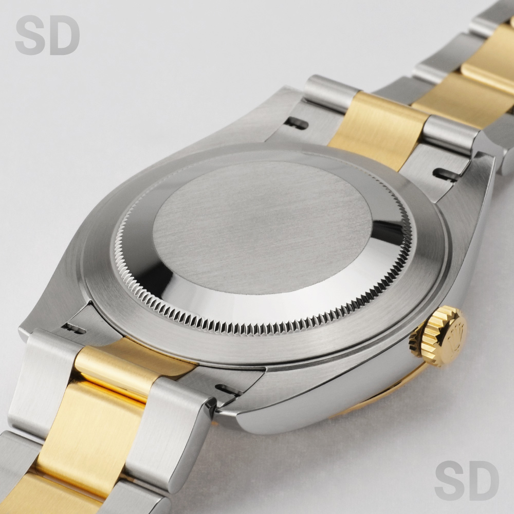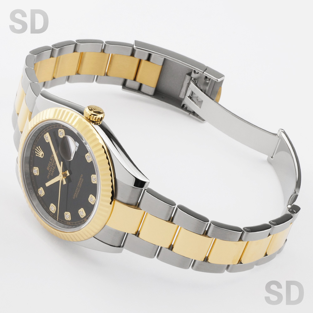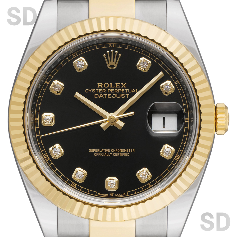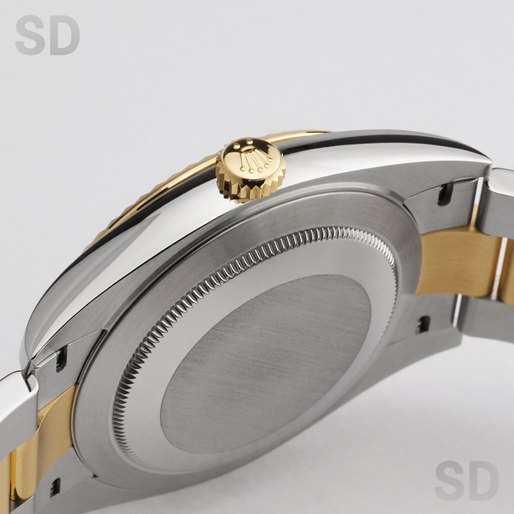 本モデルは、18Kイエローゴールドとステンレススチールを組み合わせたロレゾール(コンビ)仕様を採用。放射状に刻まれた立体的なカットのフルーテッドベゼルに、堅牢性の高いオイスターブレスレットが装着され、サンレイ仕上げが施されたブライトブラックダイアルにはダイヤモンドインデックスを配した、上品な輝きと華やかさを兼ね備えた表情が魅力の一本です。