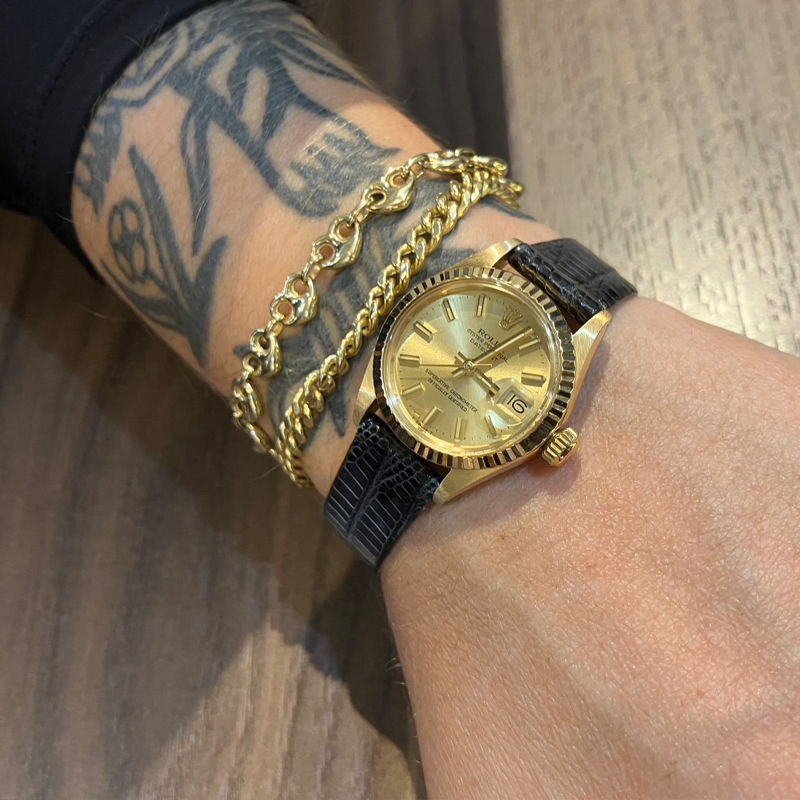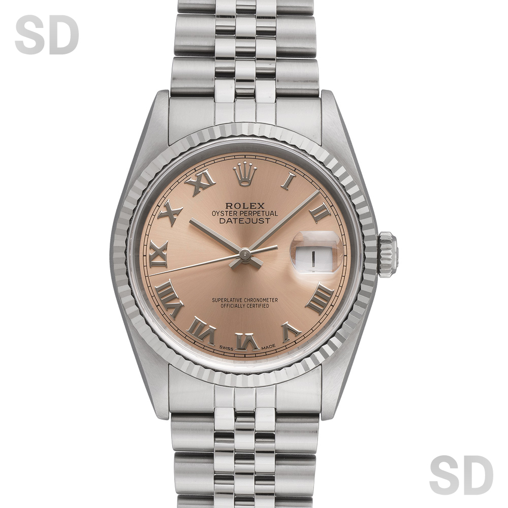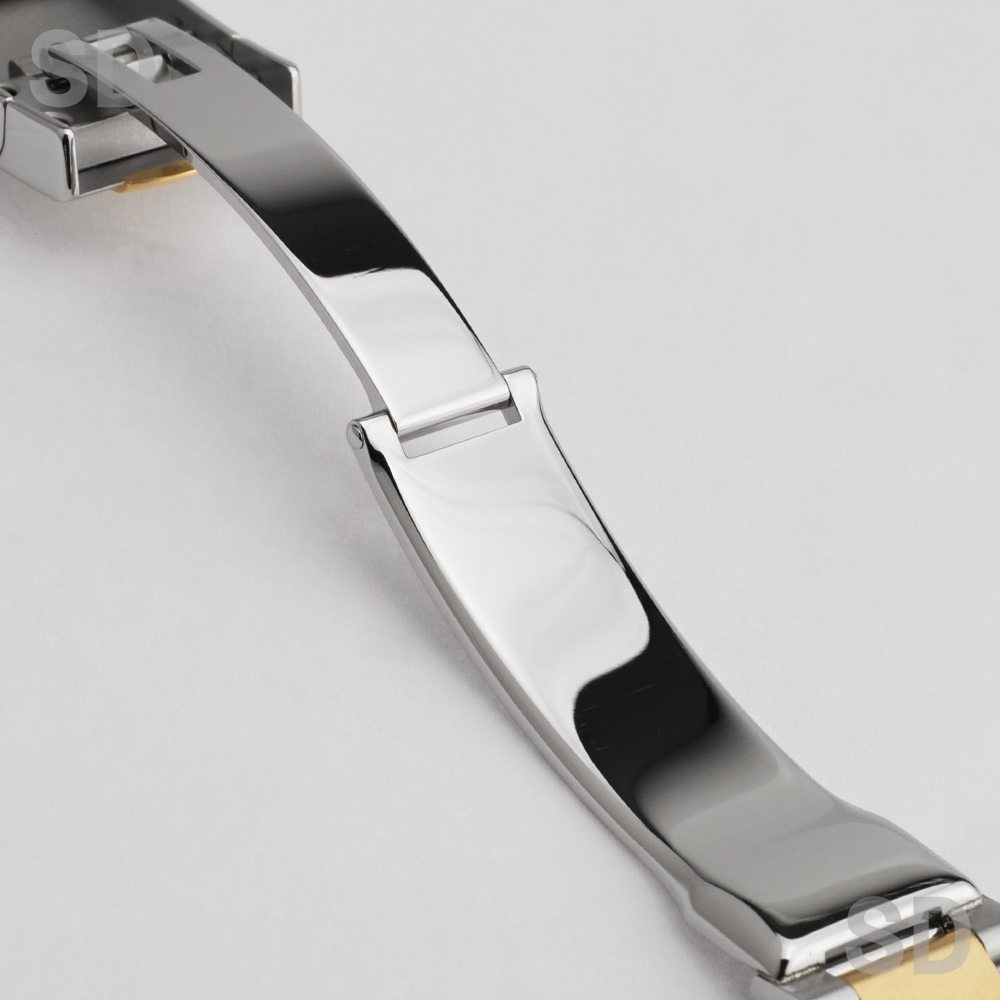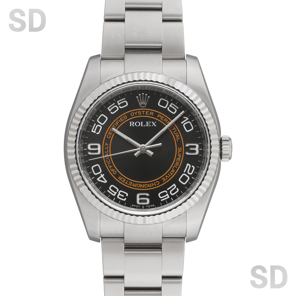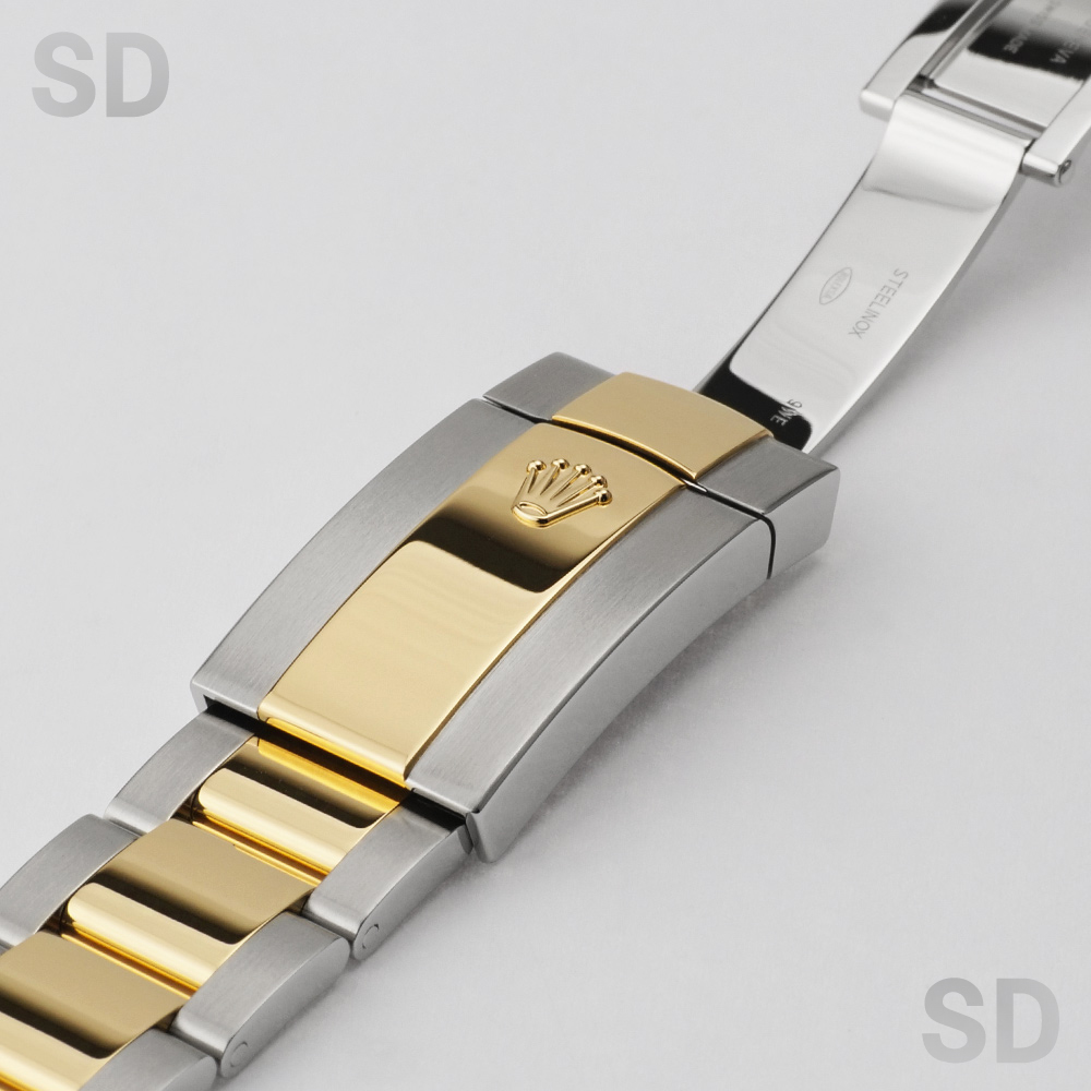 本モデルは、18Kイエローゴールドとステンレススチールを組み合わせたロレゾール(コンビ)仕様を採用。放射状に刻まれた立体的なカットのフルーテッドベゼルに、堅牢性の高いオイスターブレスレットが装着され、サンレイ仕上げが施されたブライトブラックダイアルにはダイヤモンドインデックスを配した、上品な輝きと華やかさを兼ね備えた表情が魅力の一本です。