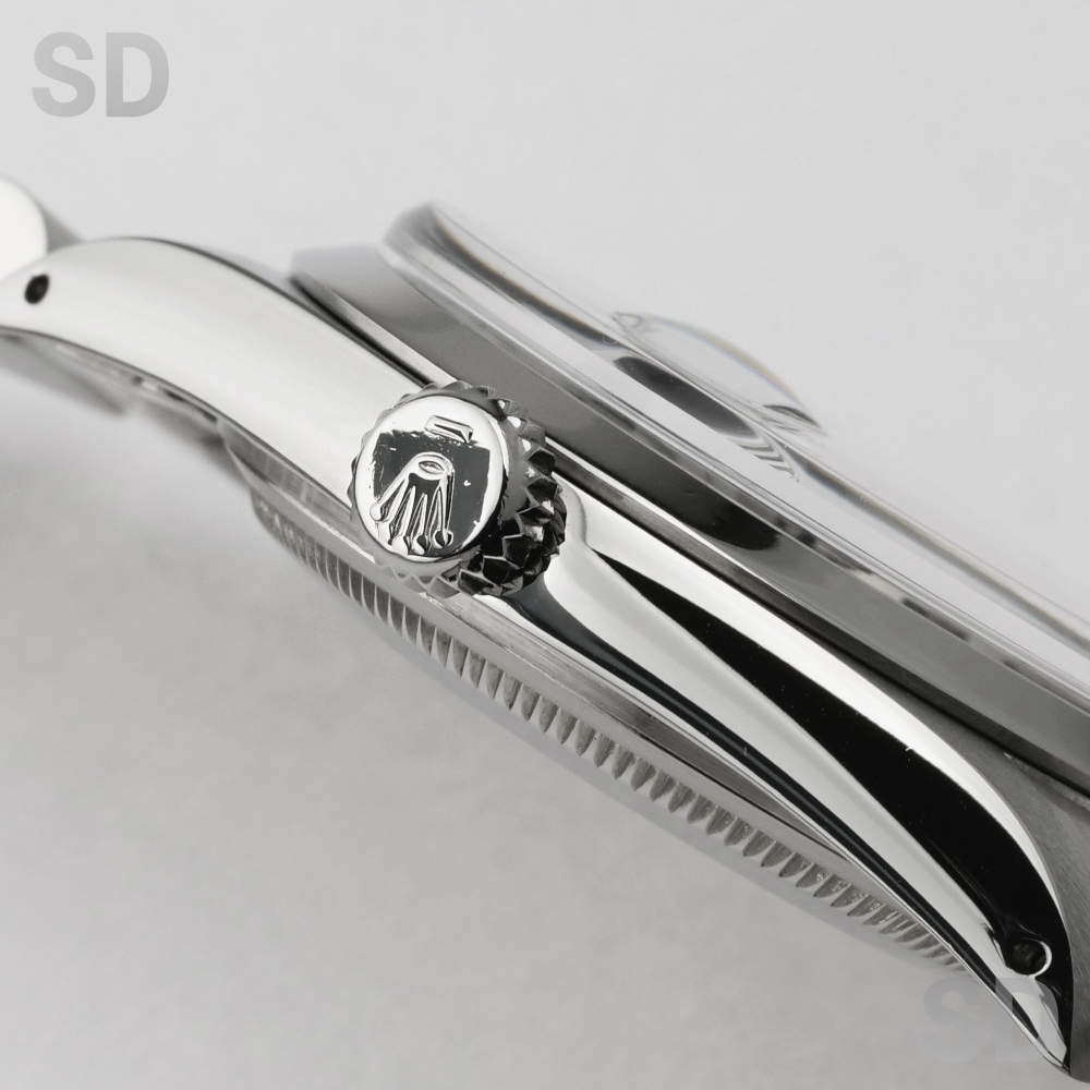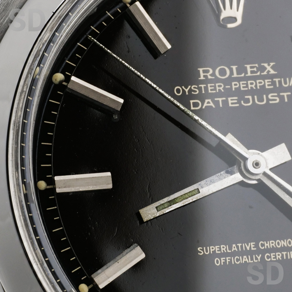 独特の艶と光沢があり、文字盤に書かれたロゴがゴールドにペイントされた雰囲気抜群なミラーダイヤル。こちらの個体はオリジナルのブラックが若干ブラウンに経年変色した「トロピカルダイヤル」です。エイジング感あふれる文字盤は圧倒的な存在感とヴィンテージ感を放ち、希少価値のあるモデルとしてヴィンテージファンの間で圧倒的な支持を受けております。