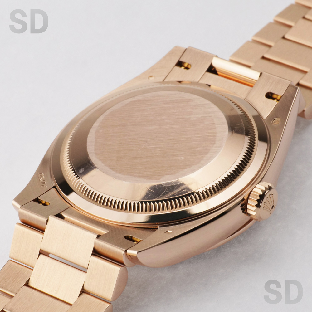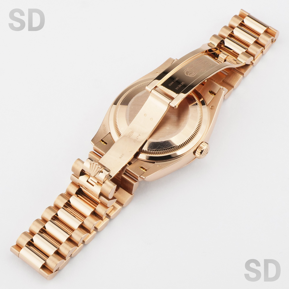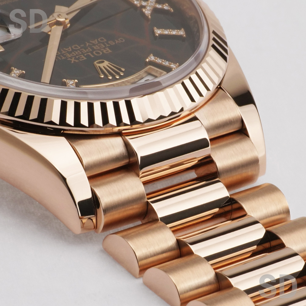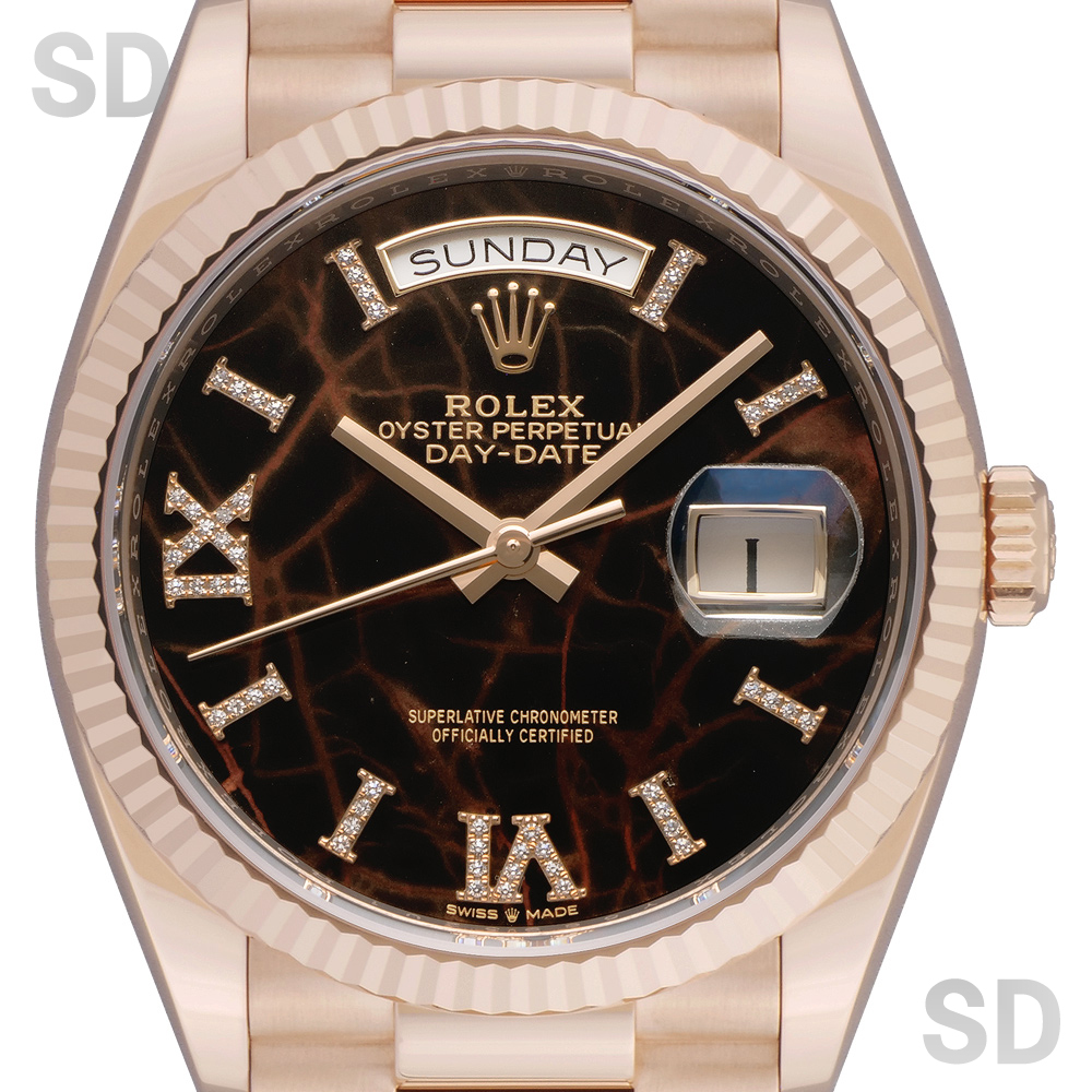 本モデルは、ケース径36mmのケースおよびブレスレットにエバーローズゴールドを用い、ロレックスを象徴するフルーテッドベゼルと、デイデイト専用のプレジデントブレスレットを備えたモデルです。また、濃褐色の装飾石であるアイゼンキーゼルを用いたダイアルを備え、18ctゴールド製アワーマーカーに32個、ローマ数字VIおよびIXに計24個のダイヤモンドを配した、華やかな仕様となっております。