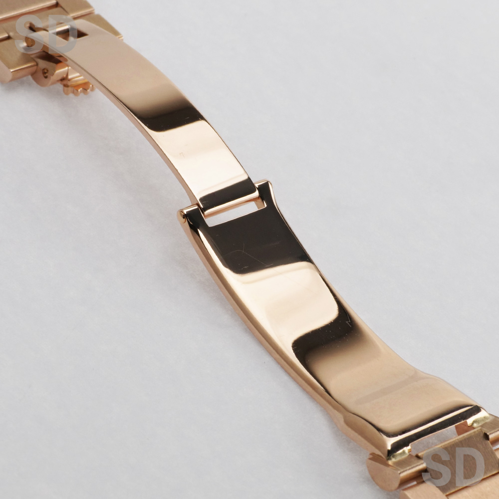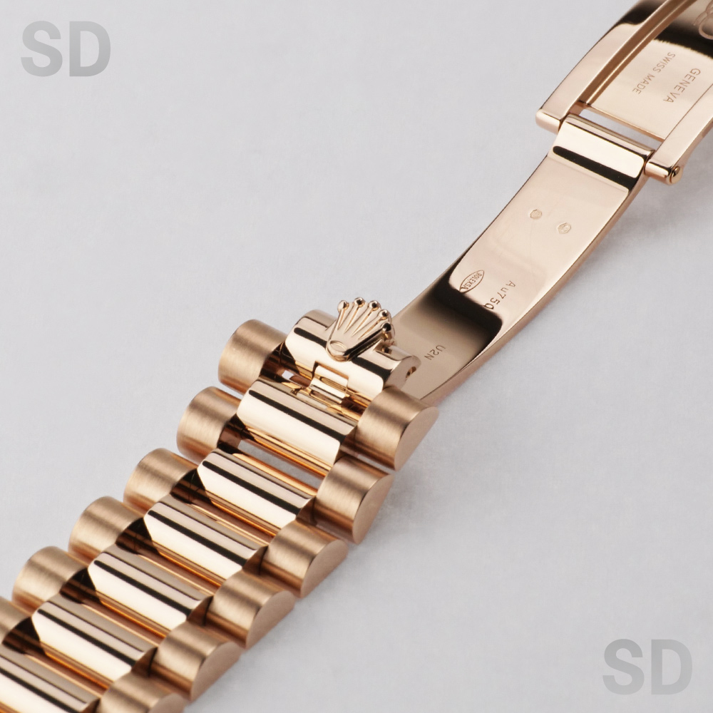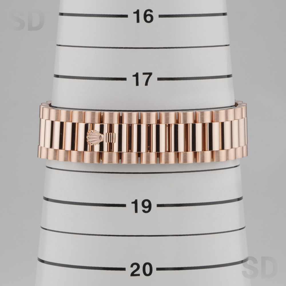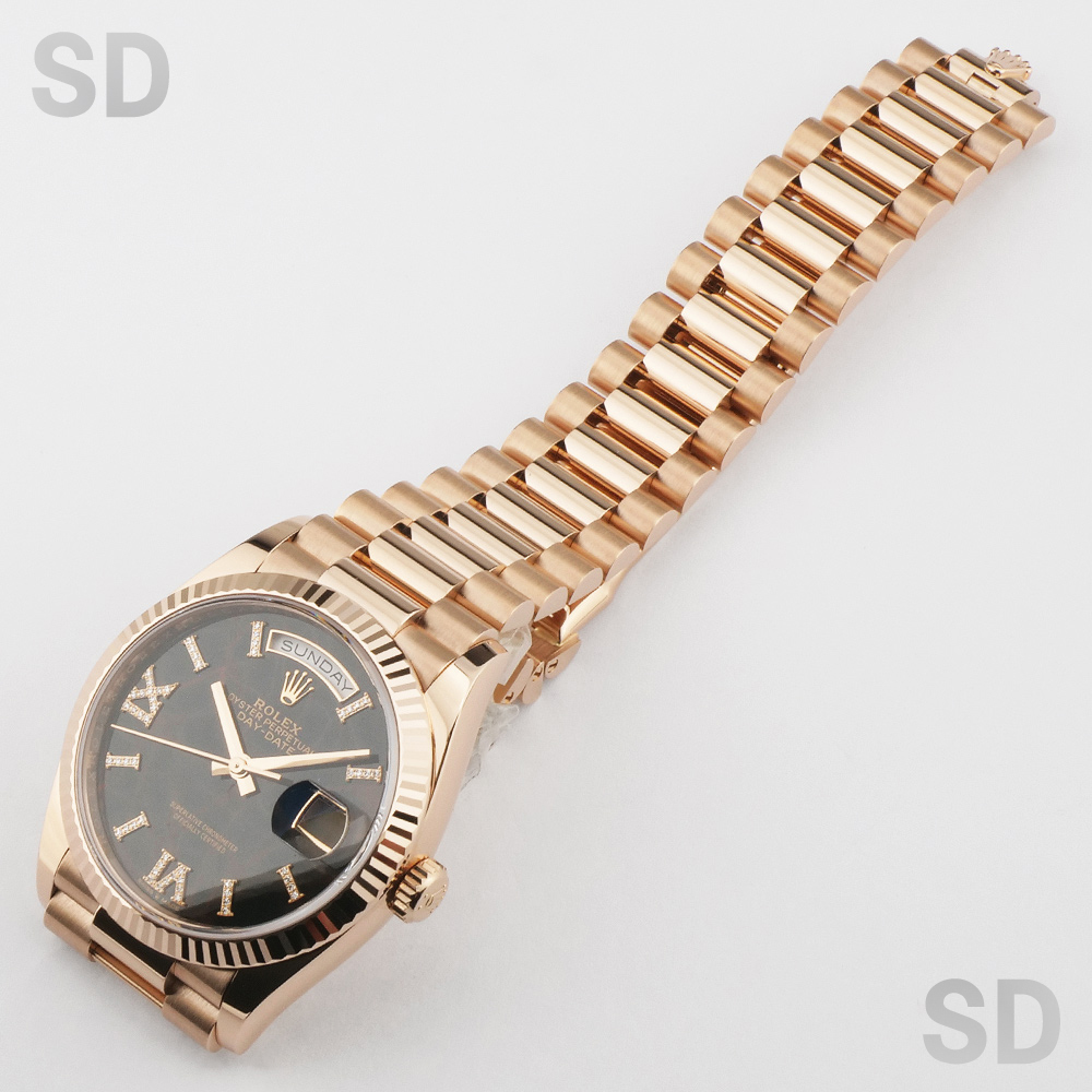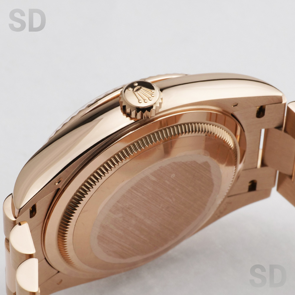 本モデルは、ケース径36mmのケースおよびブレスレットにエバーローズゴールドを用い、ロレックスを象徴するフルーテッドベゼルと、デイデイト専用のプレジデントブレスレットを備えたモデルです。また、濃褐色の装飾石であるアイゼンキーゼルを用いたダイアルを備え、18ctゴールド製アワーマーカーに32個、ローマ数字VIおよびIXに計24個のダイヤモンドを配した、華やかな仕様となっております。