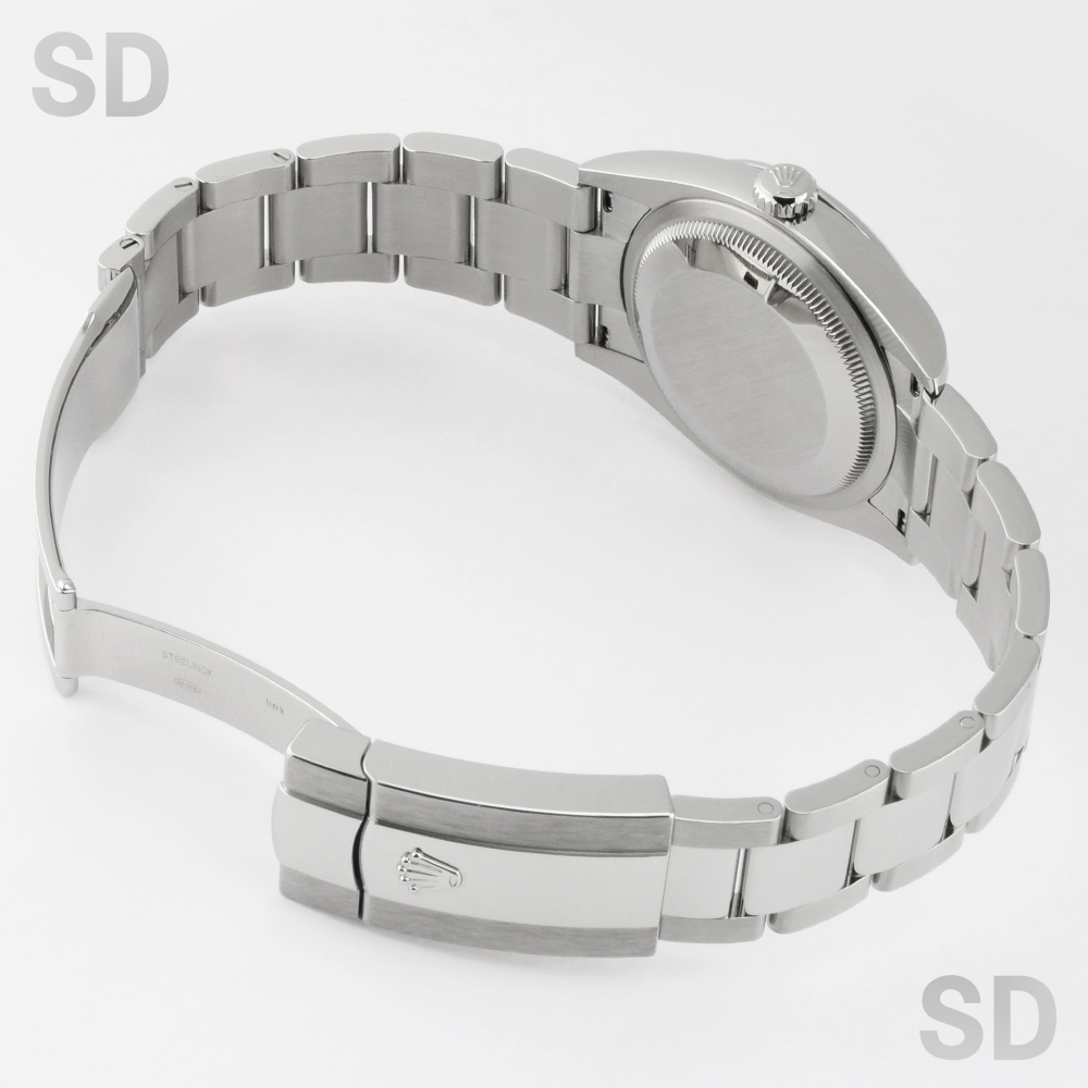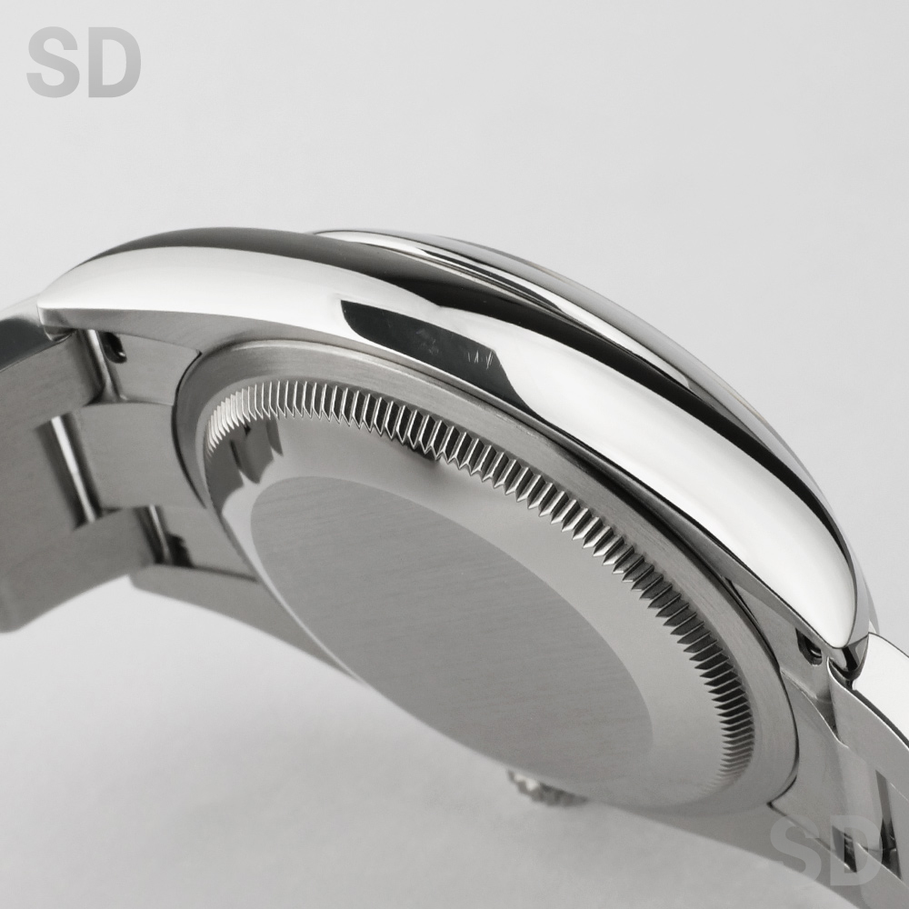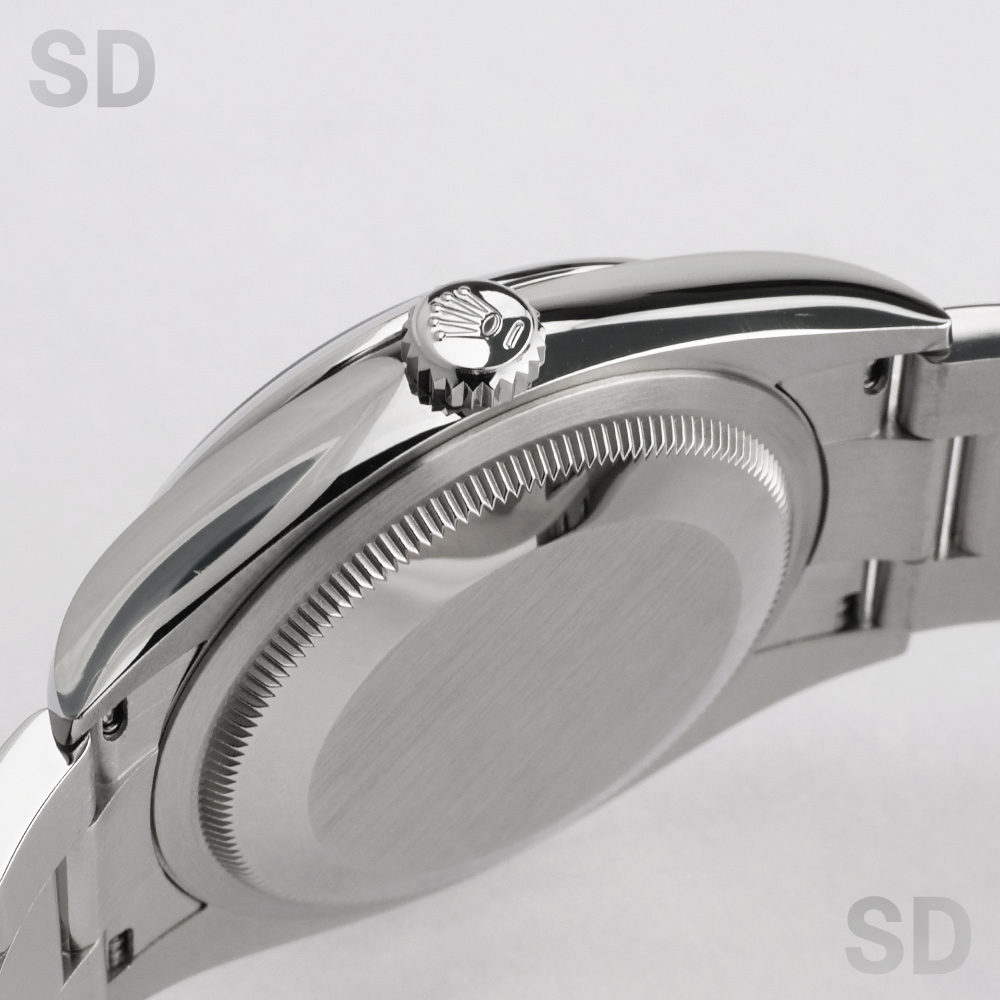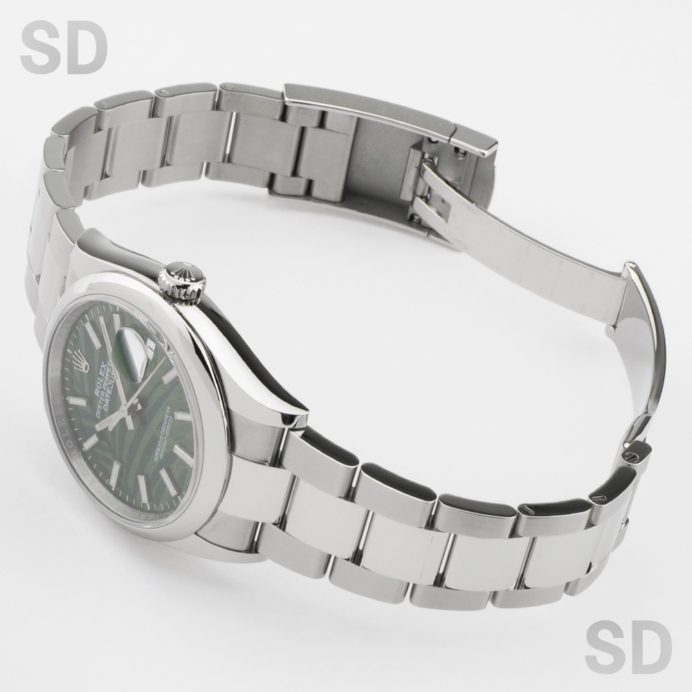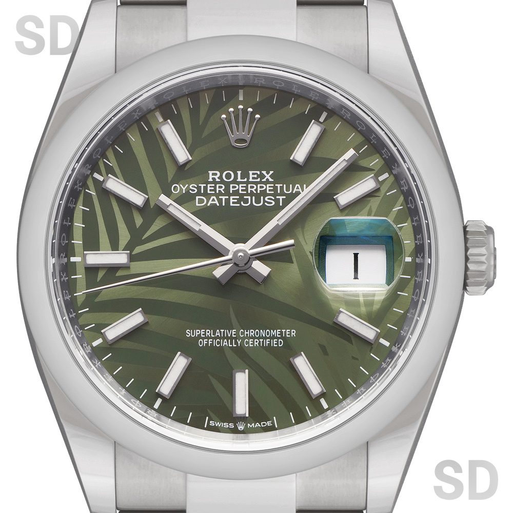 こちらのモデルは長時間パワーリザーブの新ムーブメントCal.3235を搭載の現行モデル。定番となる36mmケースは古くから腕の馴染みが良いサイズ感として人気です。また、今回セットされている文字盤は2021年から2024年のたった3年間のみ製造されたパームモチーフダイヤルとなります。パーム=ヤシの葉モチーフは表面にレーザーにて彫り込まれており、腕に着用した際に青々と生い茂るヤシの葉を堪能いただけます。オールステンレスモデルのシンプルなイメージを覆す美しい1本です。