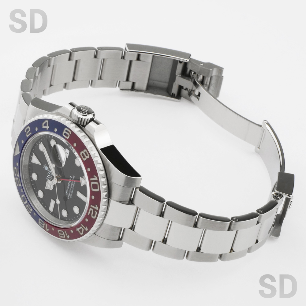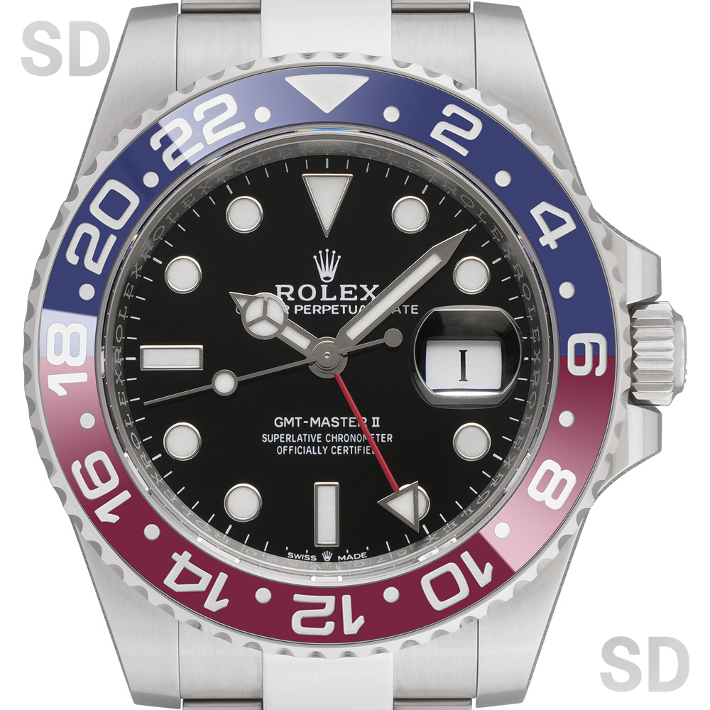 本モデルは、2つの時間帯を同時に確認できるGMT機能を備えたロレックスの人気スポーツモデルです。赤と青のツートンカラーのセラクロムベゼルが特徴で、その配色から通称「ペプシ」とも呼ばれています。ムーブメントには自社製Cal.3285を搭載し、約70時間のパワーリザーブと高い精度を実現。さらに、GMT針と24時間ベゼルを組み合わせることで、異なるタイムゾーンを直感的に把握できる実用性の高いモデルです。また、ブレスレットはスポーツモデル本来の力強さを際立たせるオイスターを装備。シンプルで堅牢な構造により、実用性と耐久性に優れた仕様となっております。