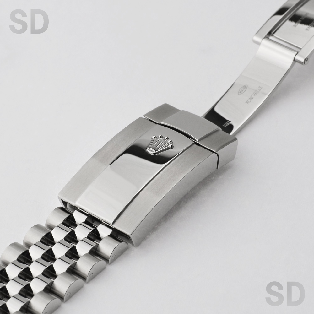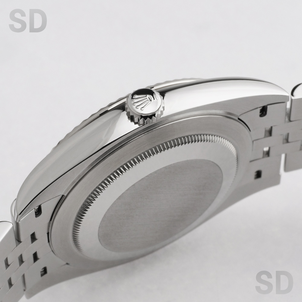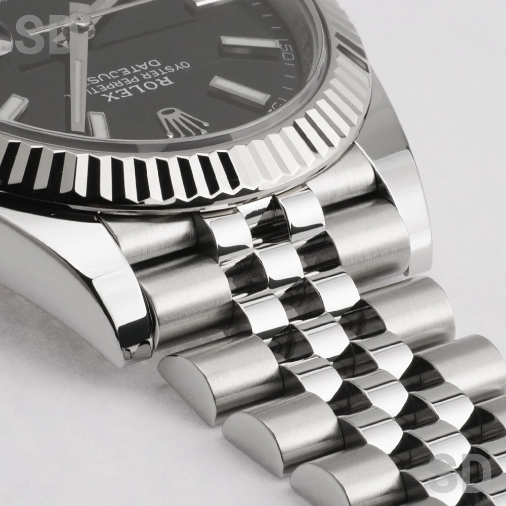 本モデルは、ホワイトゴールド製のフルーテッドベゼルとステンレススチールによるロレゾール(コンビ)仕様に、ブランドを象徴するジュビリーブレスレットを採用。文字盤にはサンレイ仕上げが施されたブライトブラックダイアルを備え、上品な光沢と深みのある表情が、全体の洗練された印象を一層引き立てます。BR>